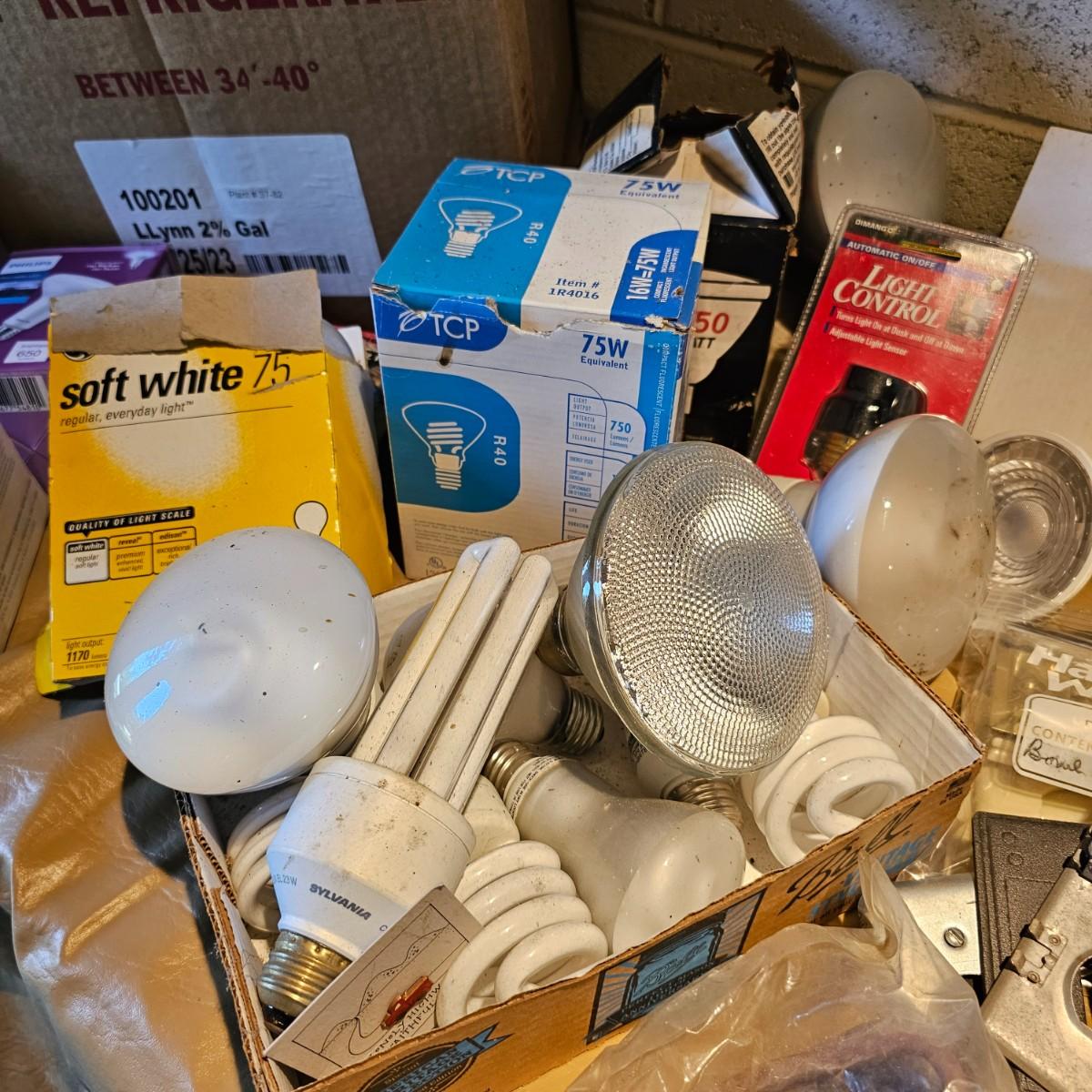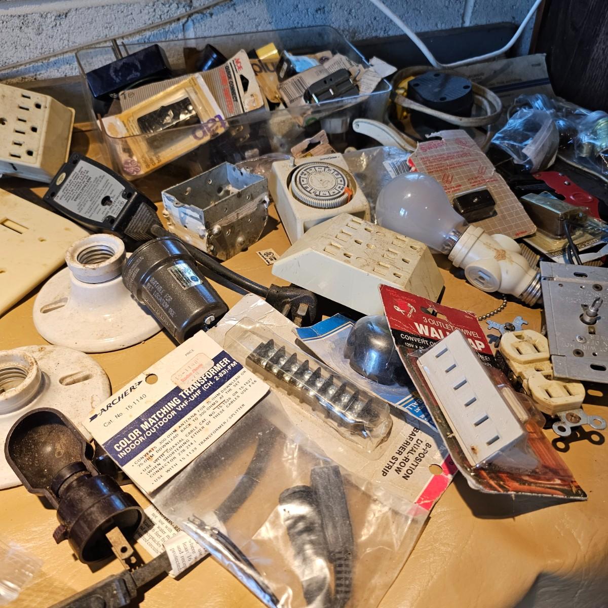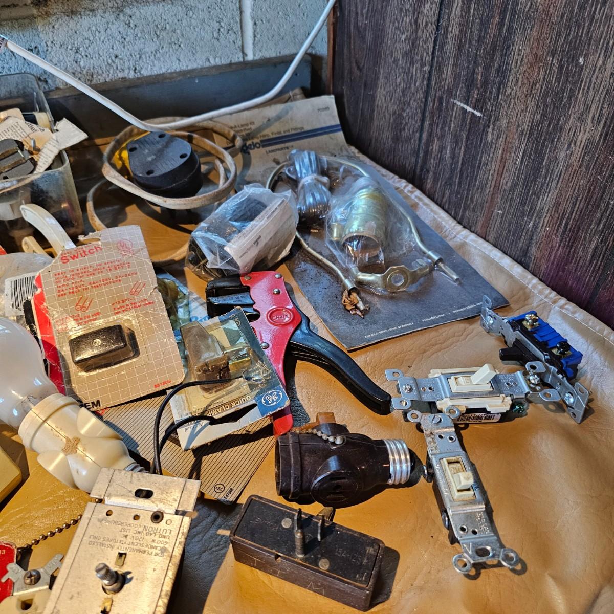 Switches, outlets, boxes, outlet & switchplate covers. Timers, pull chain for light, various types of light bulbs, spots, floods, CFL, more. Bulbs not tested. See photos for details.