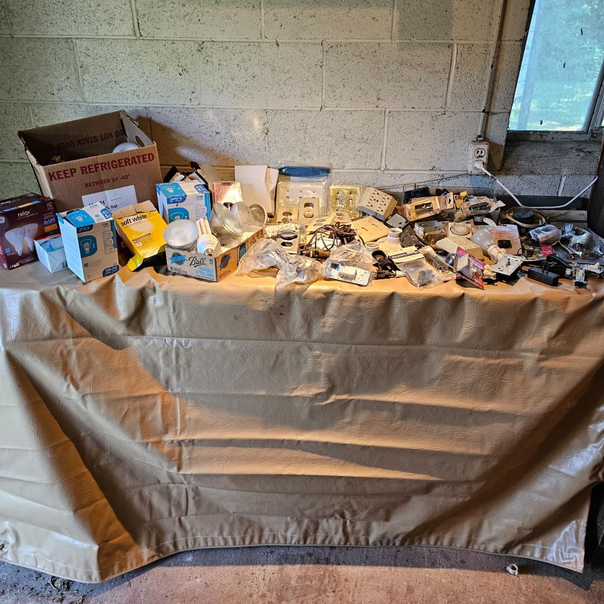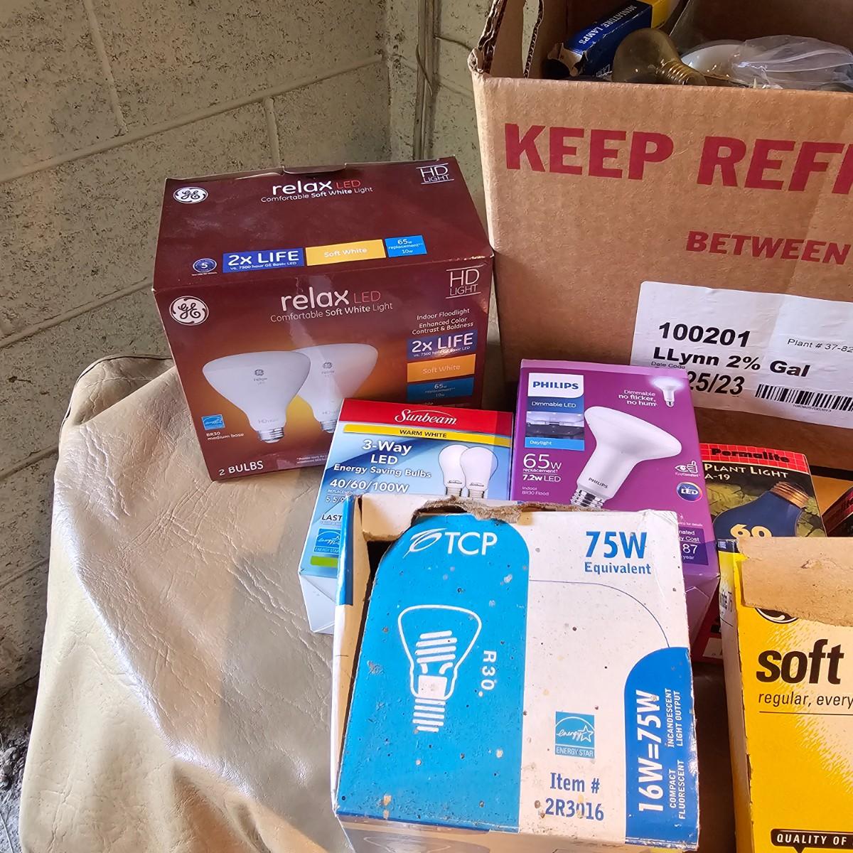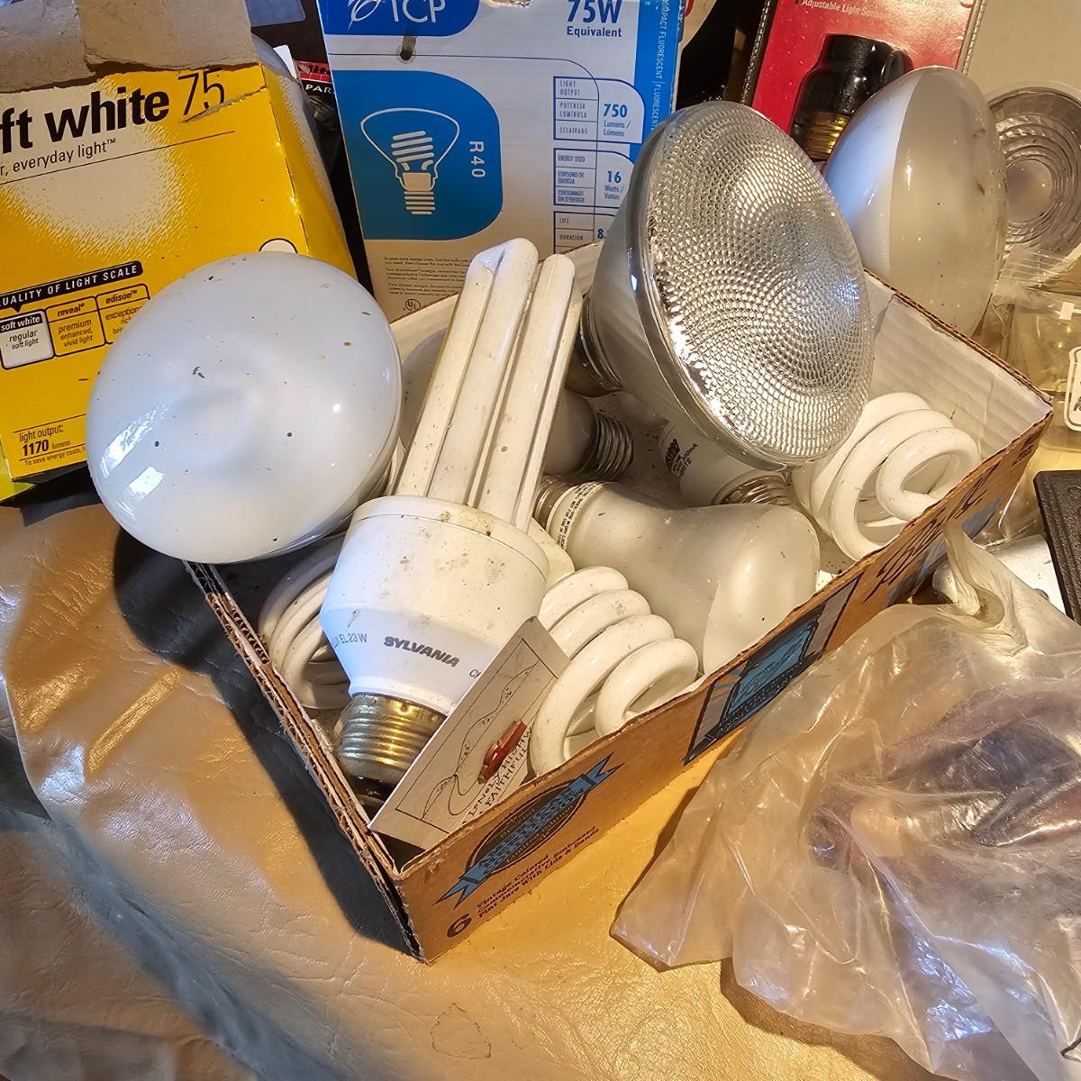 Switches, outlets, boxes, outlet & switchplate covers. Timers, pull chain for light, various types of light bulbs, spots, floods, CFL, more. Bulbs not tested. See photos for details.