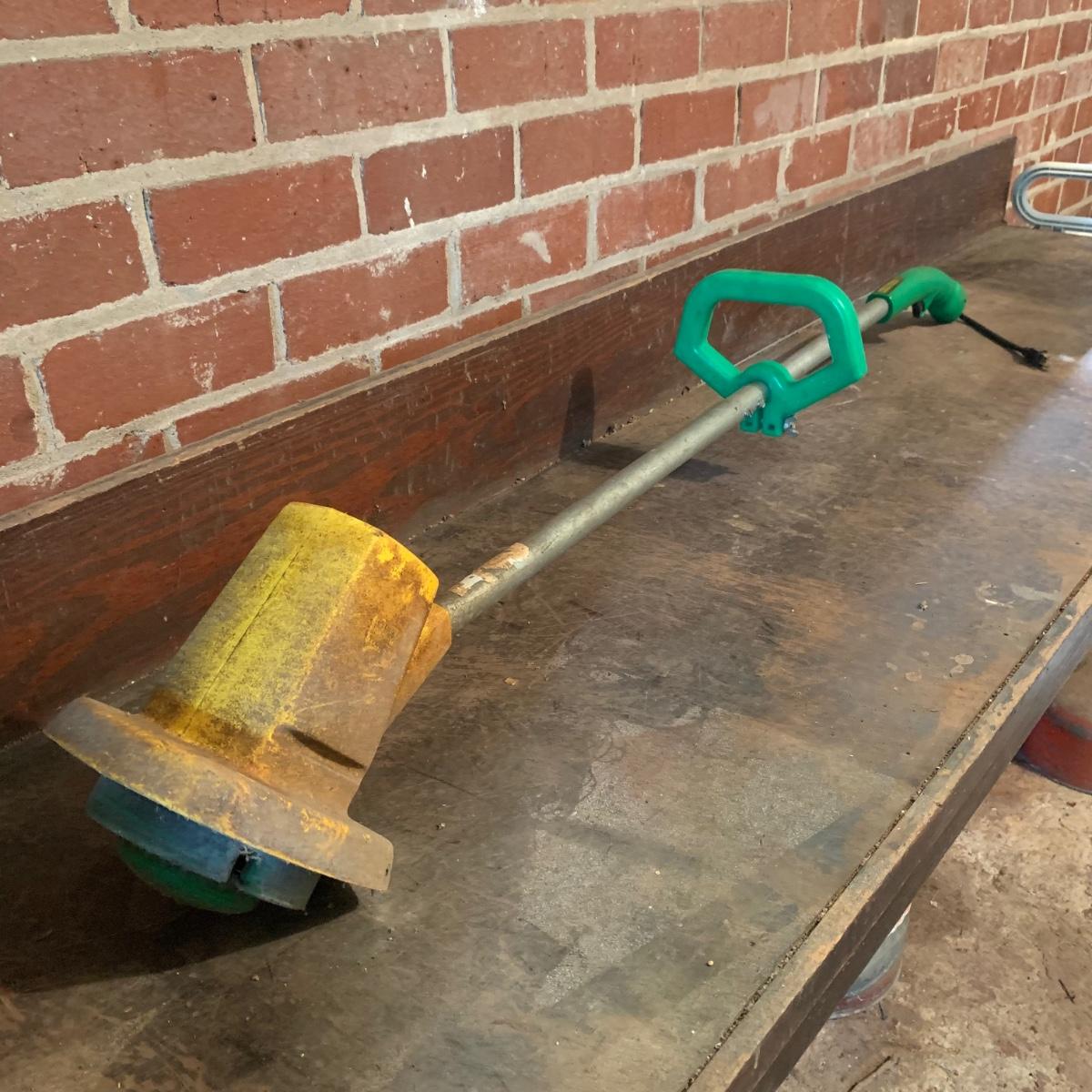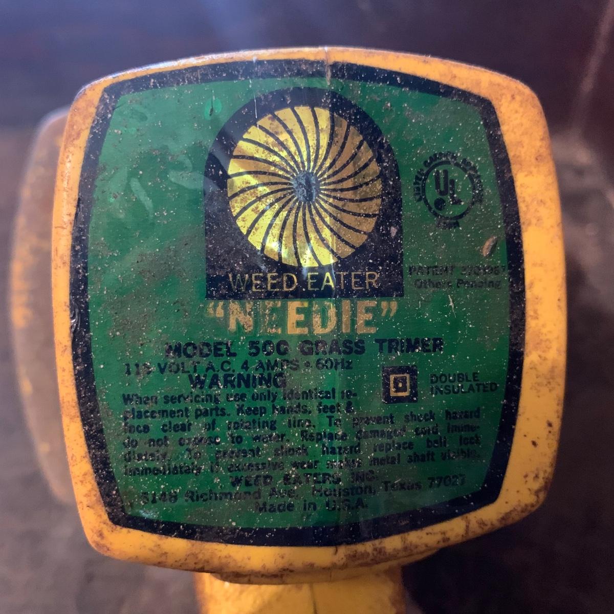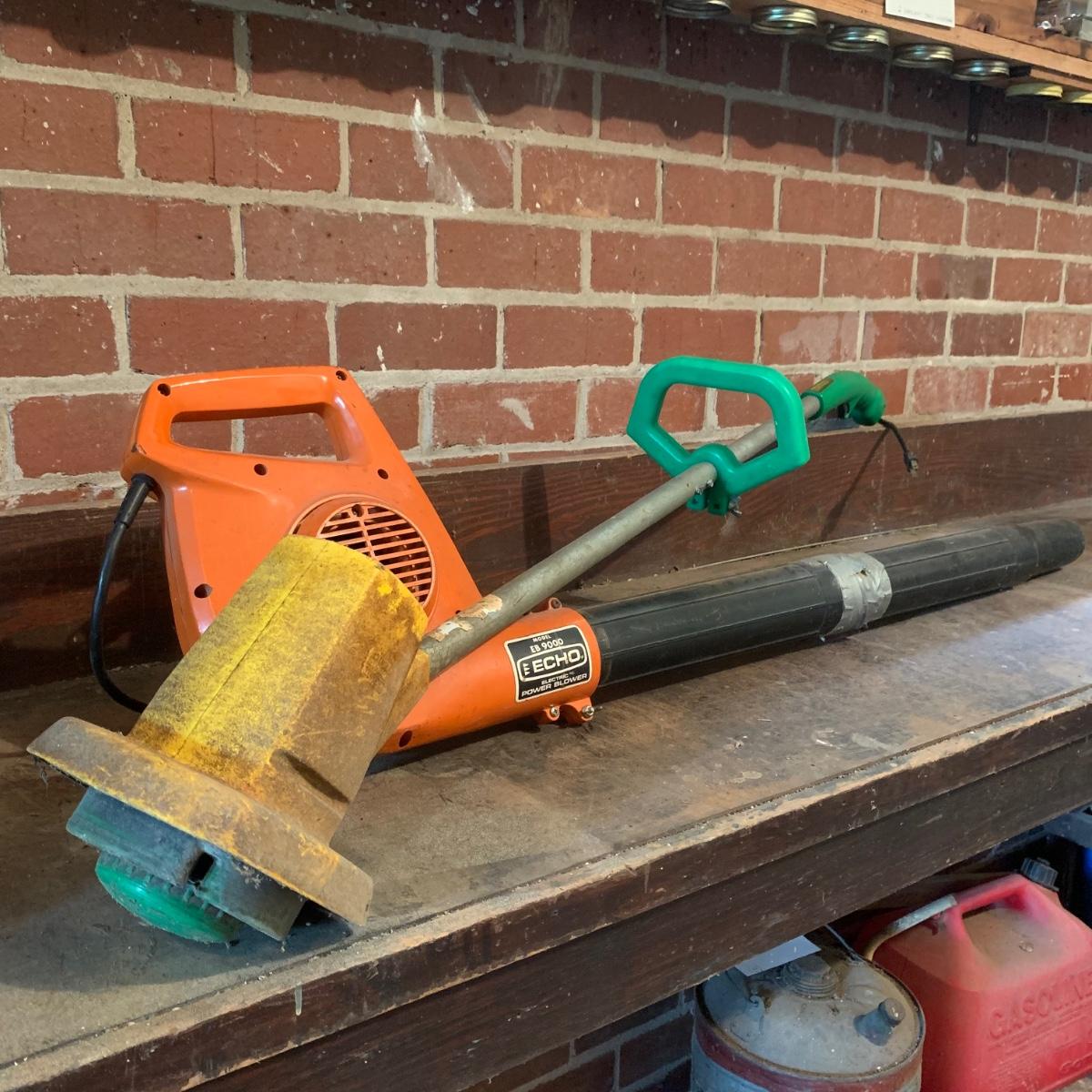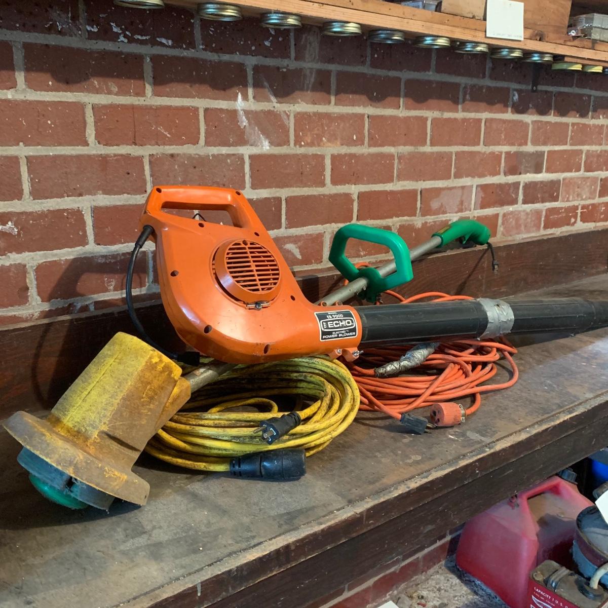 Echo Electric Power Blower, Model EB 9000. Energy efficient with a permanent magnet motor. Has duct tape around mid-section of tube. Blower has a low and high setting, and a short power cord. Weed Eater “Needie” Model 500 Grass Trimmer, with a short power cord and a finger trigger. Lot includes two long extension cords. All items are a bit dirty from being stored in the garage. All items functioned when tested. Local pickup only.