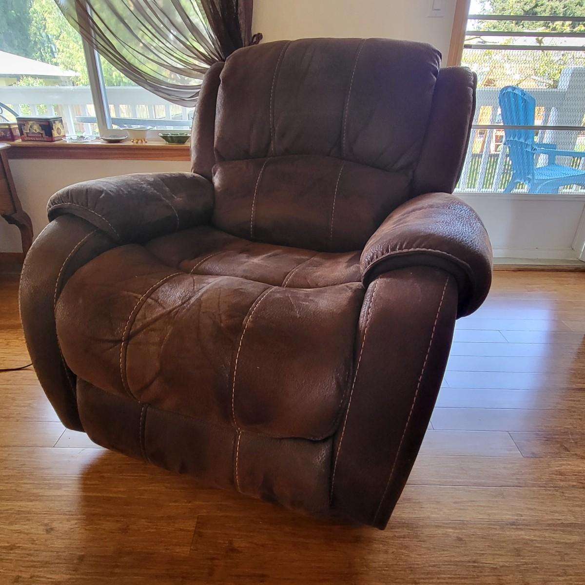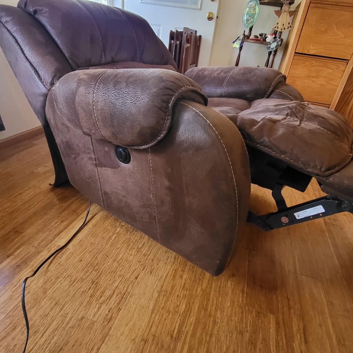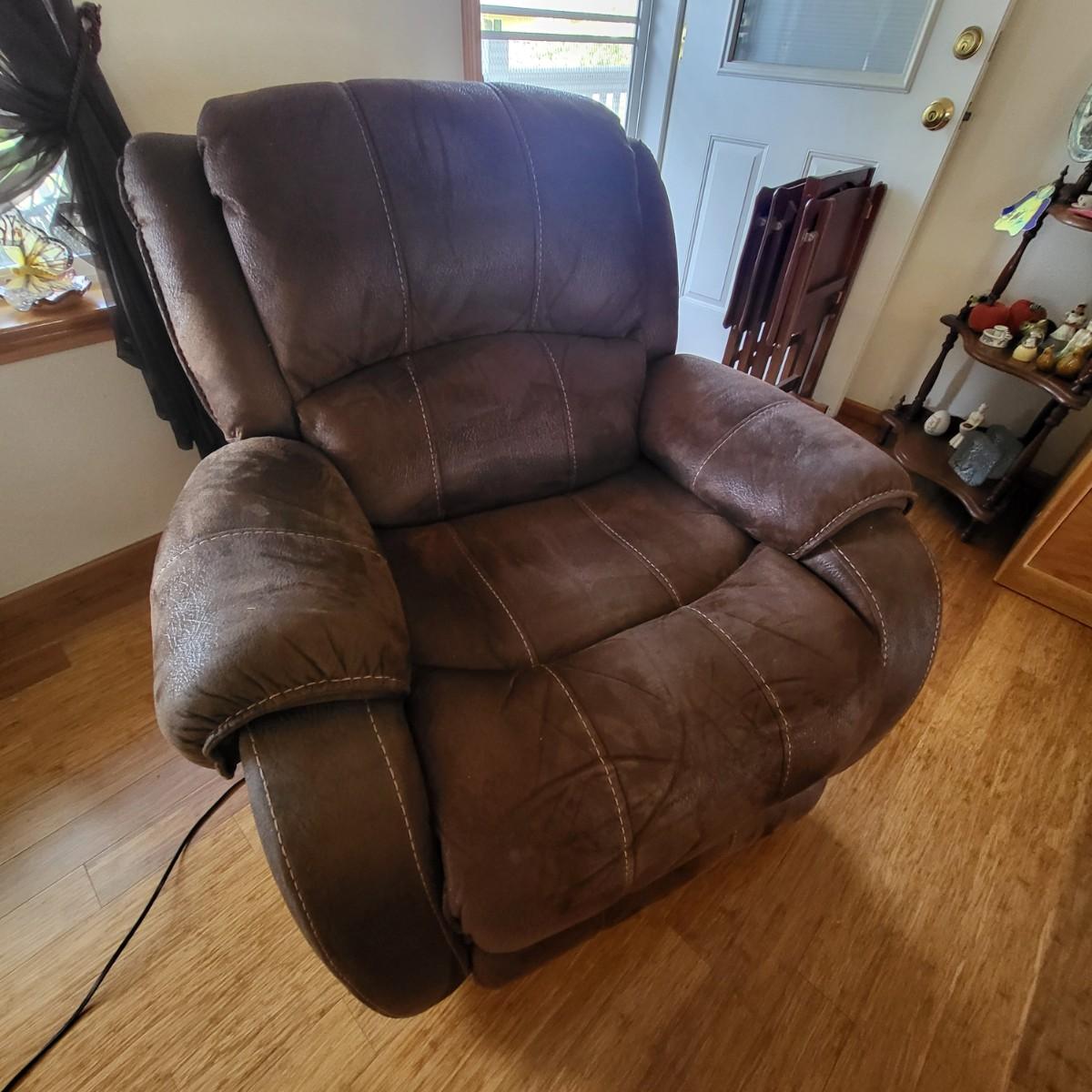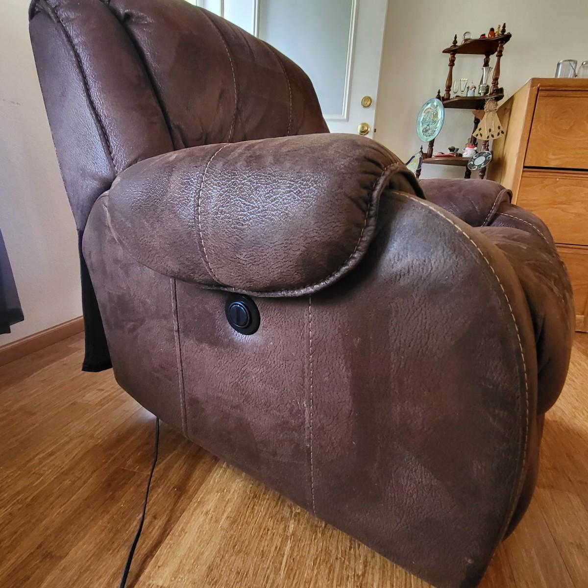 Electric, brown microfiber fabric recliner chair. Simple side button function. When fully reclined, it is 68" long and is 40" long with regular upright seated position. From arm cushion to arm cushion, it measures 41" wide and 38" tall from the back. Seat cushion is a generous 22". Super comfortable, easy to clean fabric and works great!