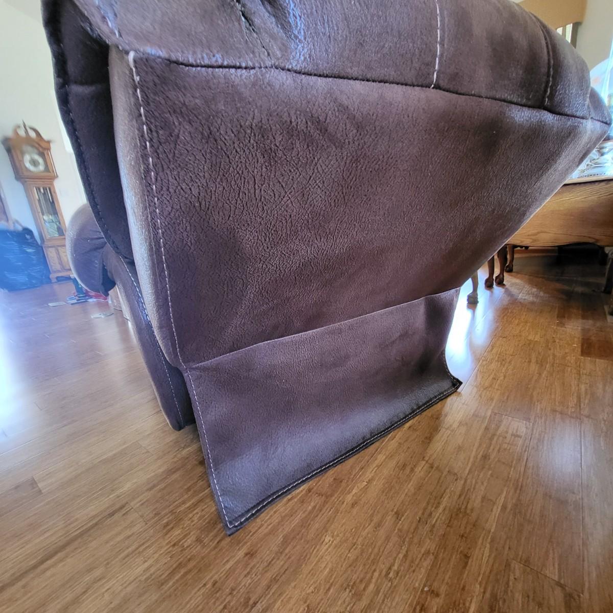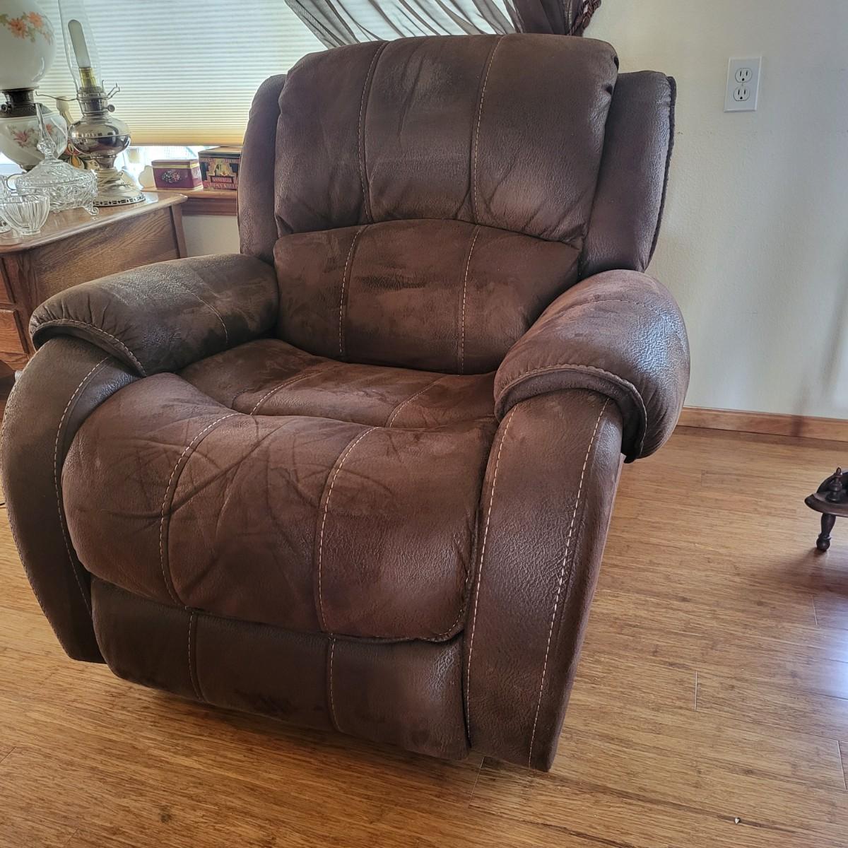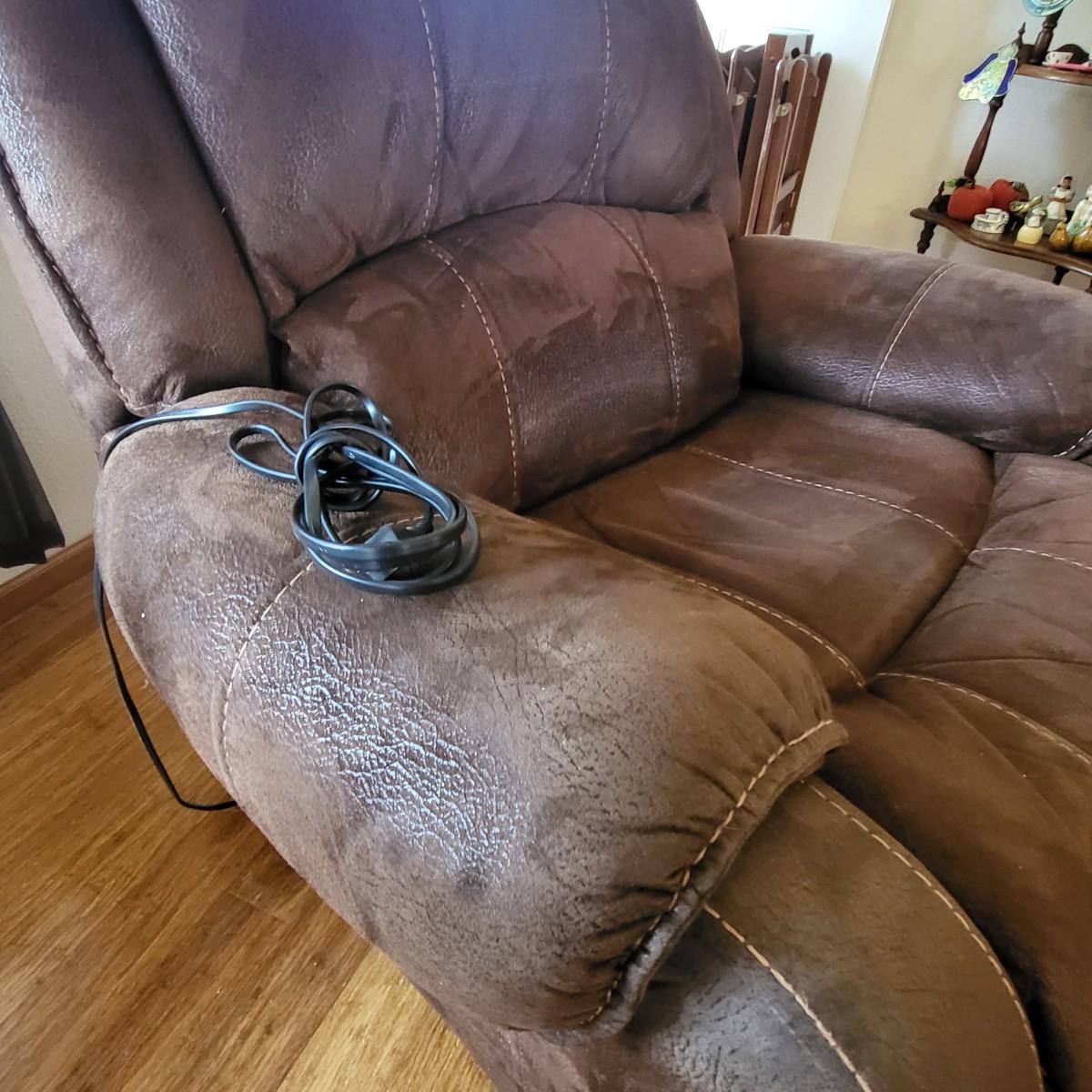 Electric, brown microfiber fabric recliner chair. Simple side button function. When fully reclined, it is 68" long and is 40" long with regular upright seated position. From arm cushion to arm cushion, it measures 41" wide and 38" tall from the back. Seat cushion is a generous 22". Super comfortable, easy to clean fabric and works great!