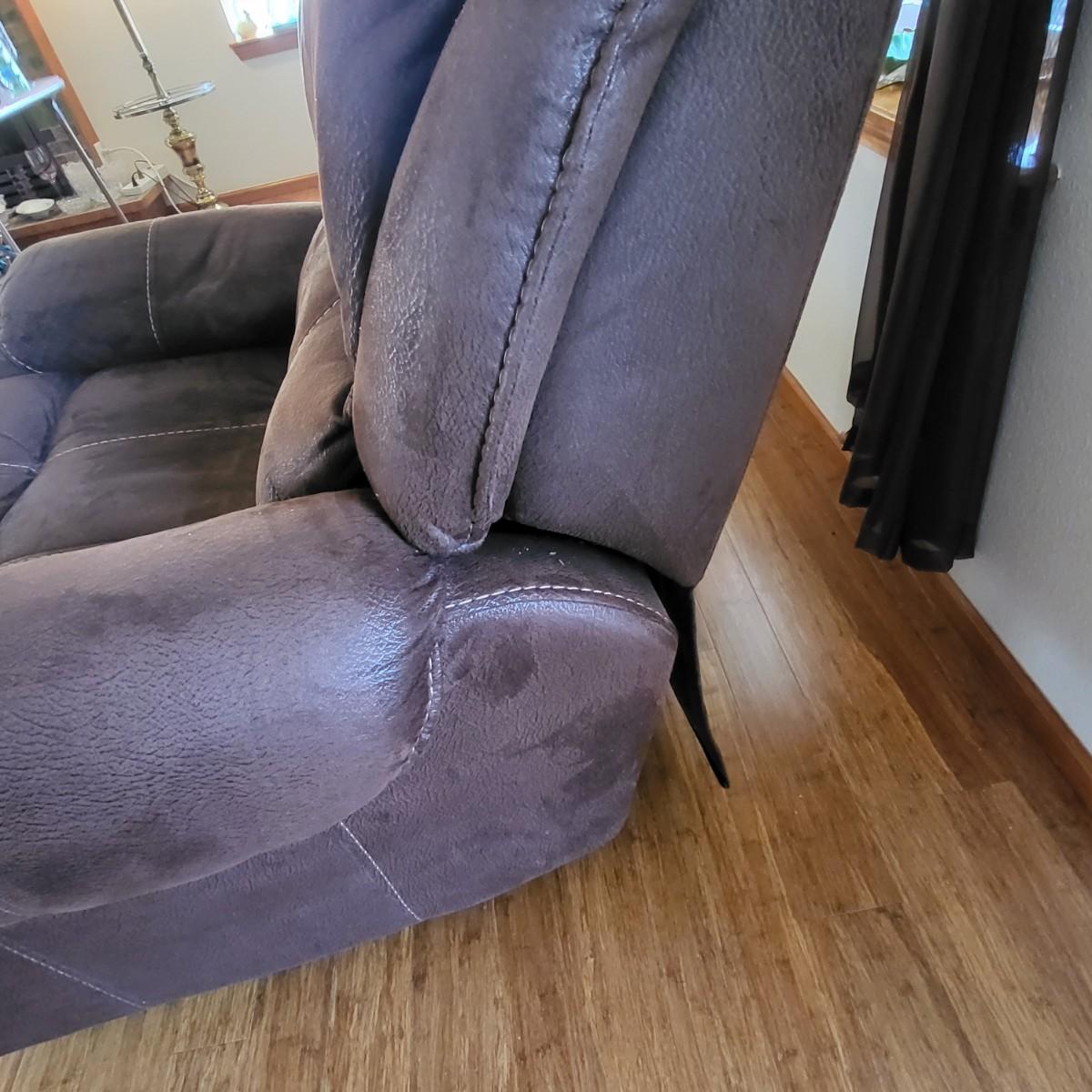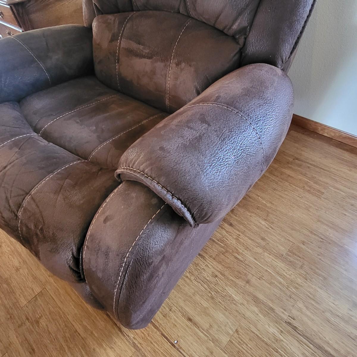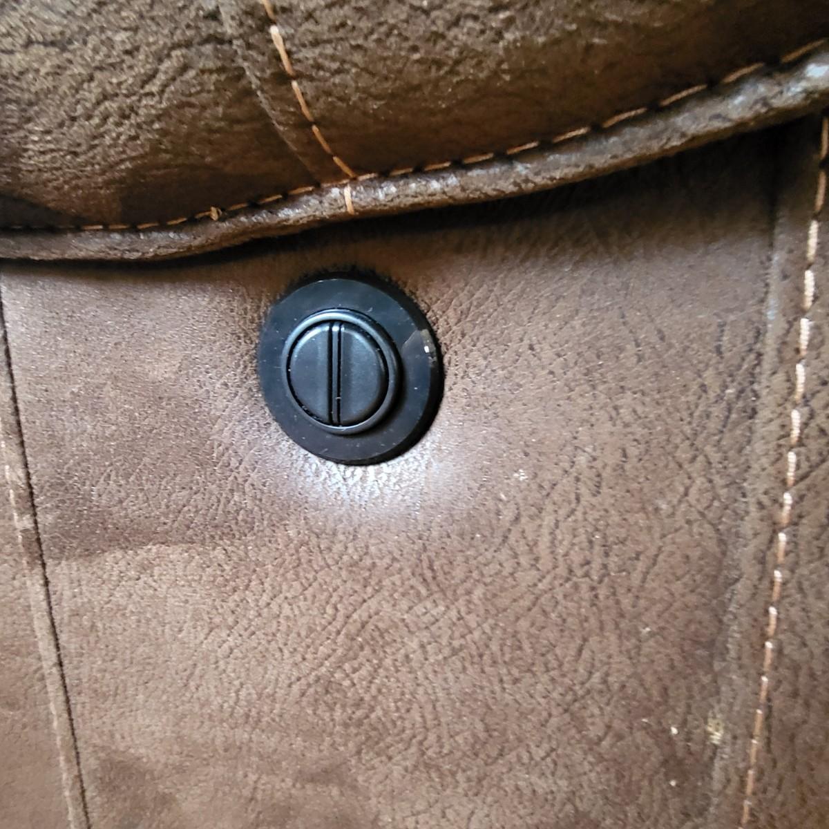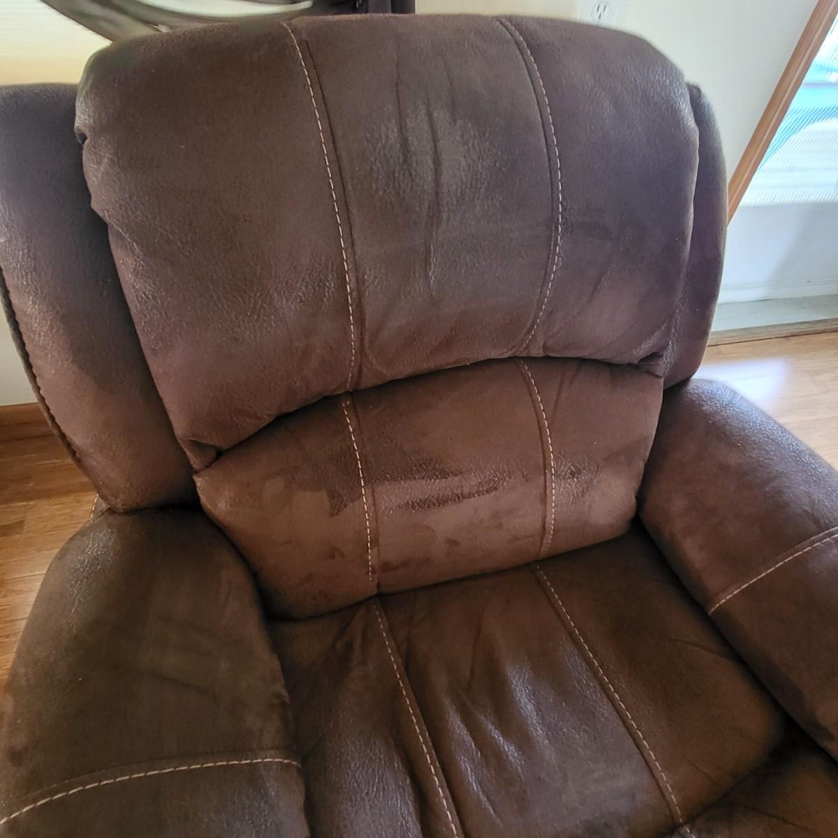 Electric, brown microfiber fabric recliner chair. Simple side button function. When fully reclined, it is 68" long and is 40" long with regular upright seated position. From arm cushion to arm cushion, it measures 41" wide and 38" tall from the back. Seat cushion is a generous 22". Super comfortable, easy to clean fabric and works great!
