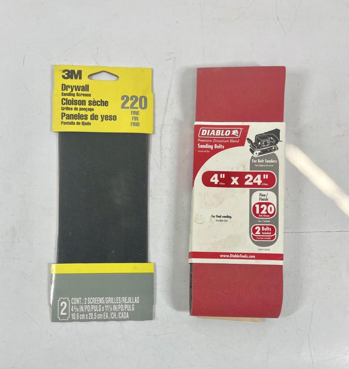 Lot of sander supplies: (2) 4” x 20” Diablo sanding belts and (2 z” x z” sanding pads. New in packages. See photos for additional details.
