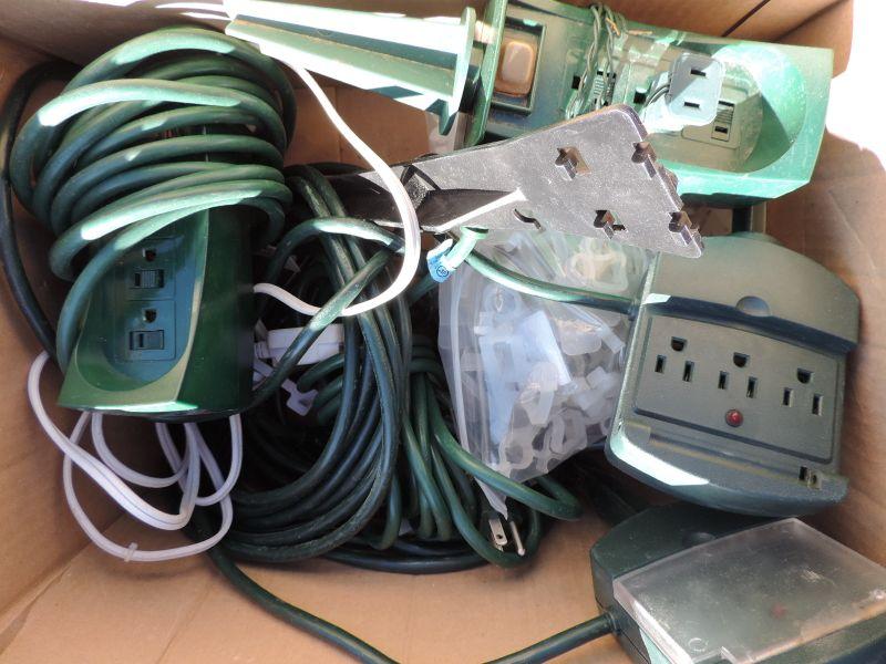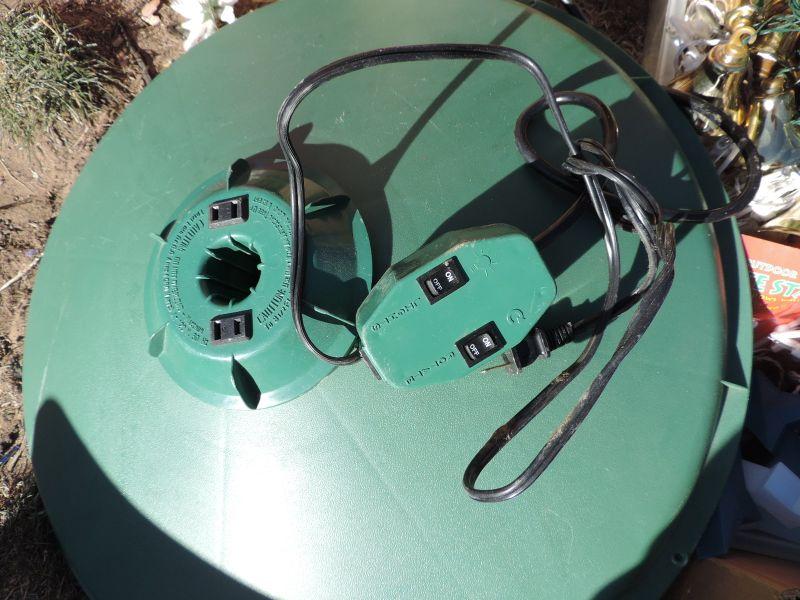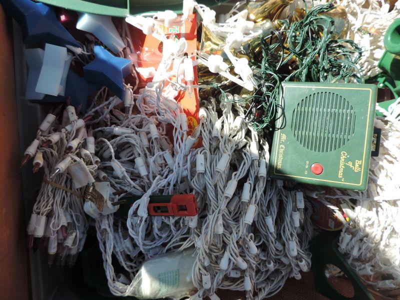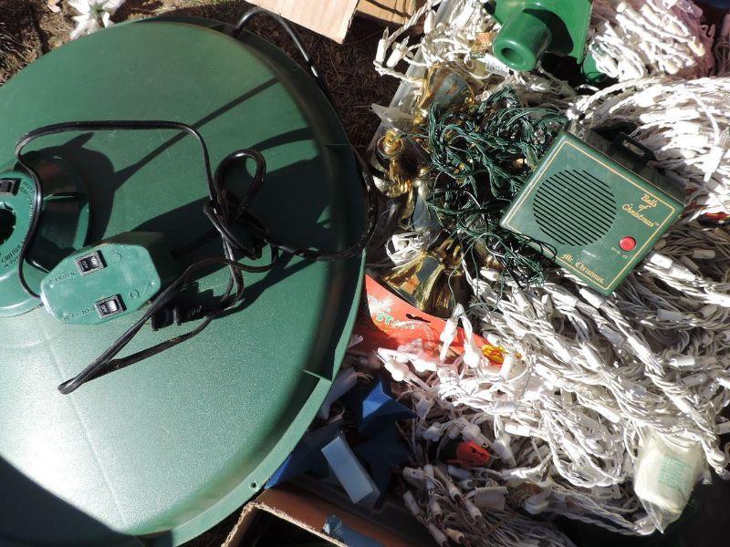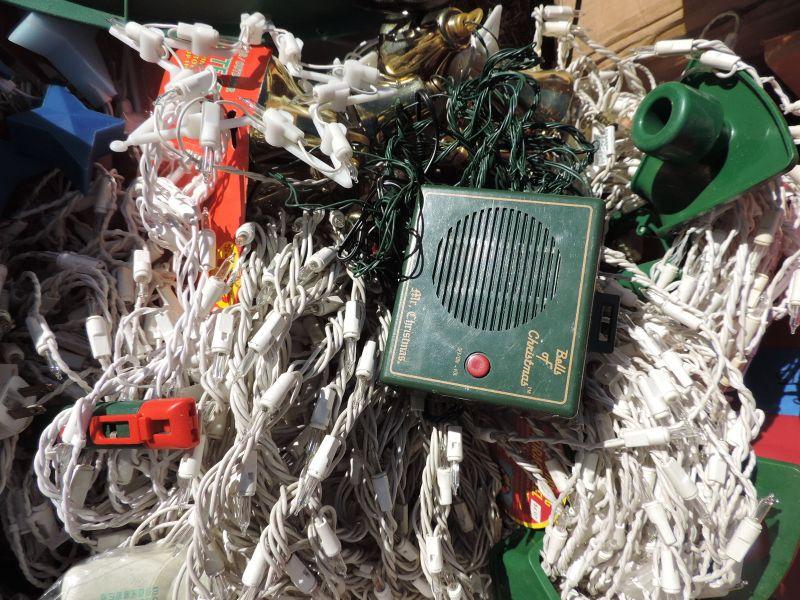 STAND WITH OUTLET BUILTIN TO PLUG LIGHTS IN TO, MANY STRANDS OF LIGHTS, SOME WITH STARS AND STRAND OF BELLS THAT PLAYS MUSIC, YARD ELECTRIC CORD PLUGINS