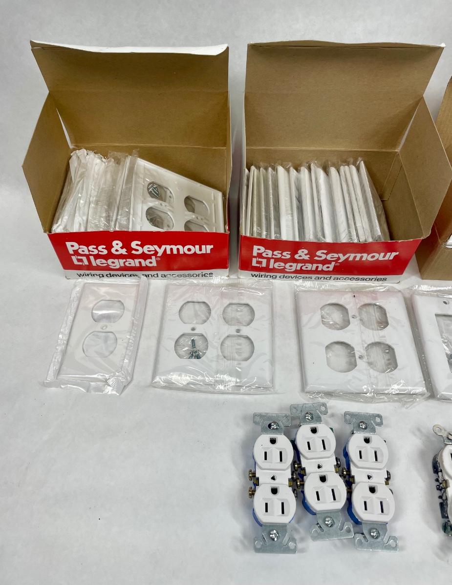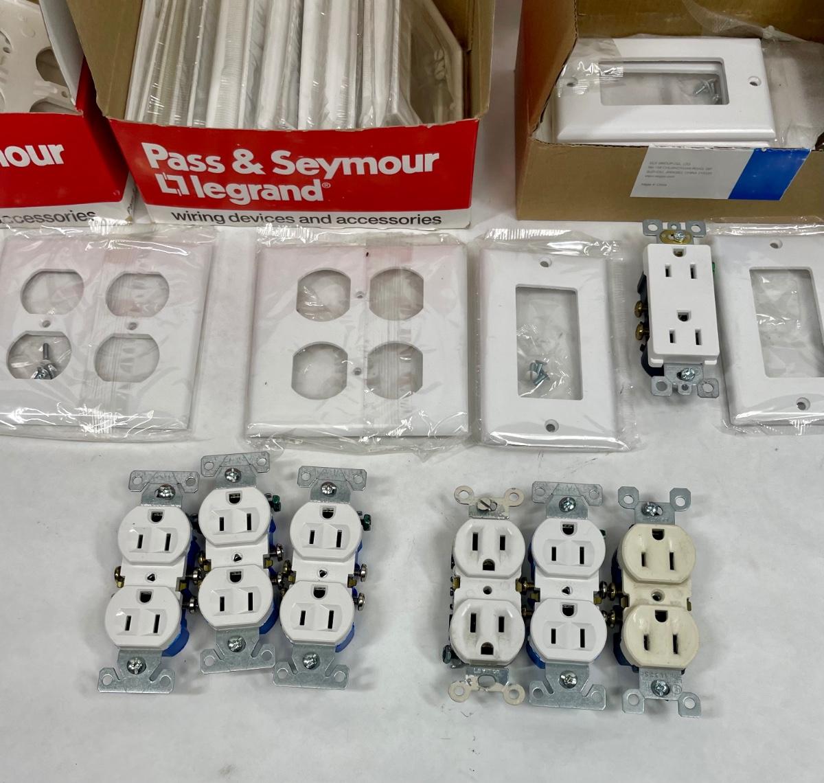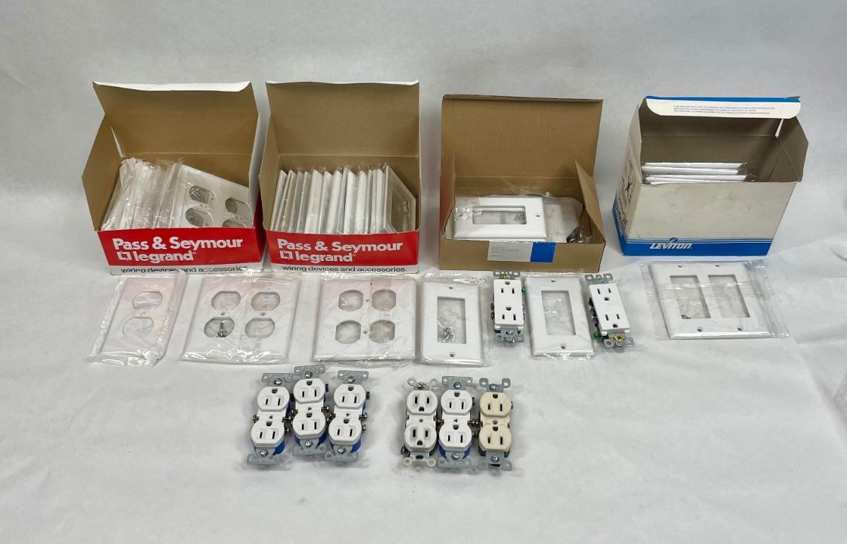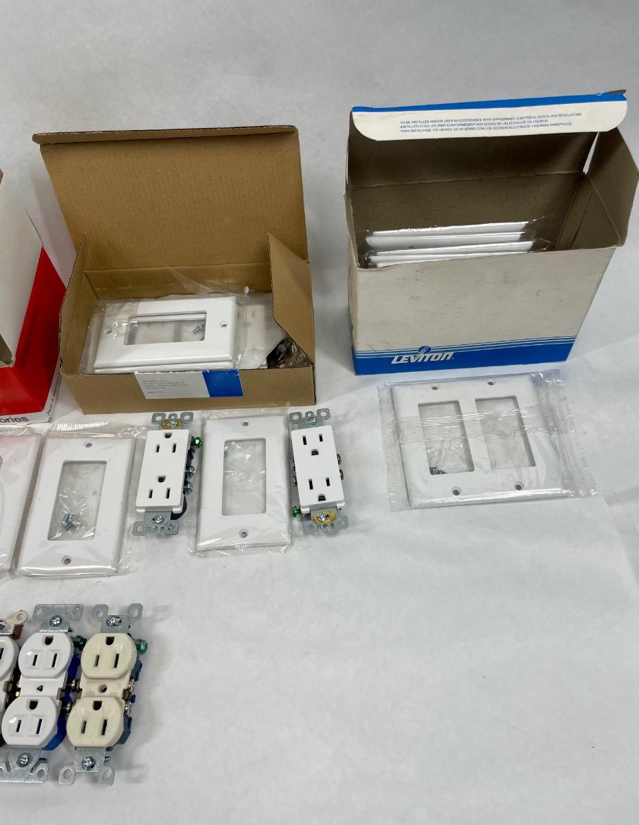 Lot includes standard shape and rectangular shape grounded (3-prong) outlets and many different types of cover plates. Most all are white, there may be a few almond or off-whiter items mixed in. Most appear to be new, never installed.