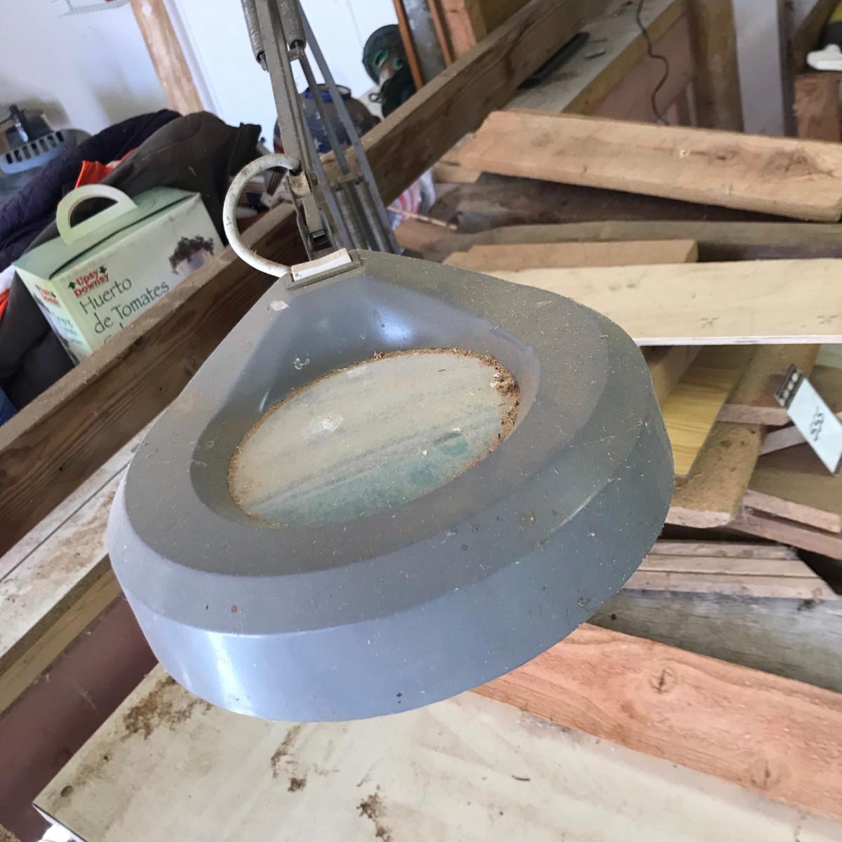 Electrified work stand w/ magnifying lamp + wood scrap.