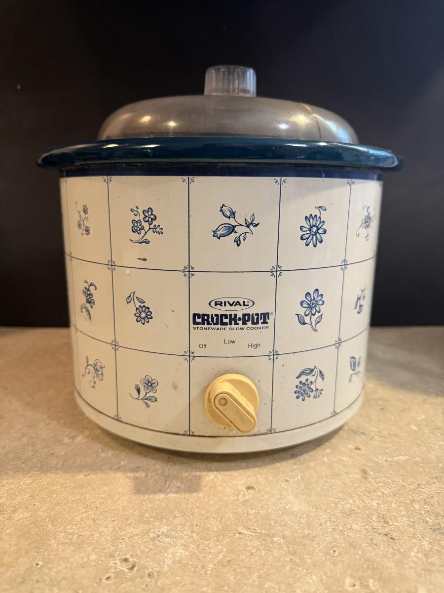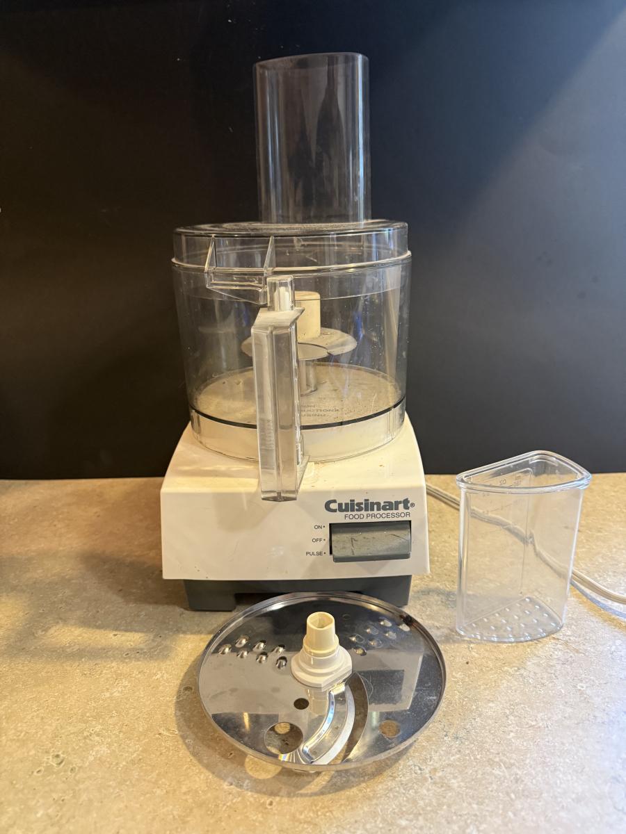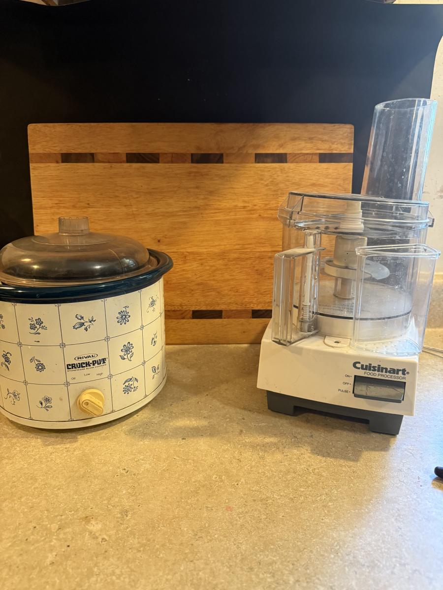 Crockpot, food processor and wooden cutting board