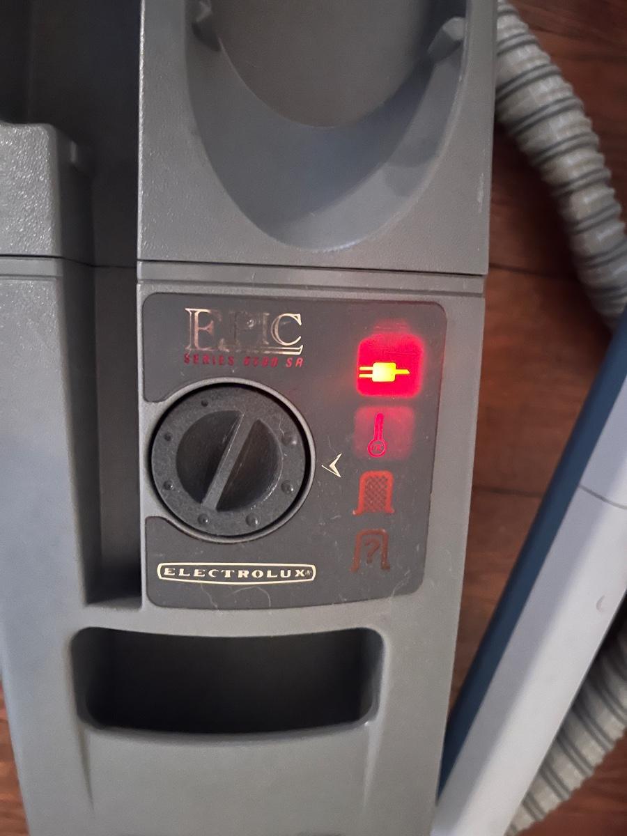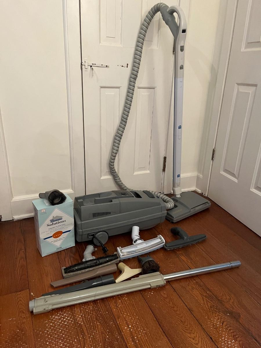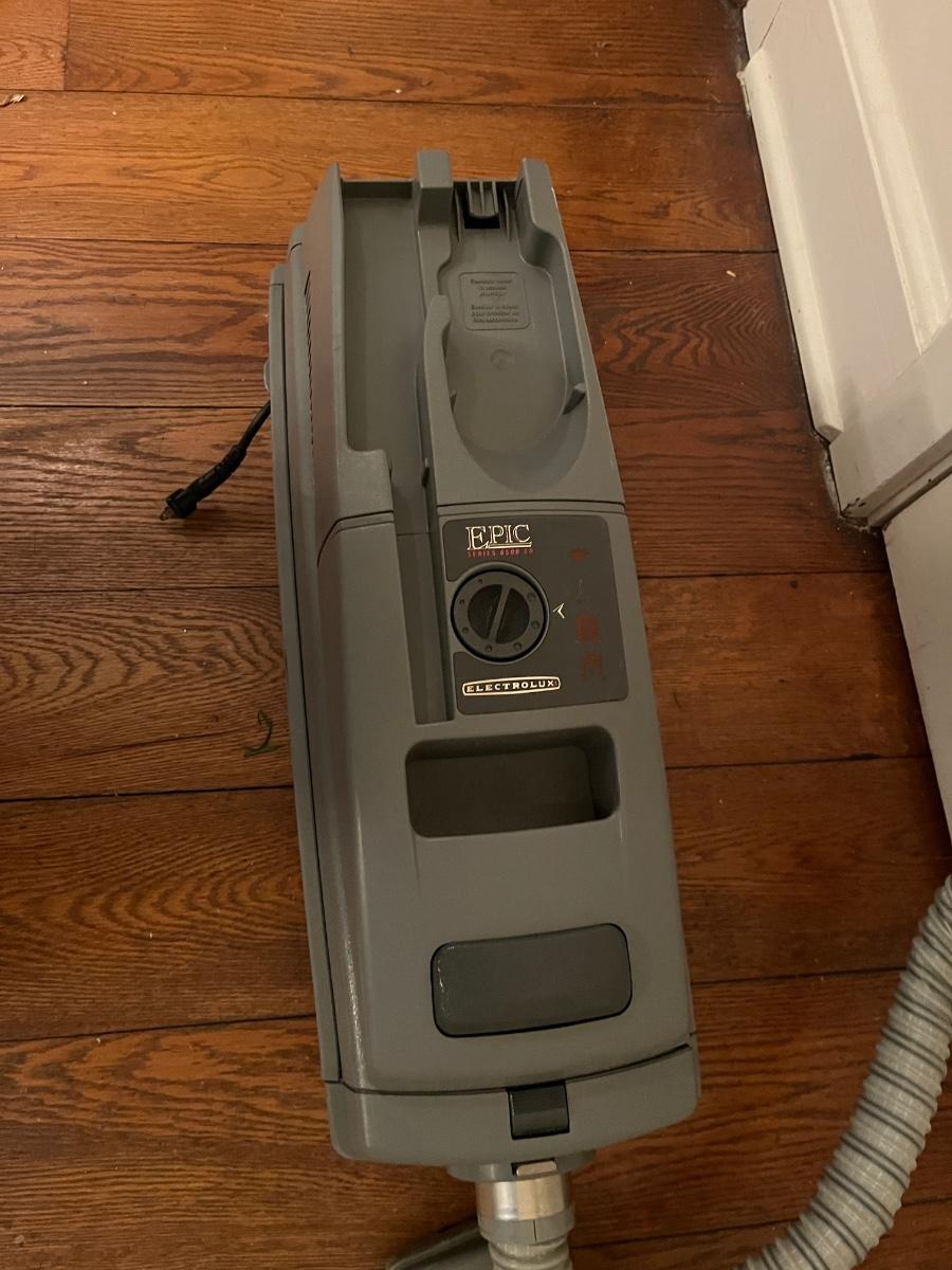 Lot includes a Electrolux canister vacuum with attachments and extra bags. Vacuum powered on when plugged in. Tape is currently helping the back panel stay on tight.