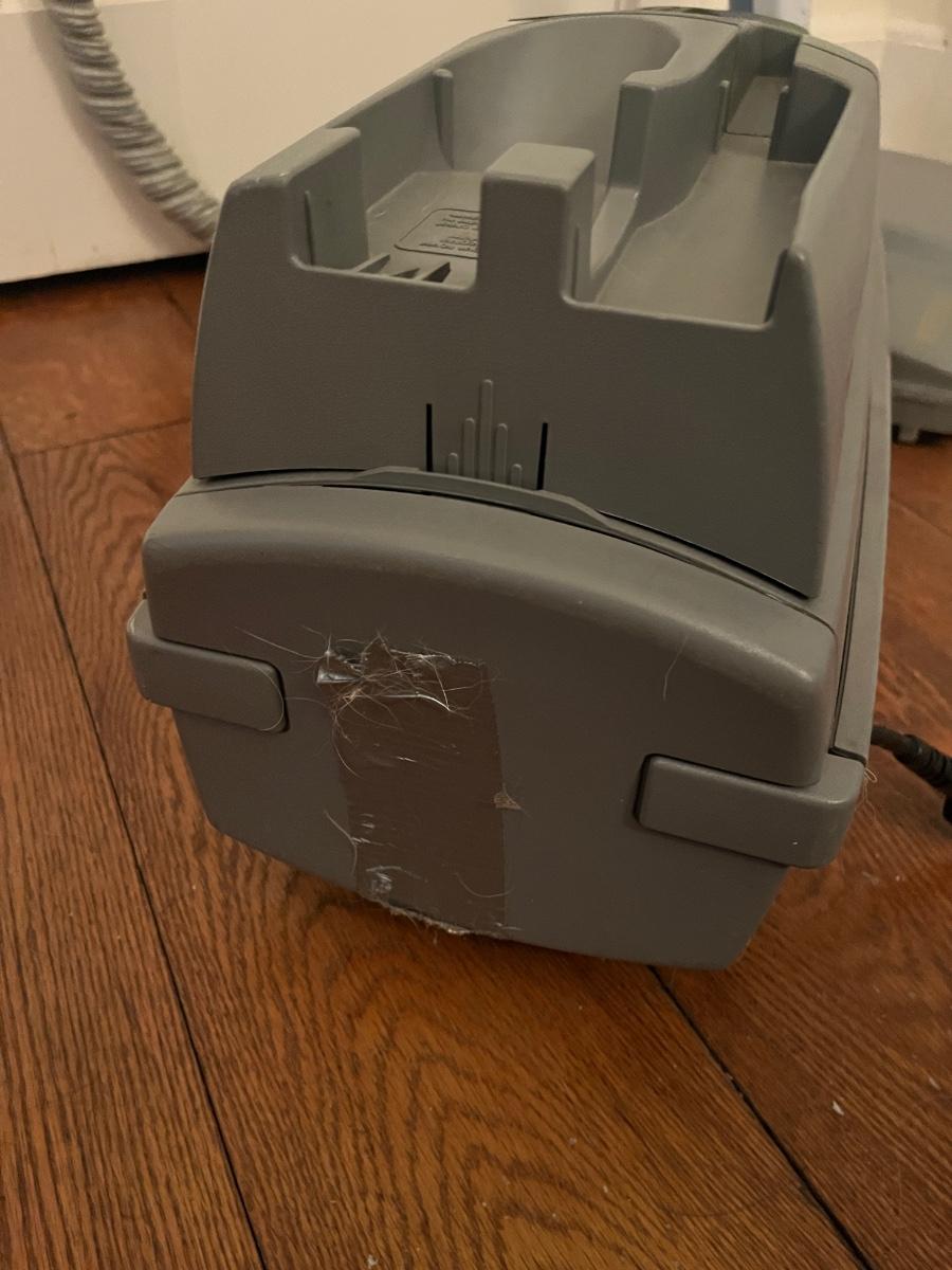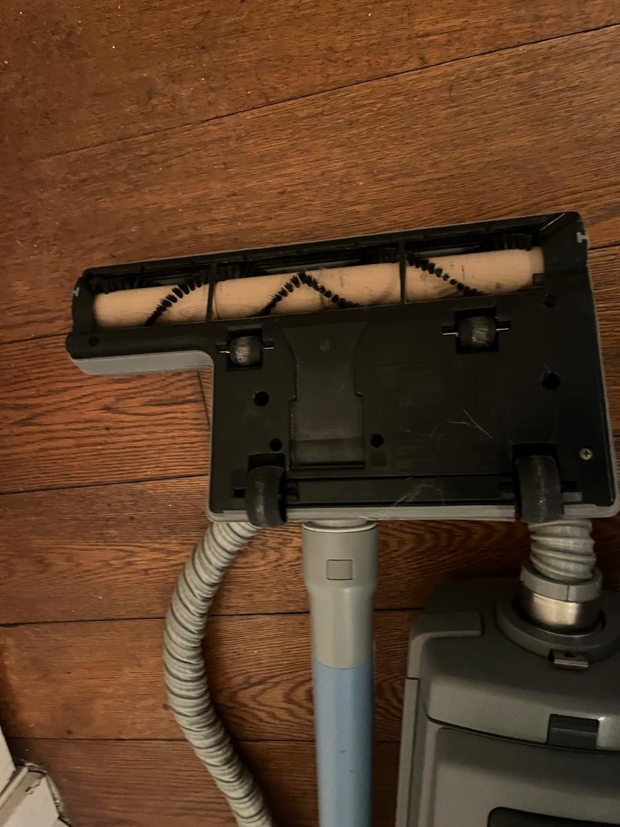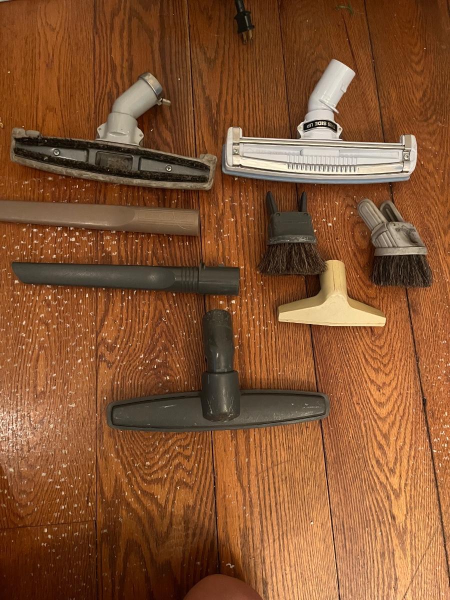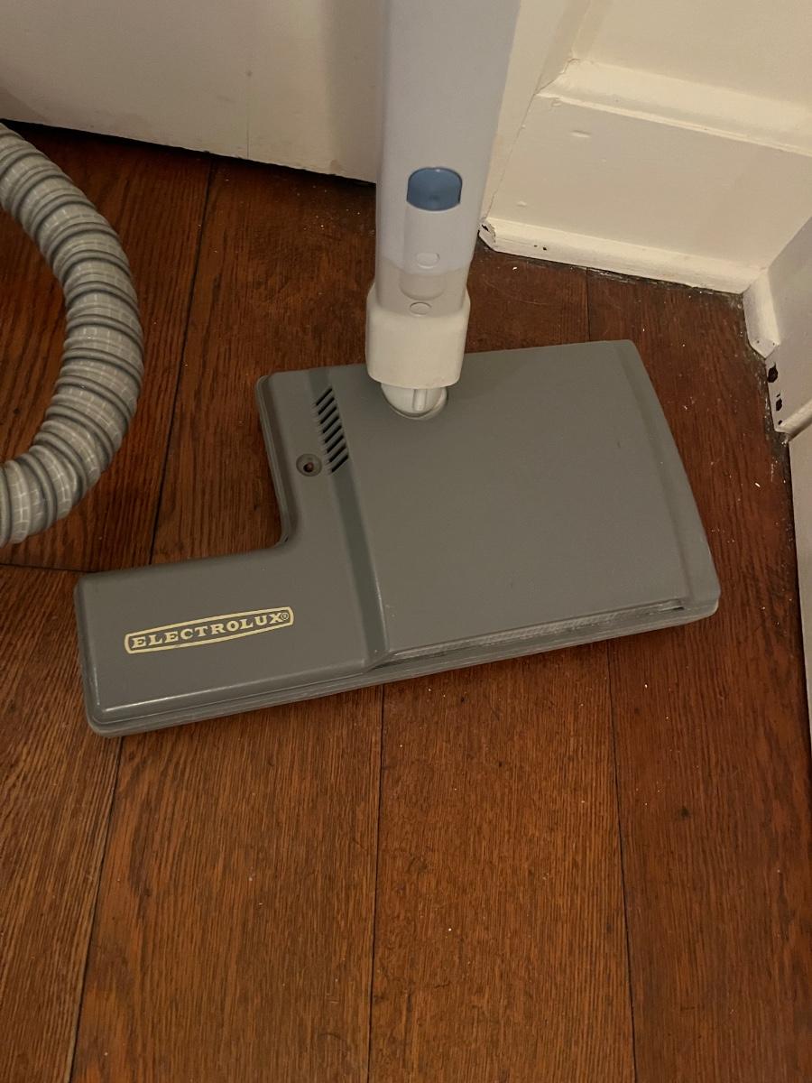 Lot includes a Electrolux canister vacuum with attachments and extra bags. Vacuum powered on when plugged in. Tape is currently helping the back panel stay on tight.