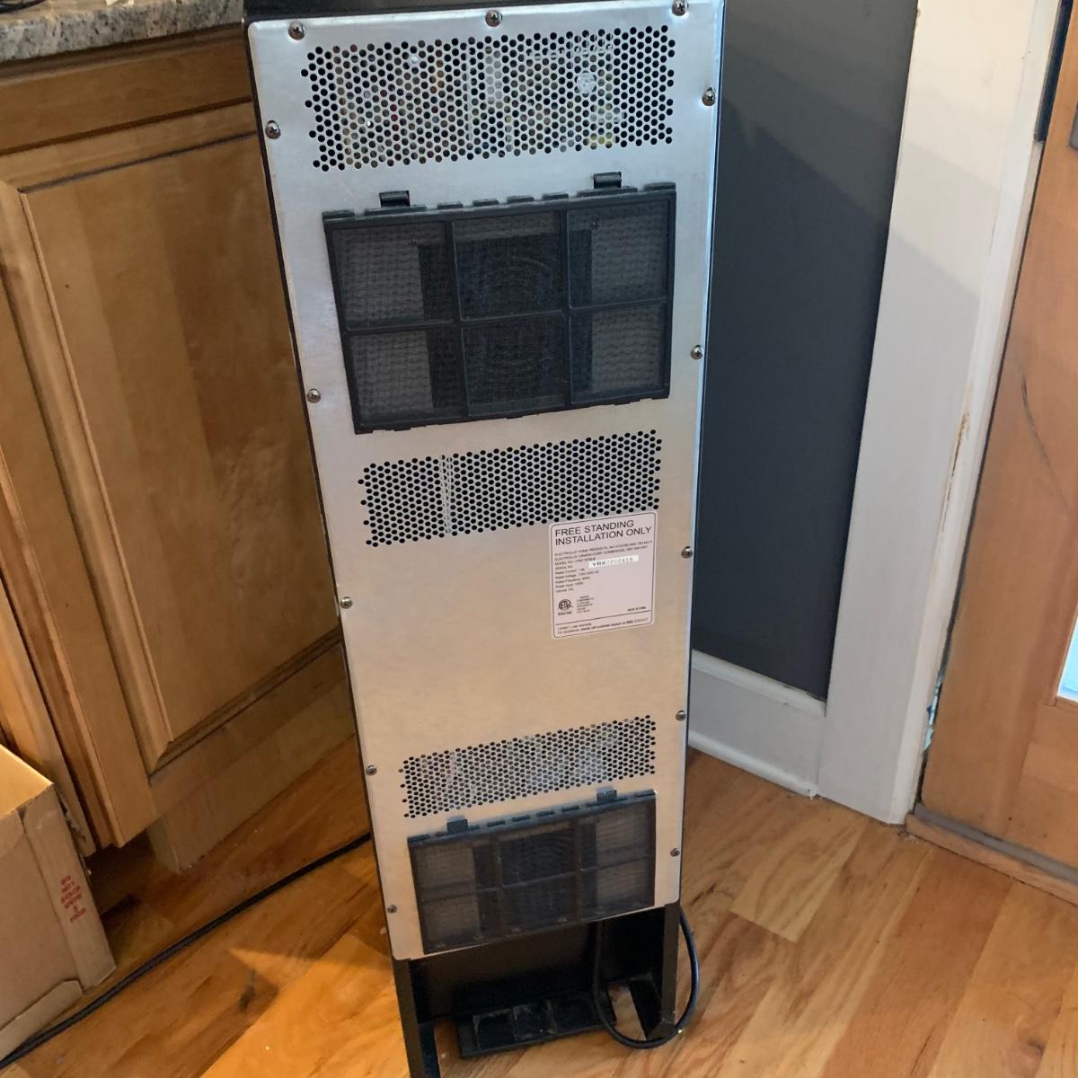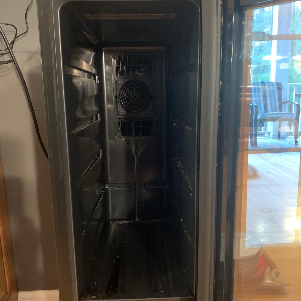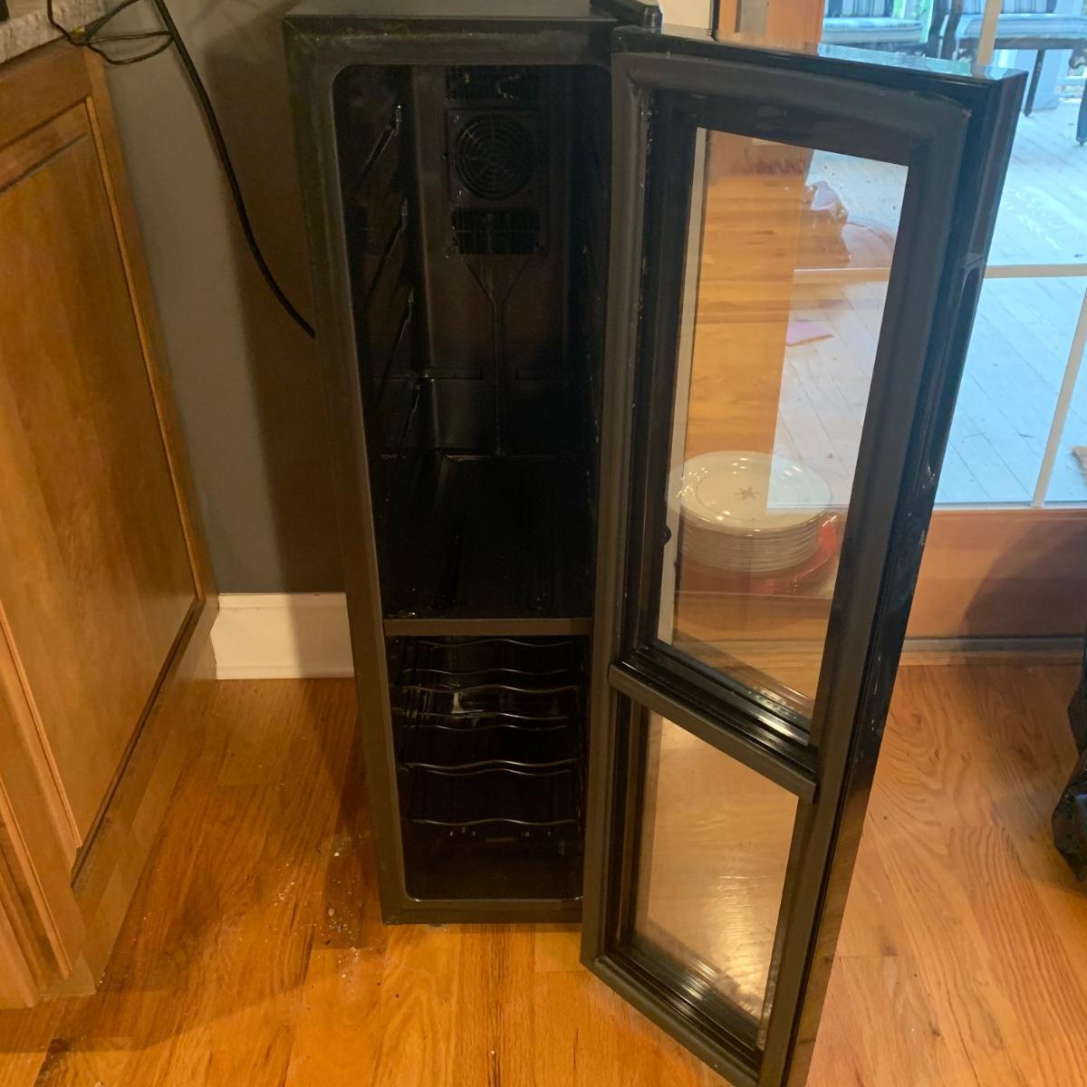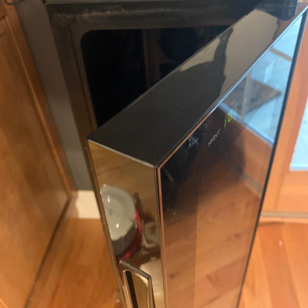 Electrolux wine cooler in black. Cooler powers on and measures, 10”L x 20”W x 37”H. This cooler does have a few blemishes and appears to have had a bottle of wine break inside. The inside of the cooler will need to be cautiously cleaned, as there are many shards of glass stuck to the sides. Aside from requiring cleaning, this item powers on and appears to be in good condition. Please see photos for more details.