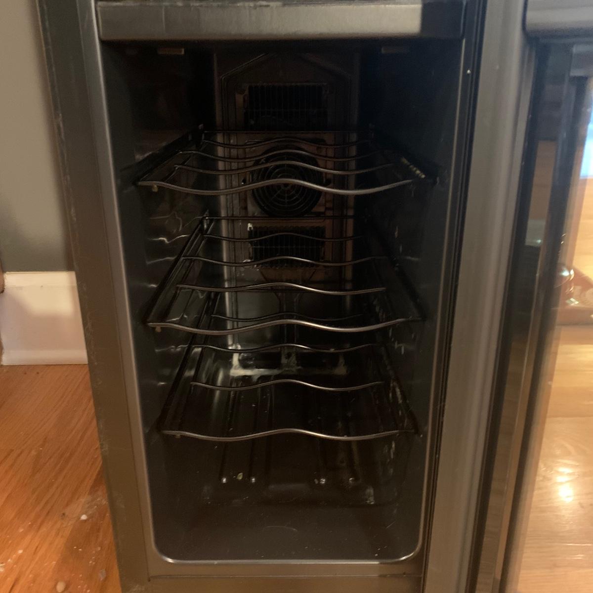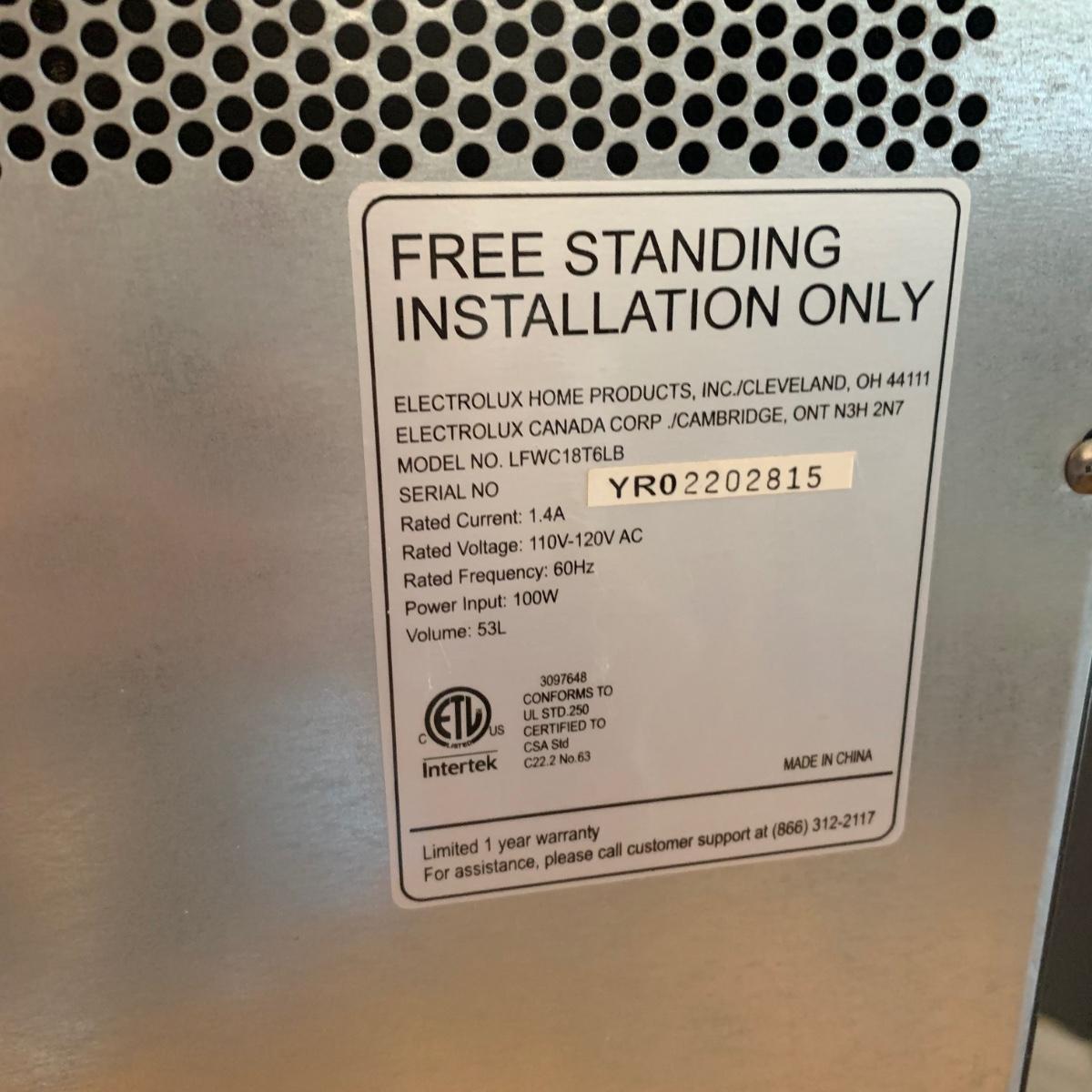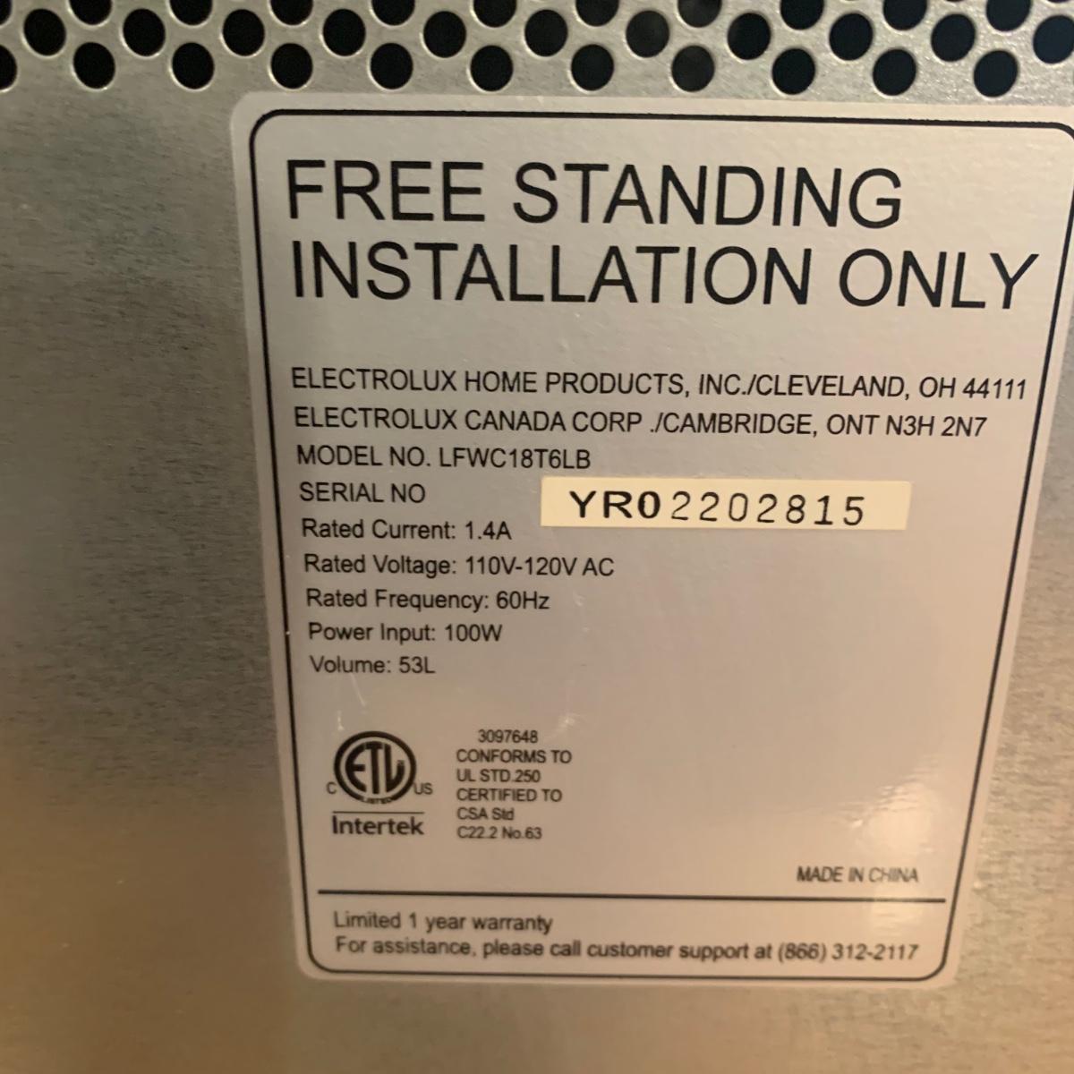 Electrolux wine cooler in black. Cooler powers on and measures, 10”L x 20”W x 37”H. This cooler does have a few blemishes and appears to have had a bottle of wine break inside. The inside of the cooler will need to be cautiously cleaned, as there are many shards of glass stuck to the sides. Aside from requiring cleaning, this item powers on and appears to be in good condition. Please see photos for more details.