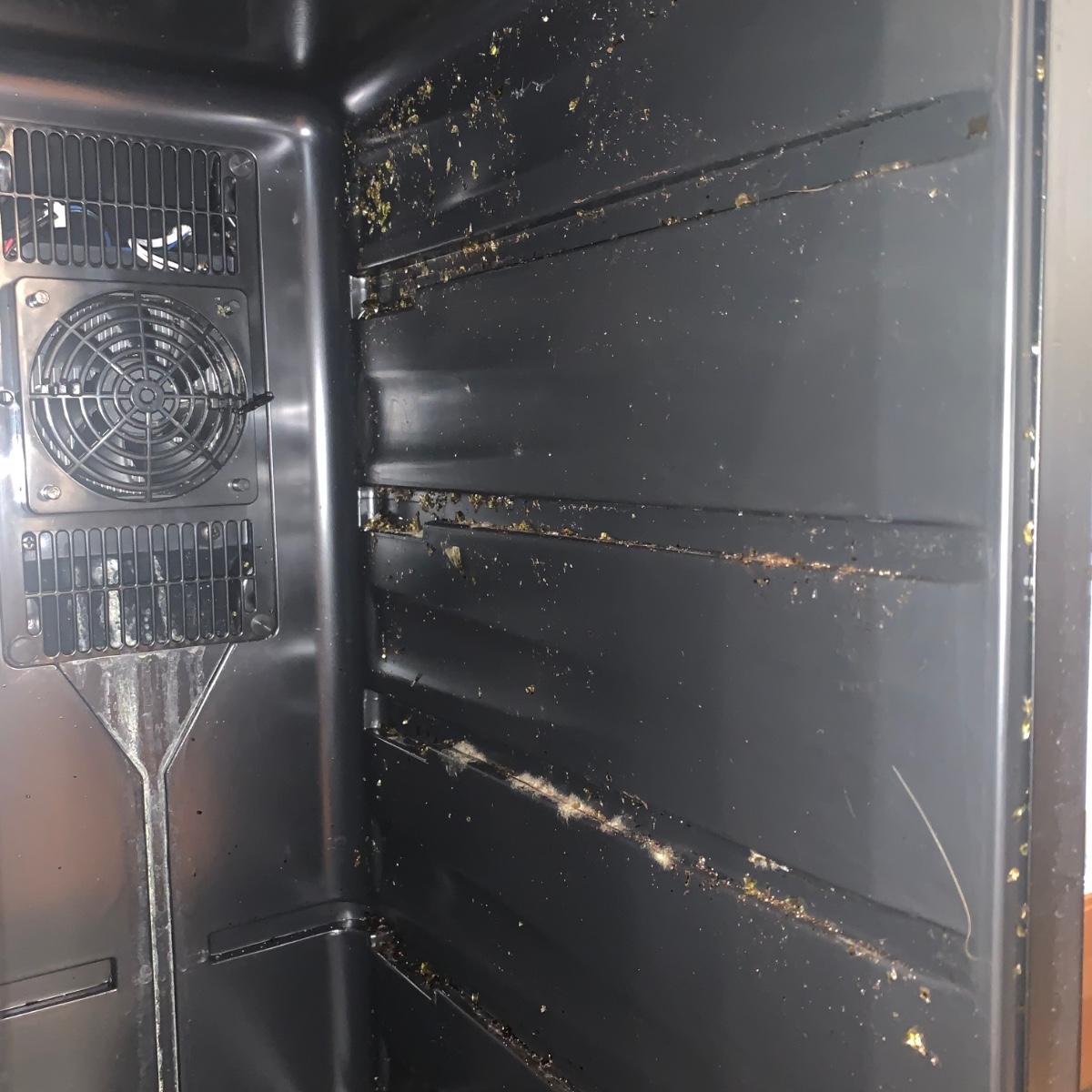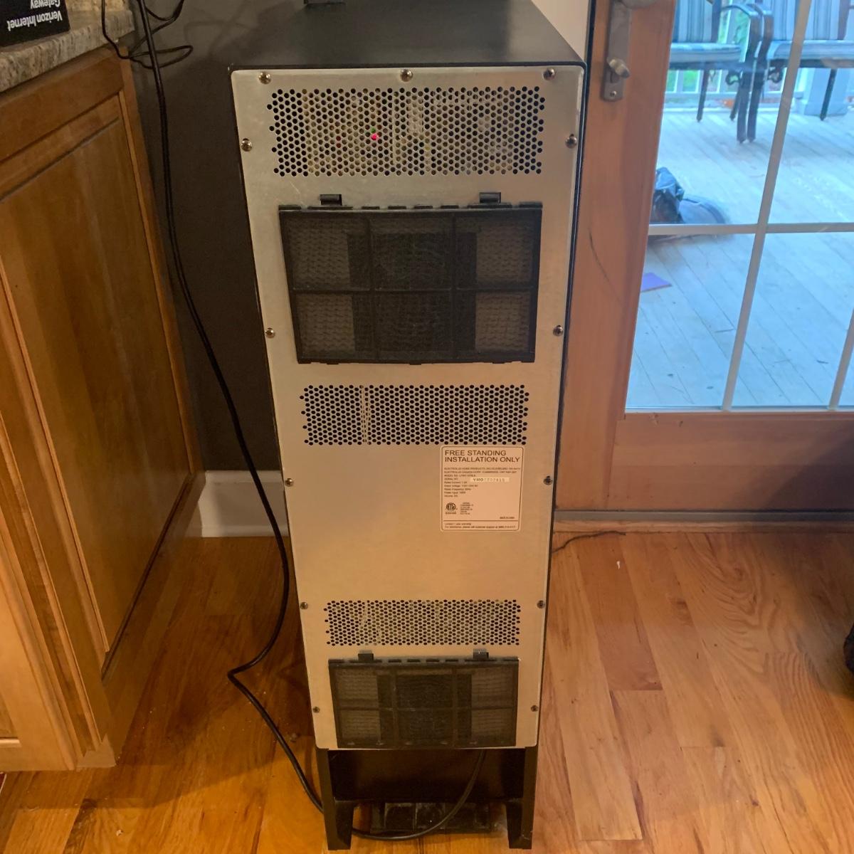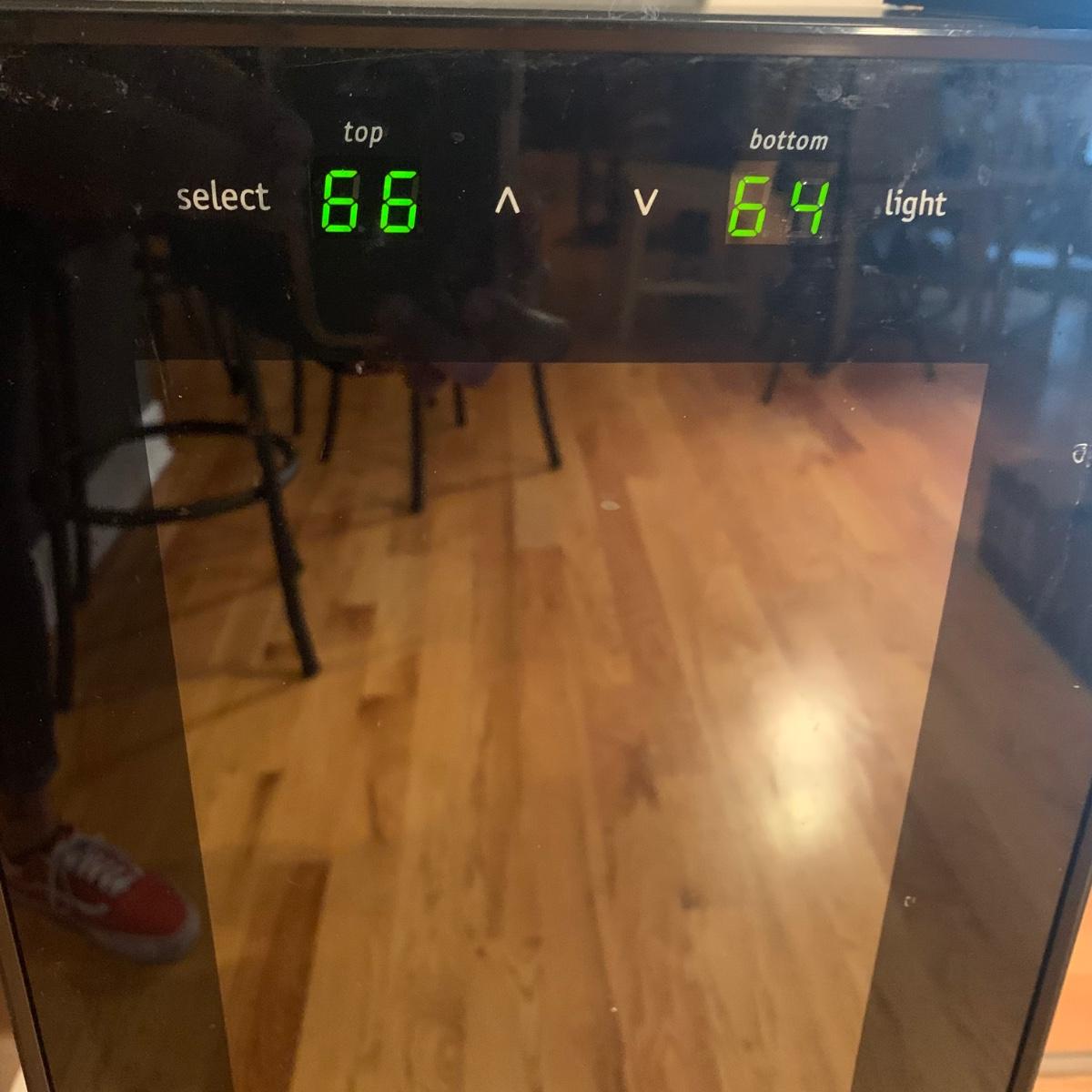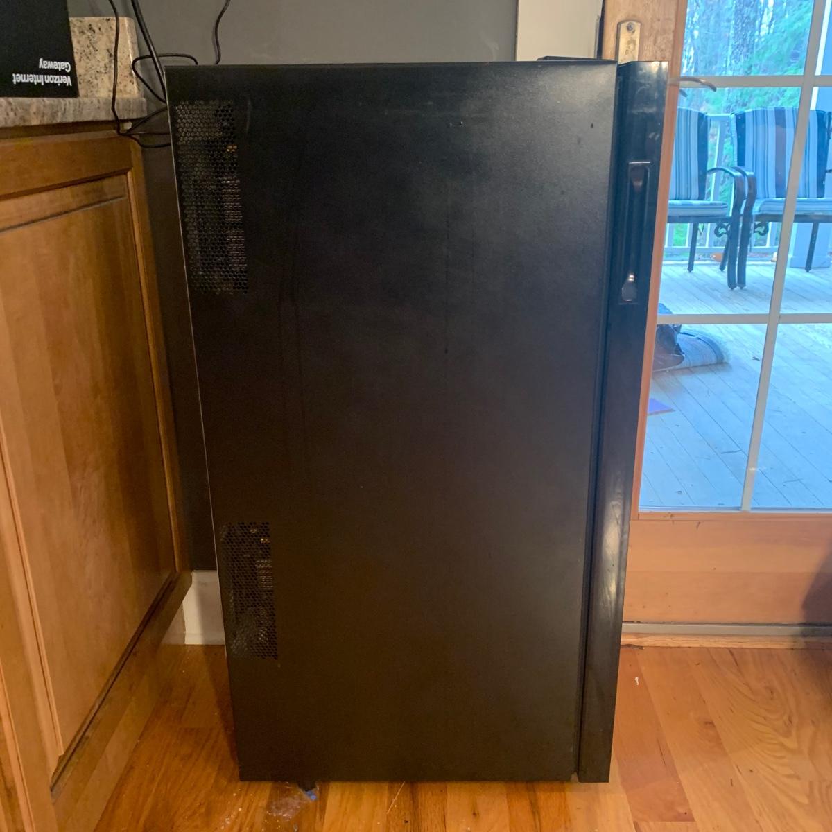 Electrolux wine cooler in black. Cooler powers on and measures, 10”L x 20”W x 37”H. This cooler does have a few blemishes and appears to have had a bottle of wine break inside. The inside of the cooler will need to be cautiously cleaned, as there are many shards of glass stuck to the sides. Aside from requiring cleaning, this item powers on and appears to be in good condition. Please see photos for more details.