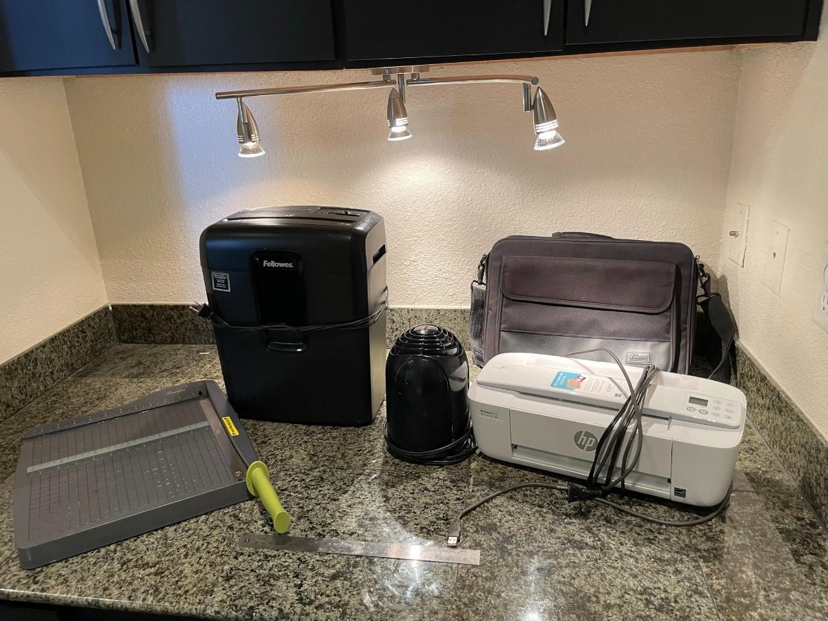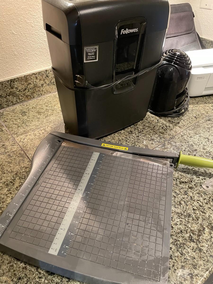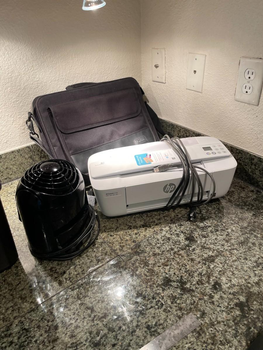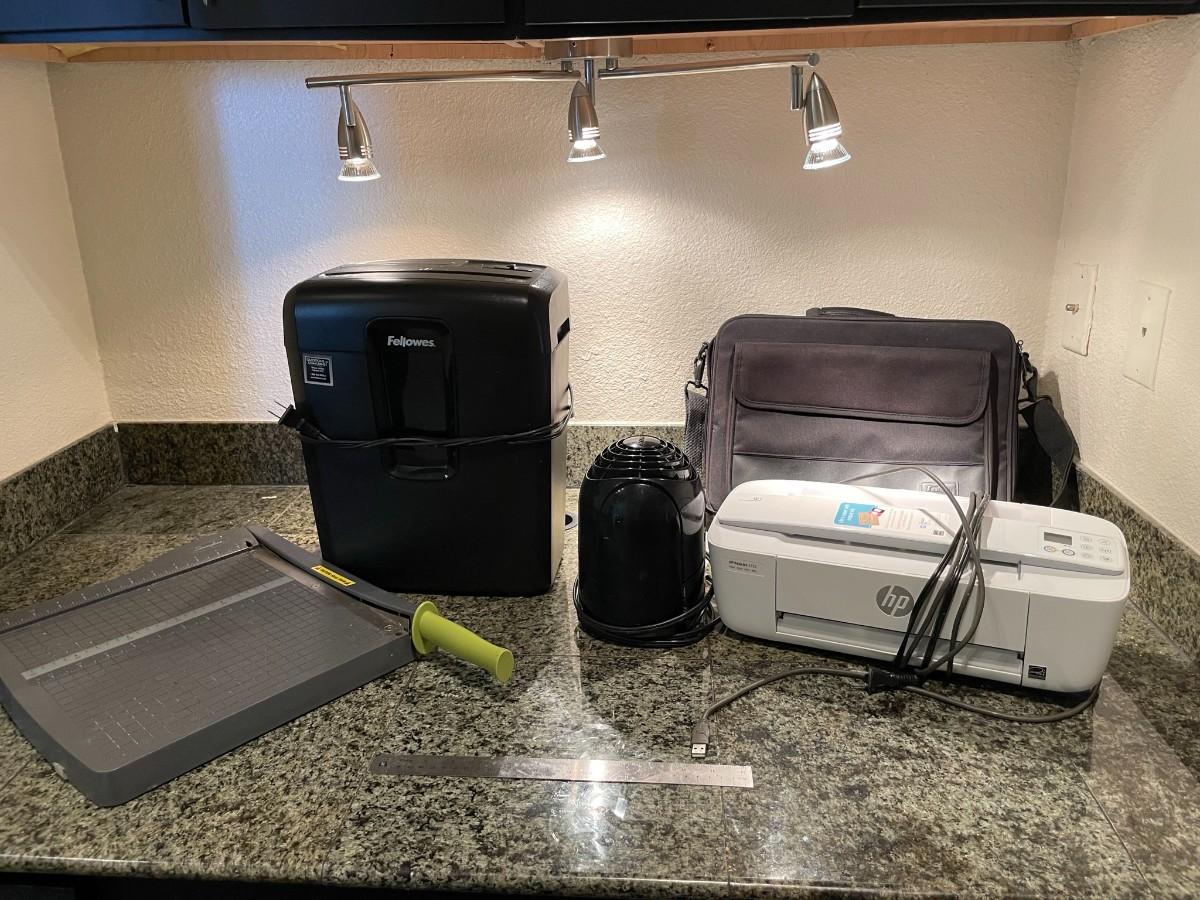 Fellow 9C paper shredder, HP Desk Jet 3752 printer, Swingline paper cutter, Vornado tabletop fan, Brother MFC-400CN all in one print, scana nd fa, targus Computer Bag. All items power up but not further testing was completed.
