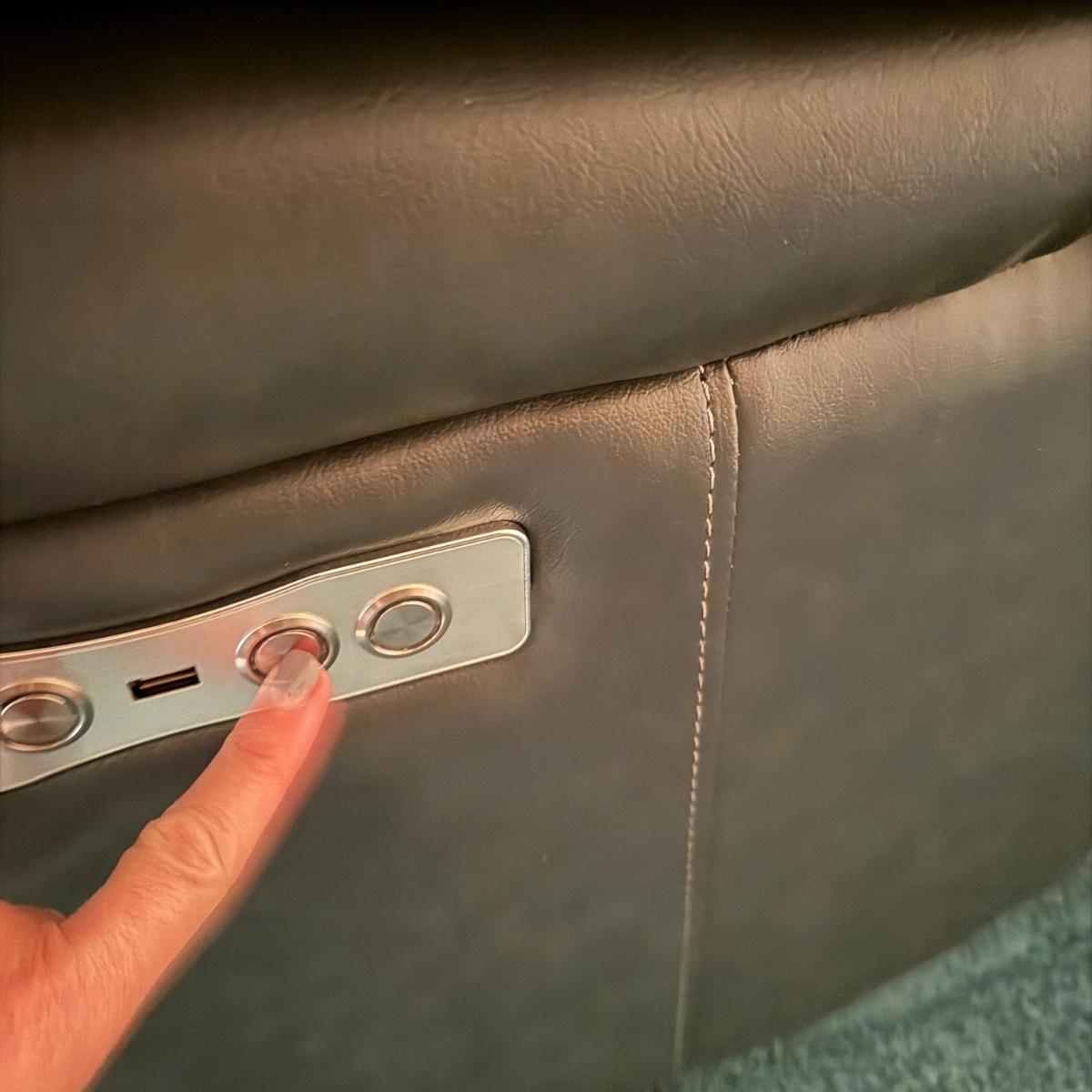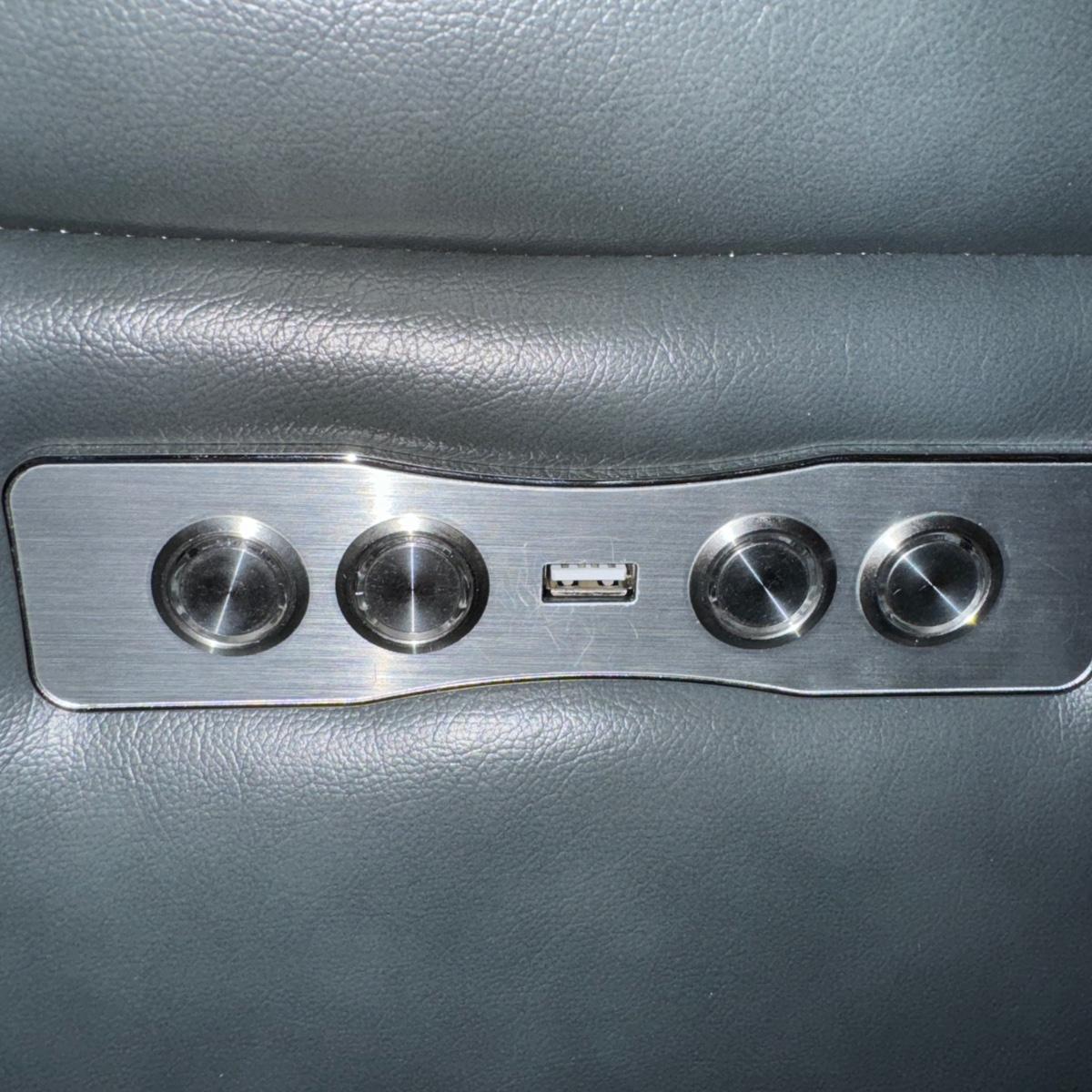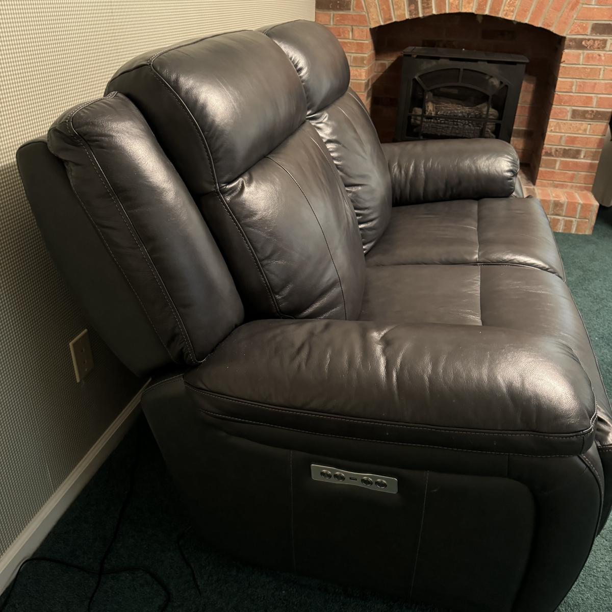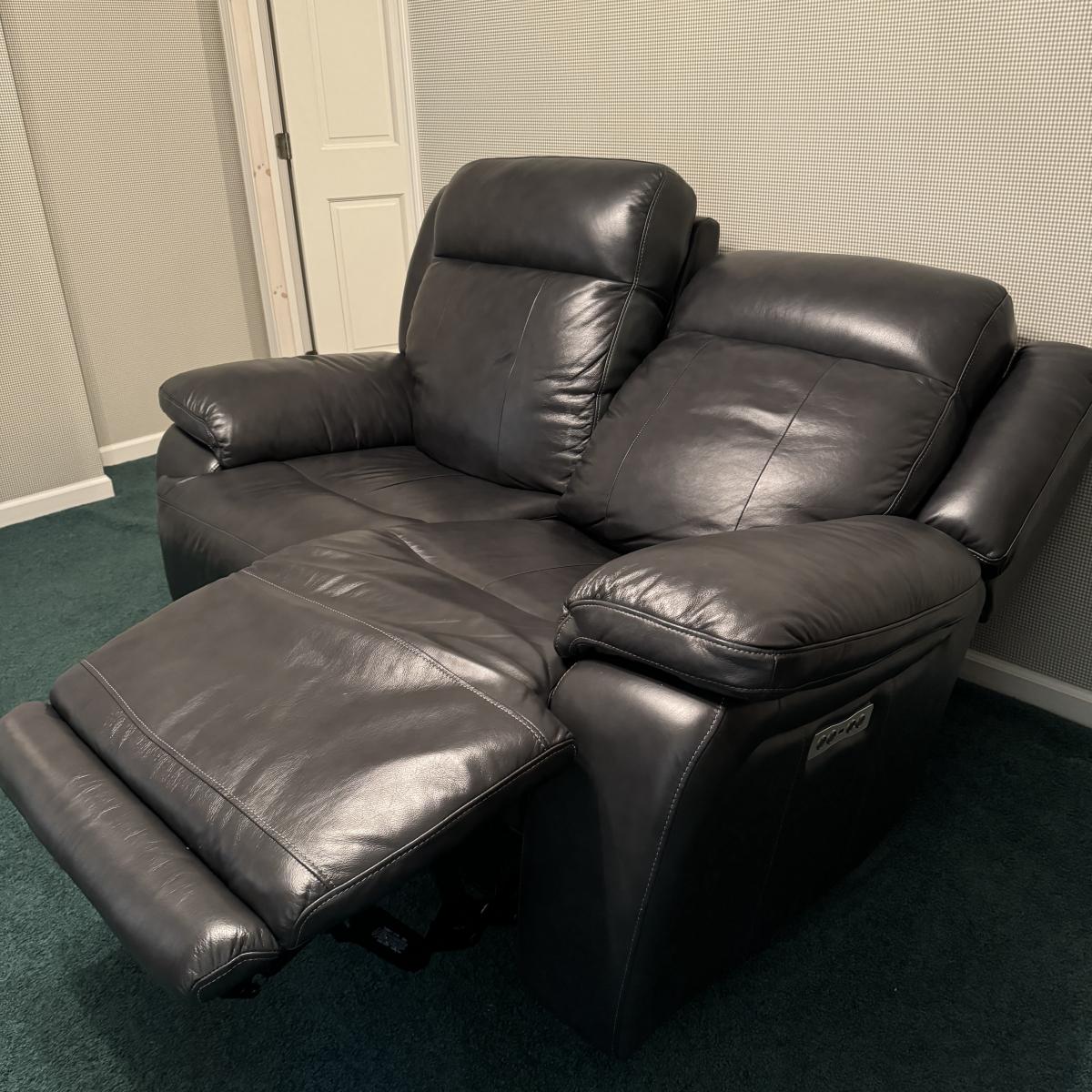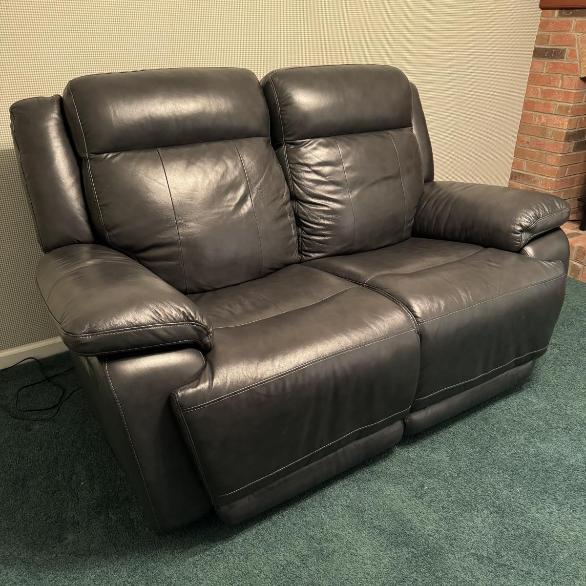Each side of this love seat has its own controls with a USB port as well. One set of buttons controls the recline and leg position and the other buttons control the back rest. Leather is in great condition and is a dark grey color. All electronics worked when tested. Measures 64” x 40” x 36” H (when not reclining).