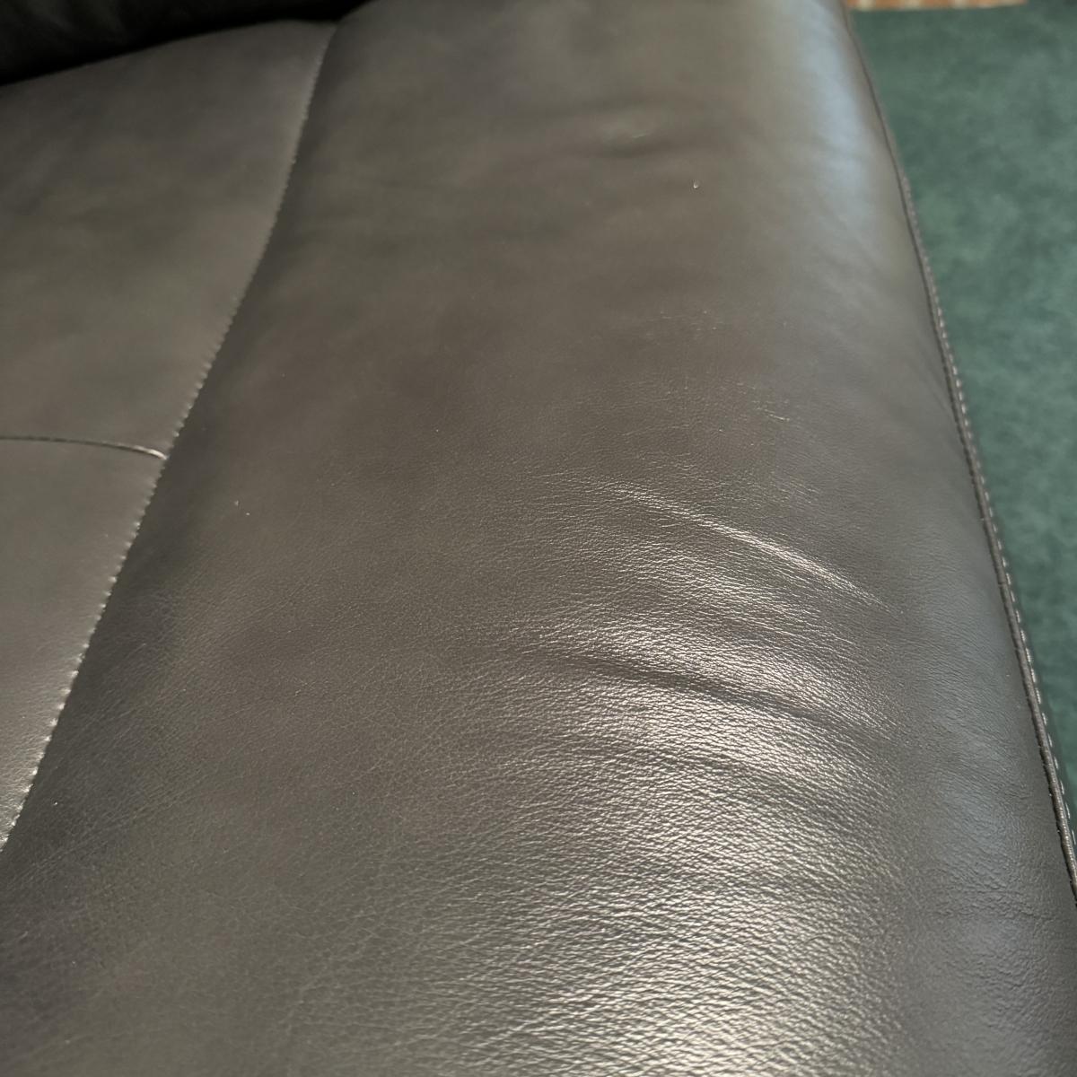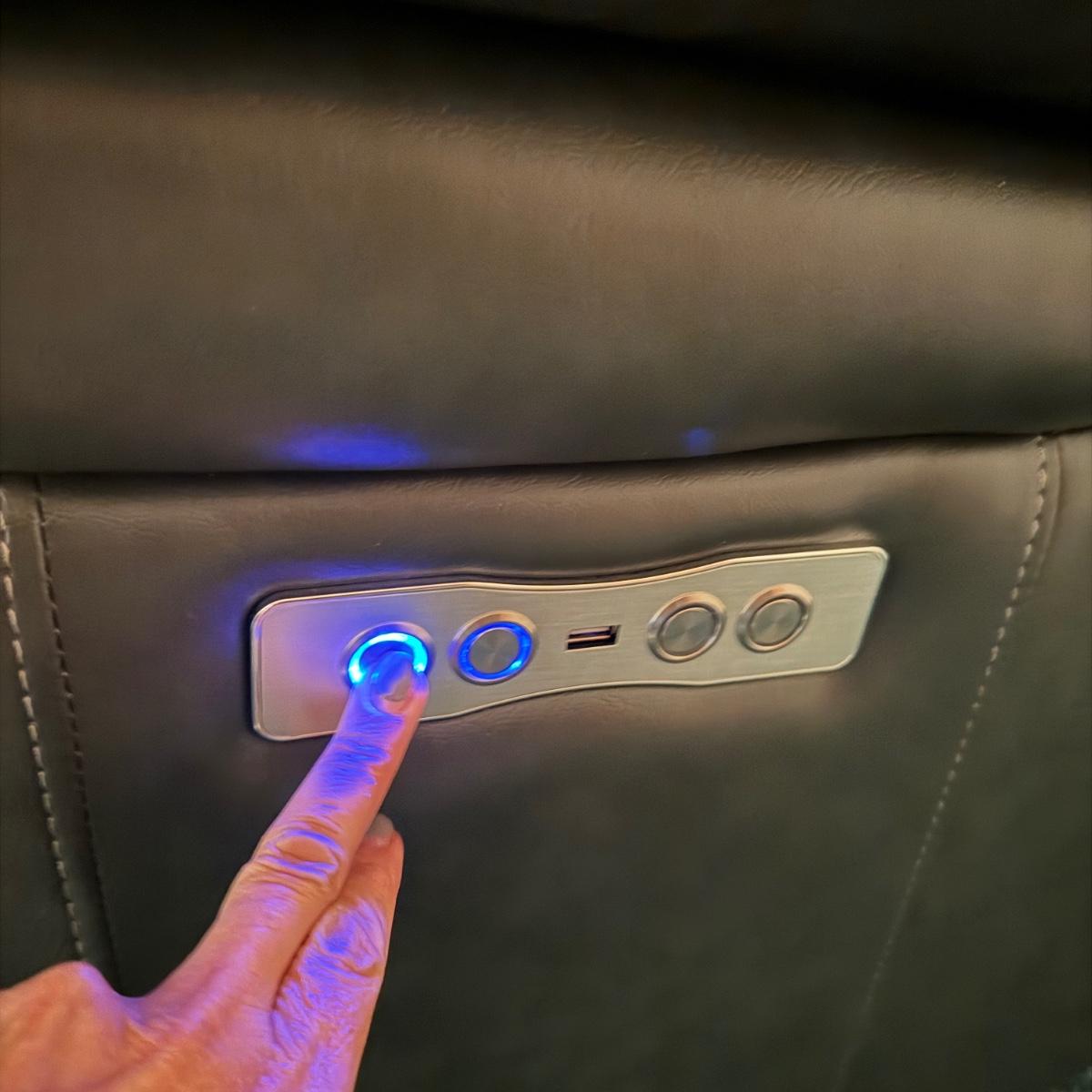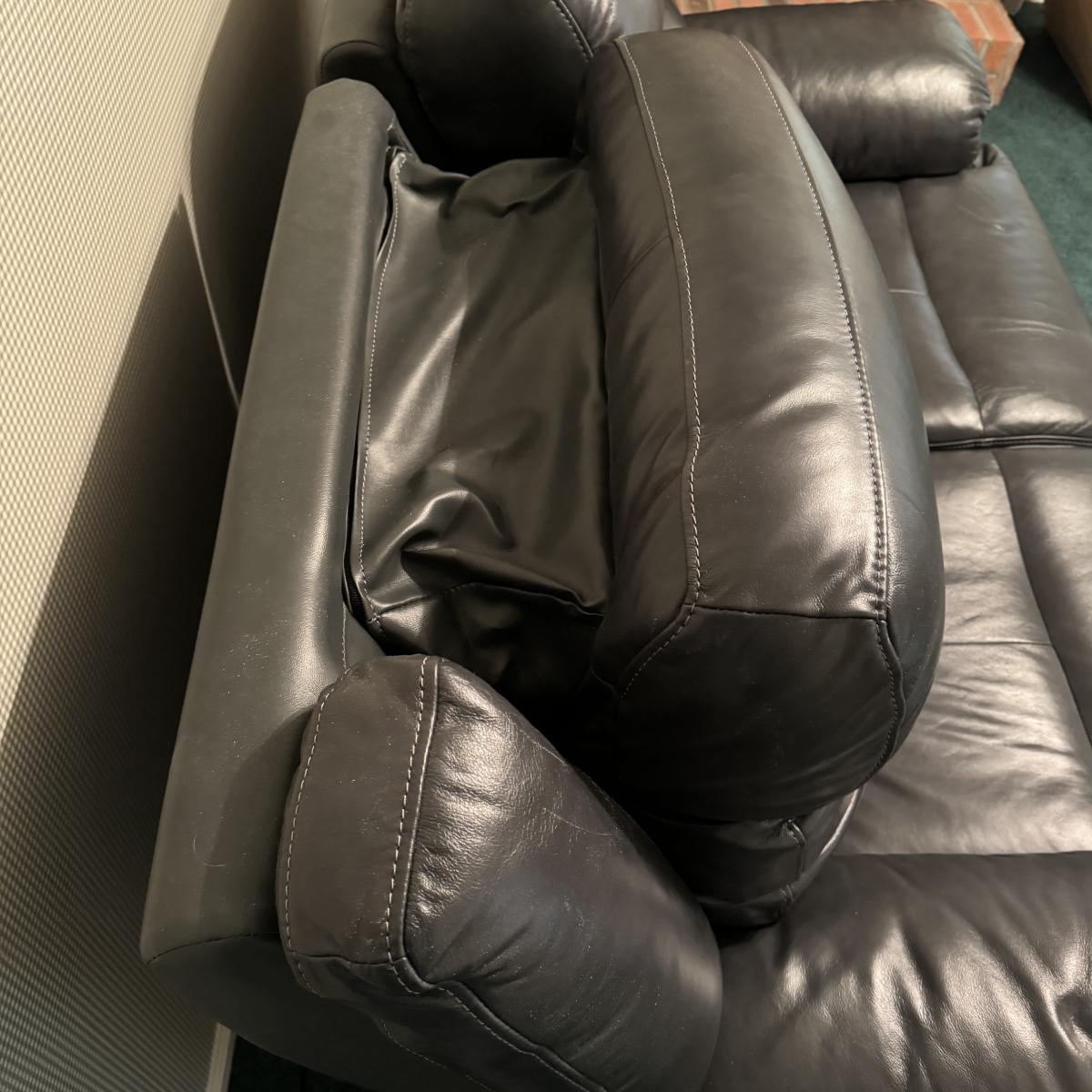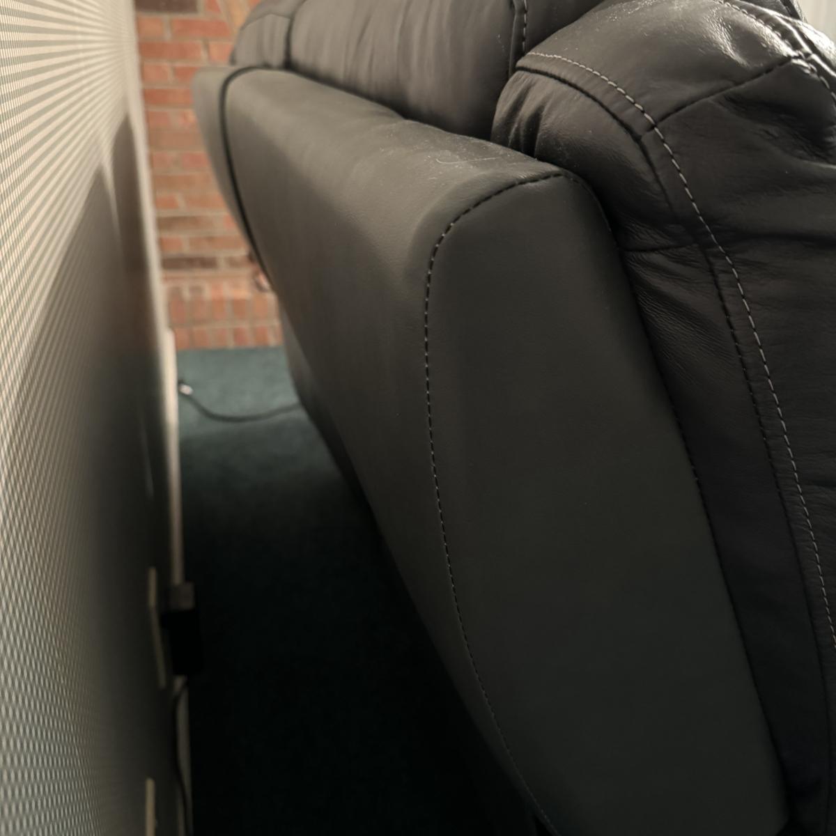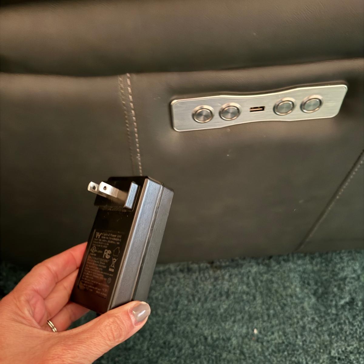 Each side of this love seat has its own controls with a USB port as well. One set of buttons controls the recline and leg position and the other buttons control the back rest. Leather is in great condition and is a dark grey color. All electronics worked when tested. Measures 64” x 40” x 36” H (when not reclining).