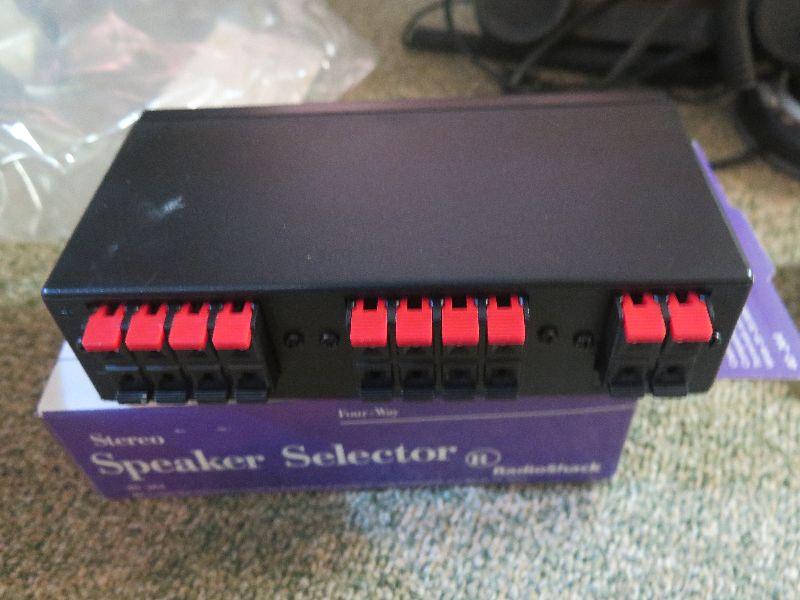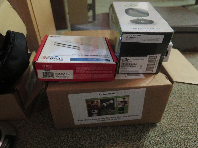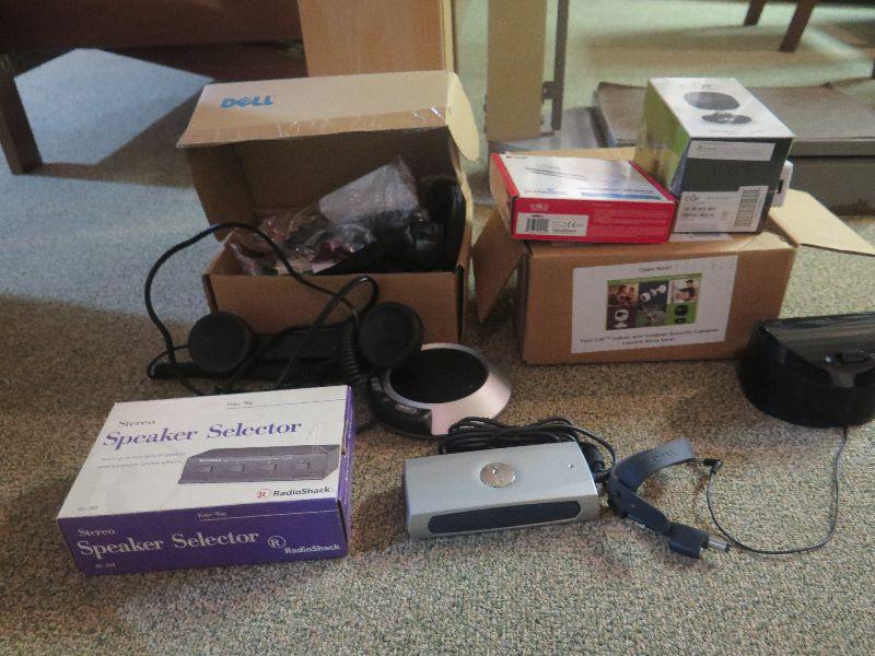 A phone to connect to cell phone for easier conversations, Radio Shack Speaker Selector, a mug warmer, security cameras and more. All untested. Located in basement.