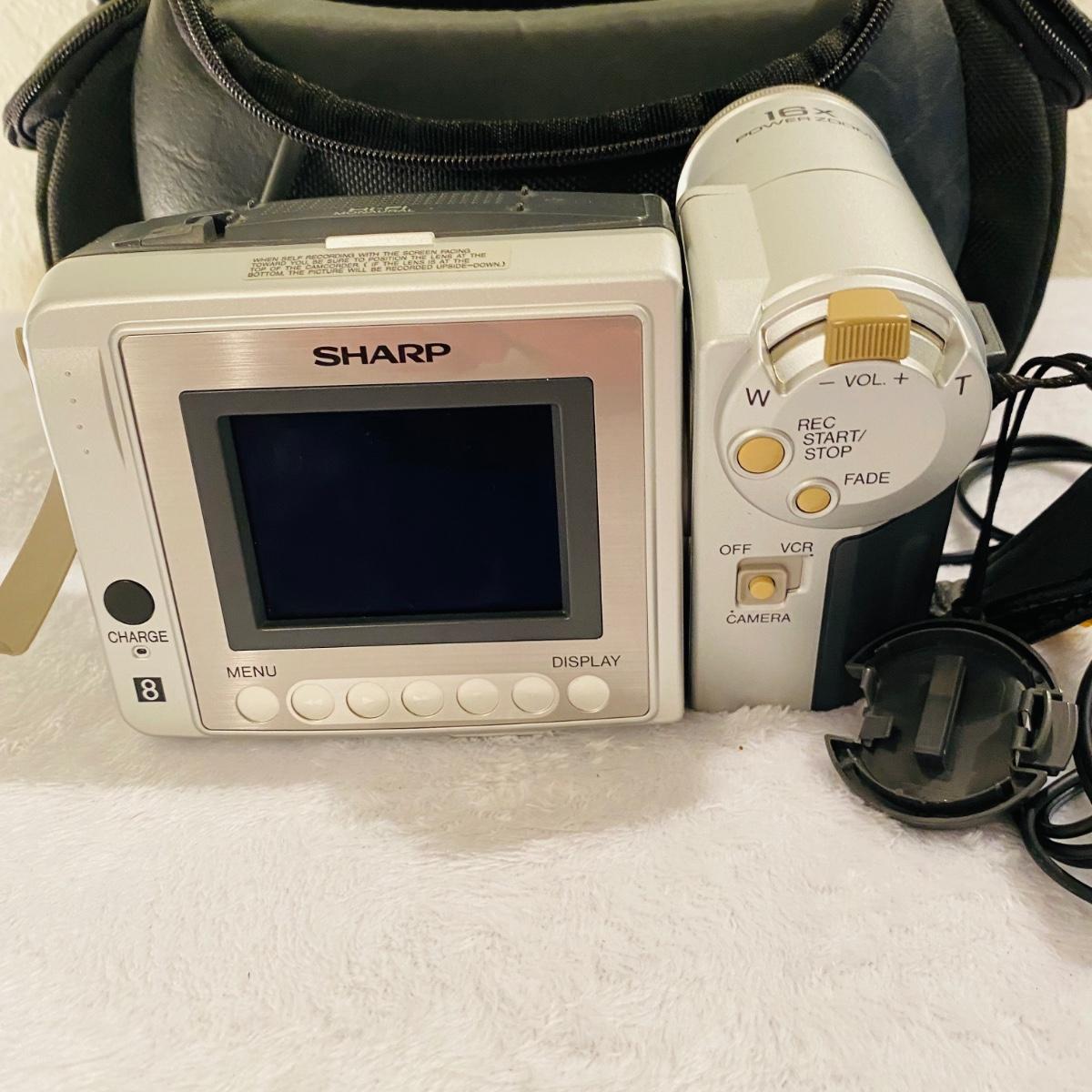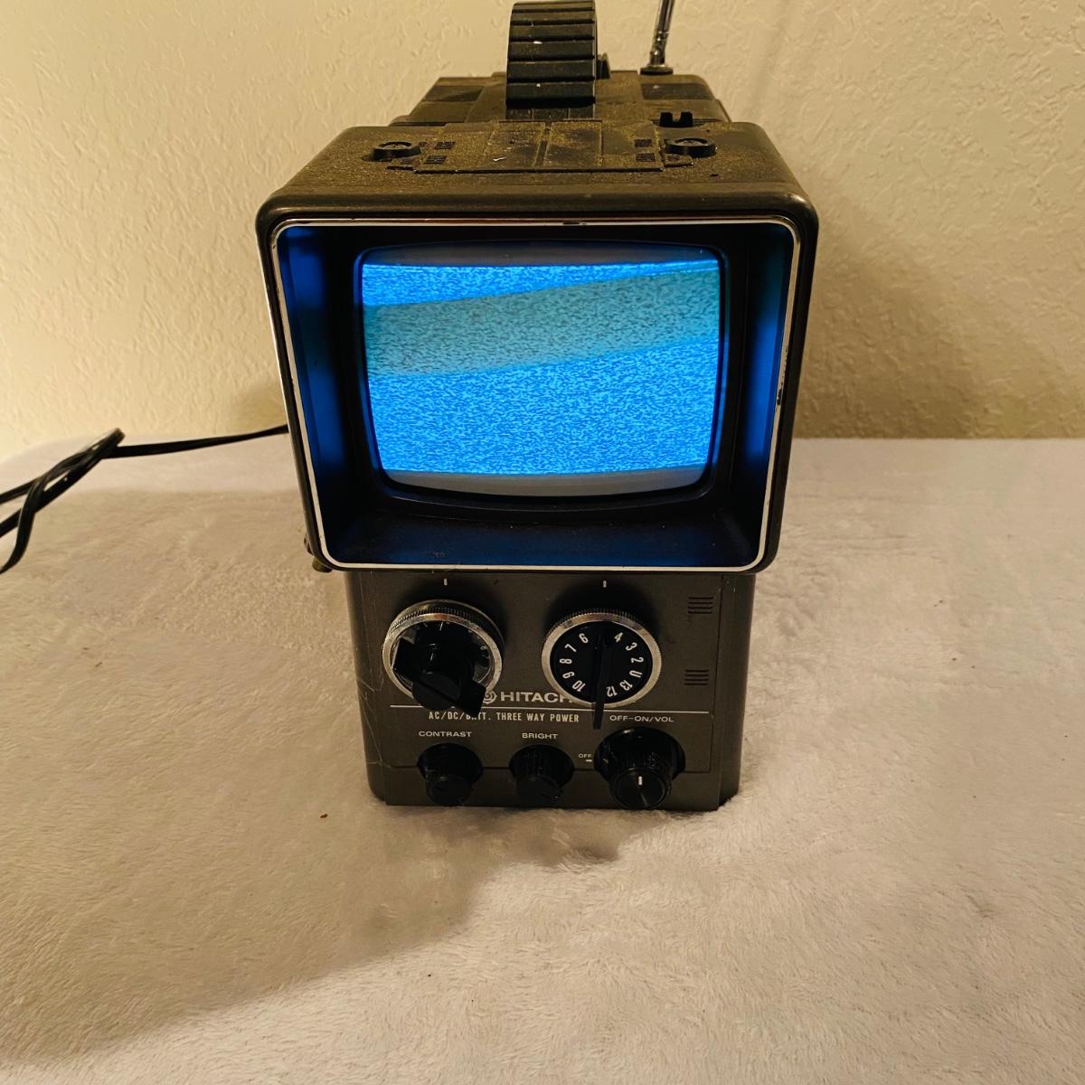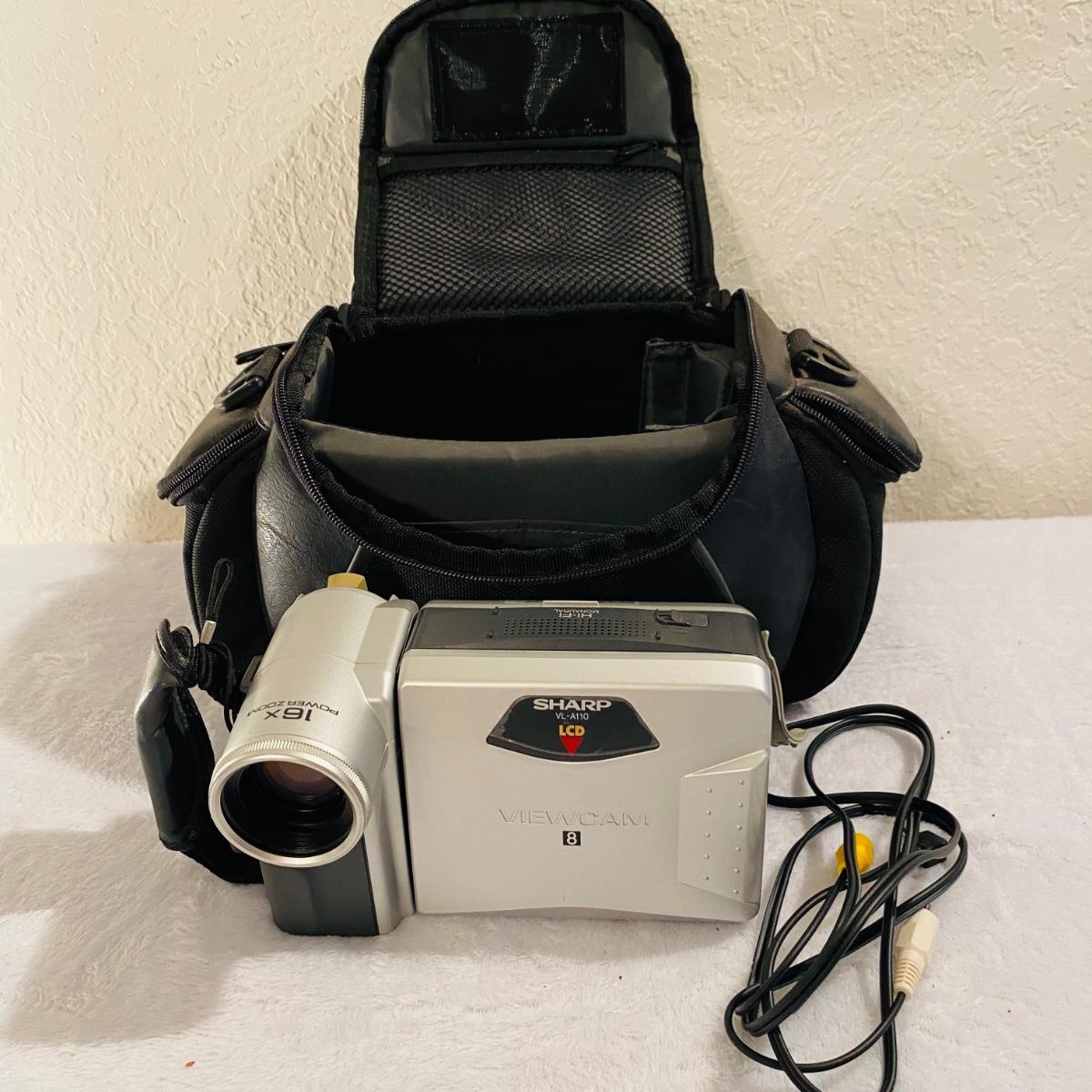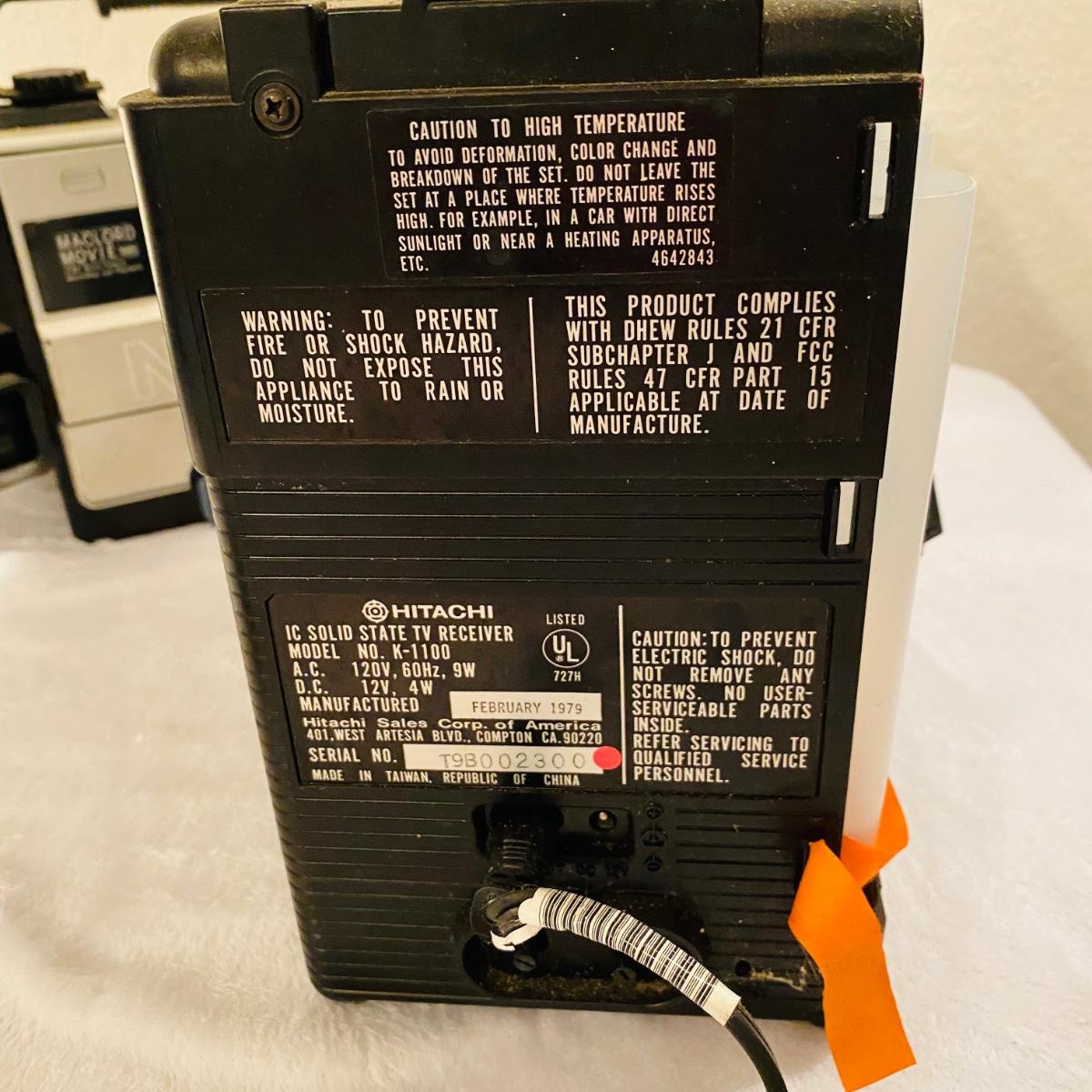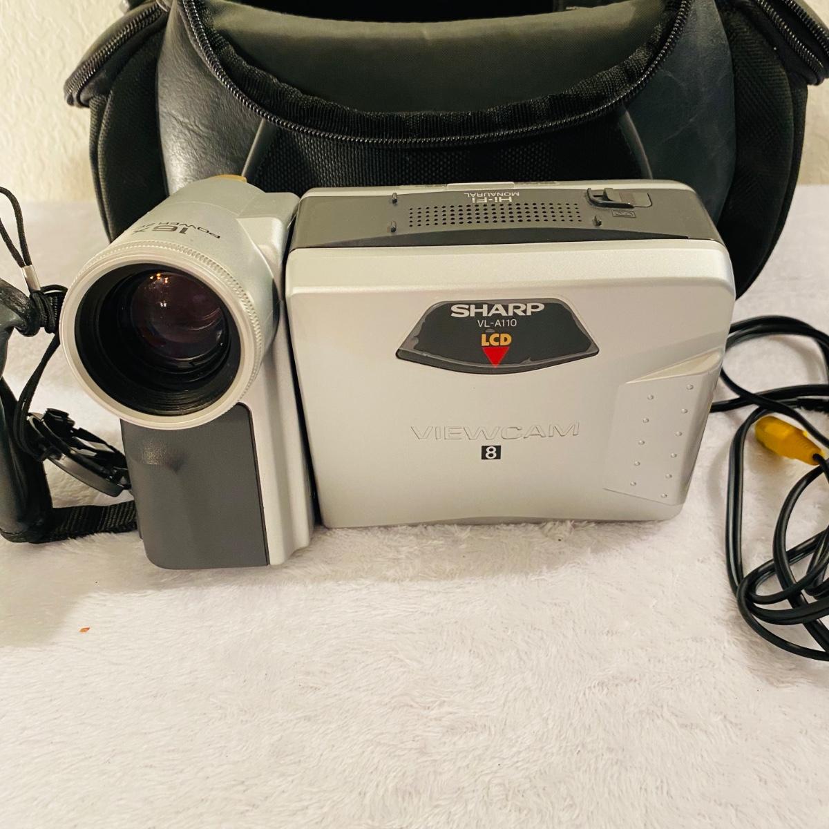 Lot includes National Maclord VHS video camera, Sharp Viewcam 8 video camera. Unable to verify if these are in working condition. Also includes two portable music machines (boom boxes ) that power on when plugged in. Also includes Hitachi portable television that powers on when plugged in.