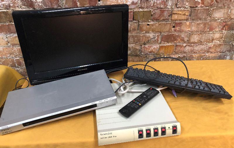 Here is an electronics lot..Sylvania monitor..keyboard..SONY CD/DVD Player Model DVP-NS50P and a Newpoint Switcher 200 Plus...Offered as is..Unknown working condition...