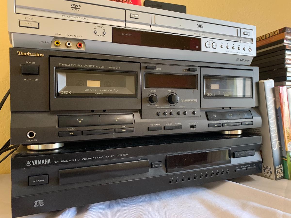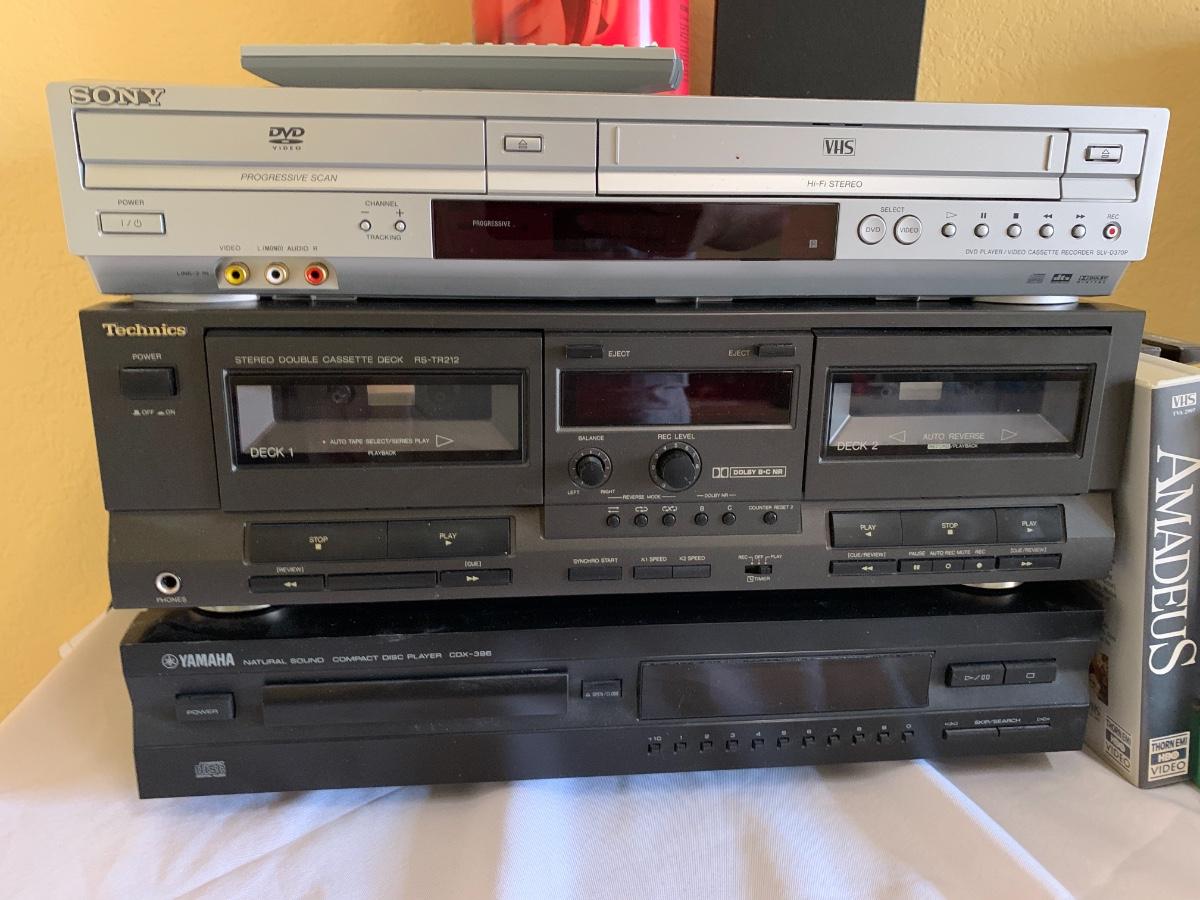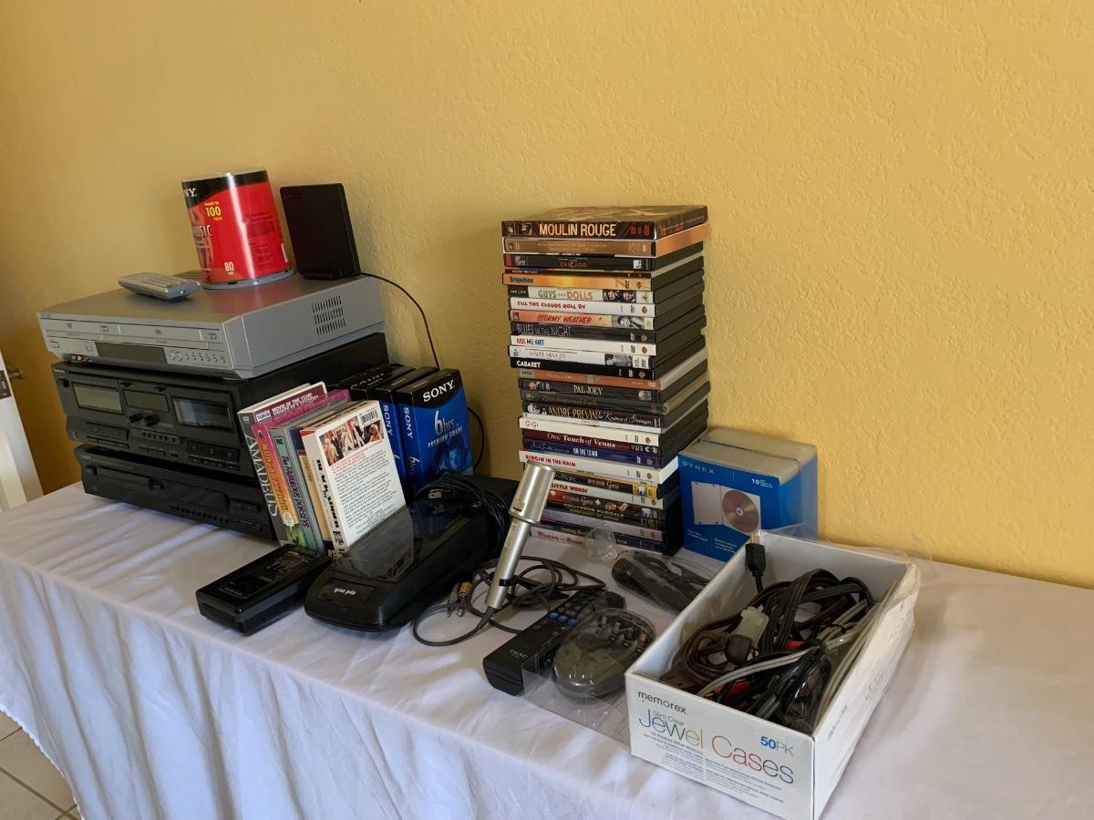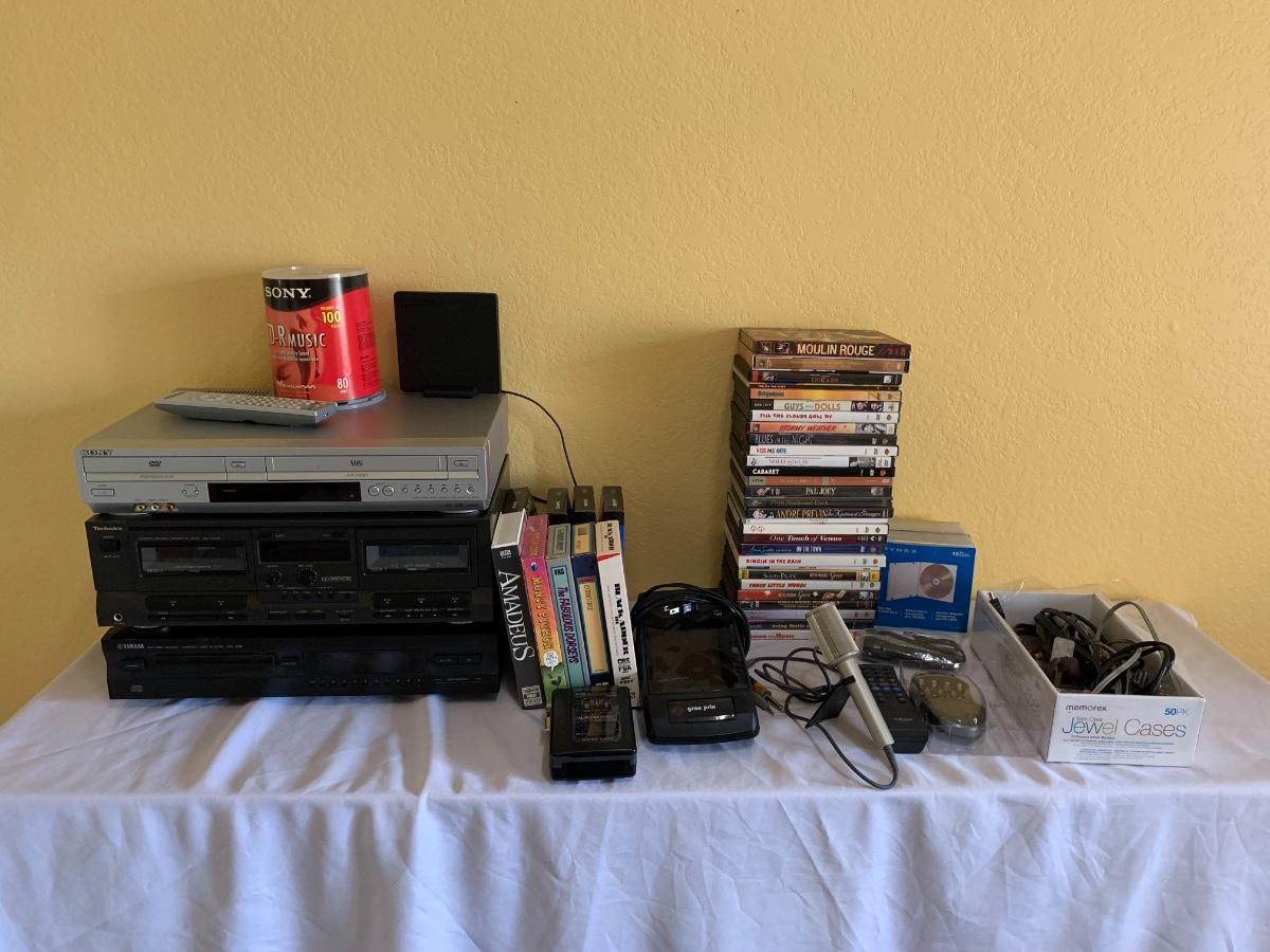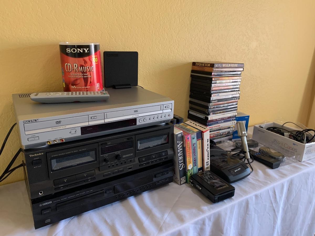 Lot includes a Sony DVD player w/ VHS, a Technics dual cassette, Yamaha CD player, Sony F-99 M microphone, Aiwa walkman without headphones, various DVD and VHS, blank CDs and empty cases and more!