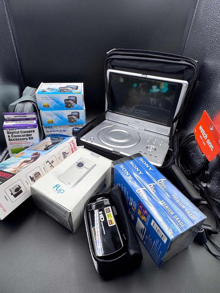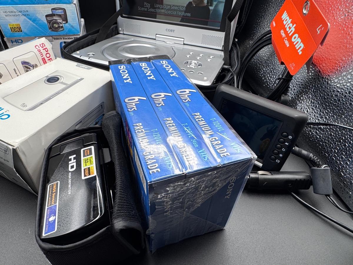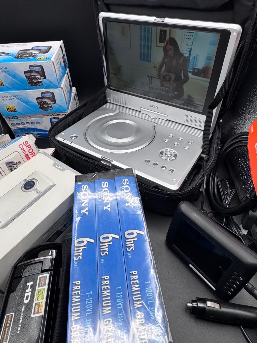 Portable DVD player - tested w/AC power and works; all others untested; includes brand new blank VHS tapes.