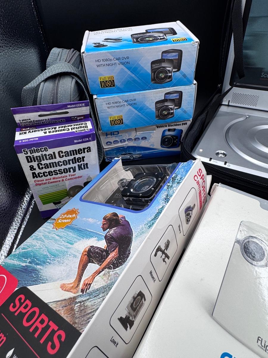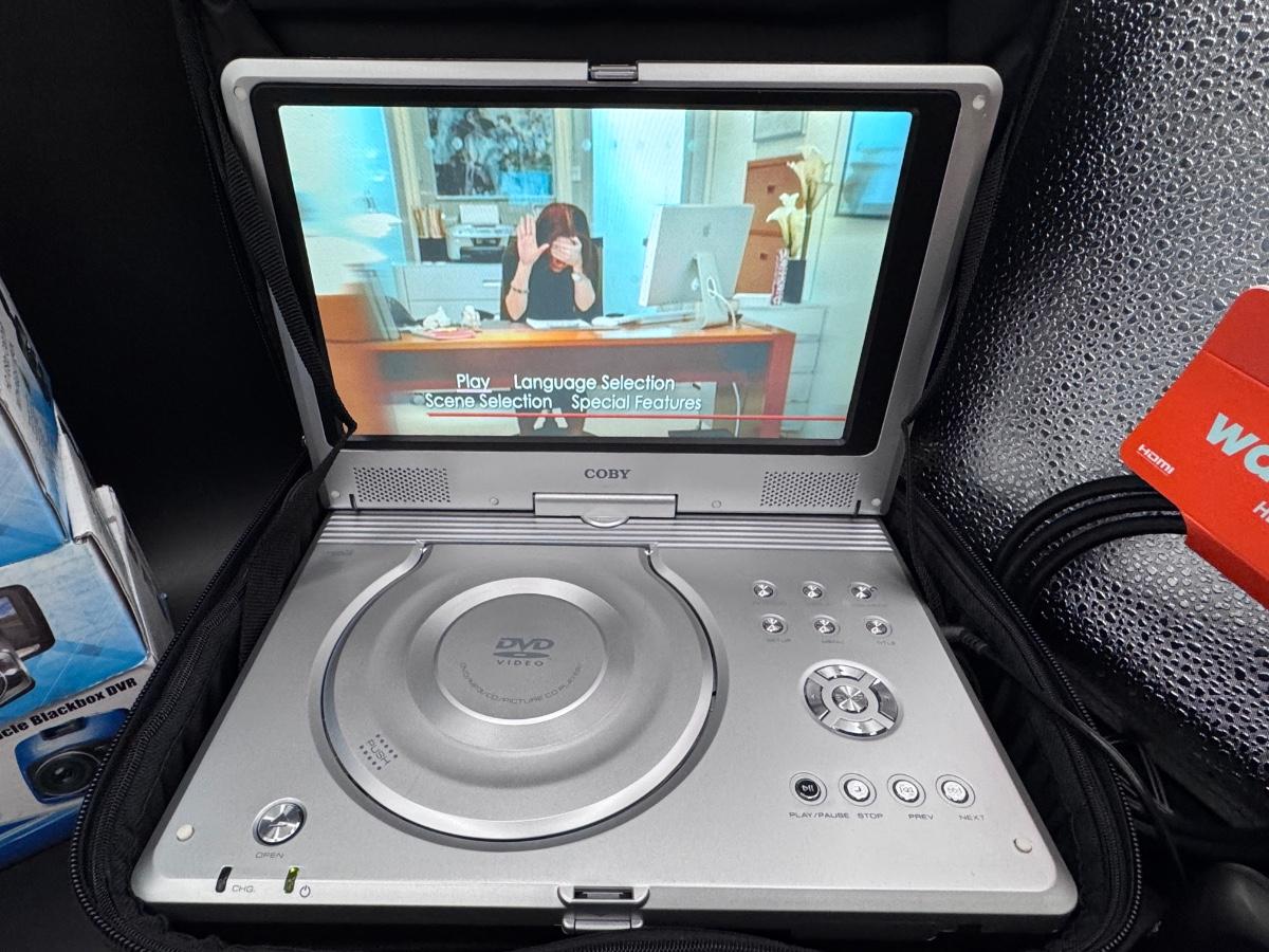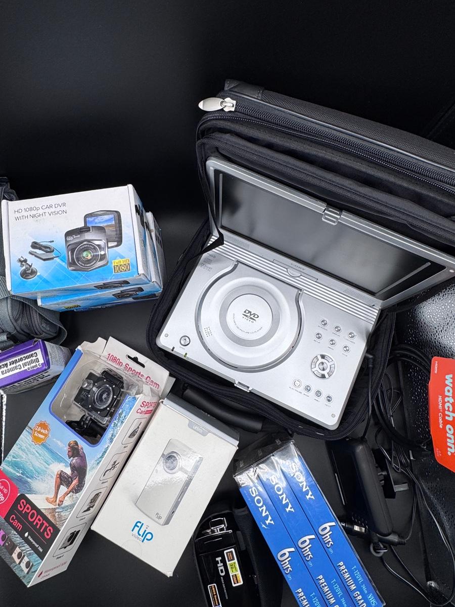 Portable DVD player - tested w/AC power and works; all others untested; includes brand new blank VHS tapes.
