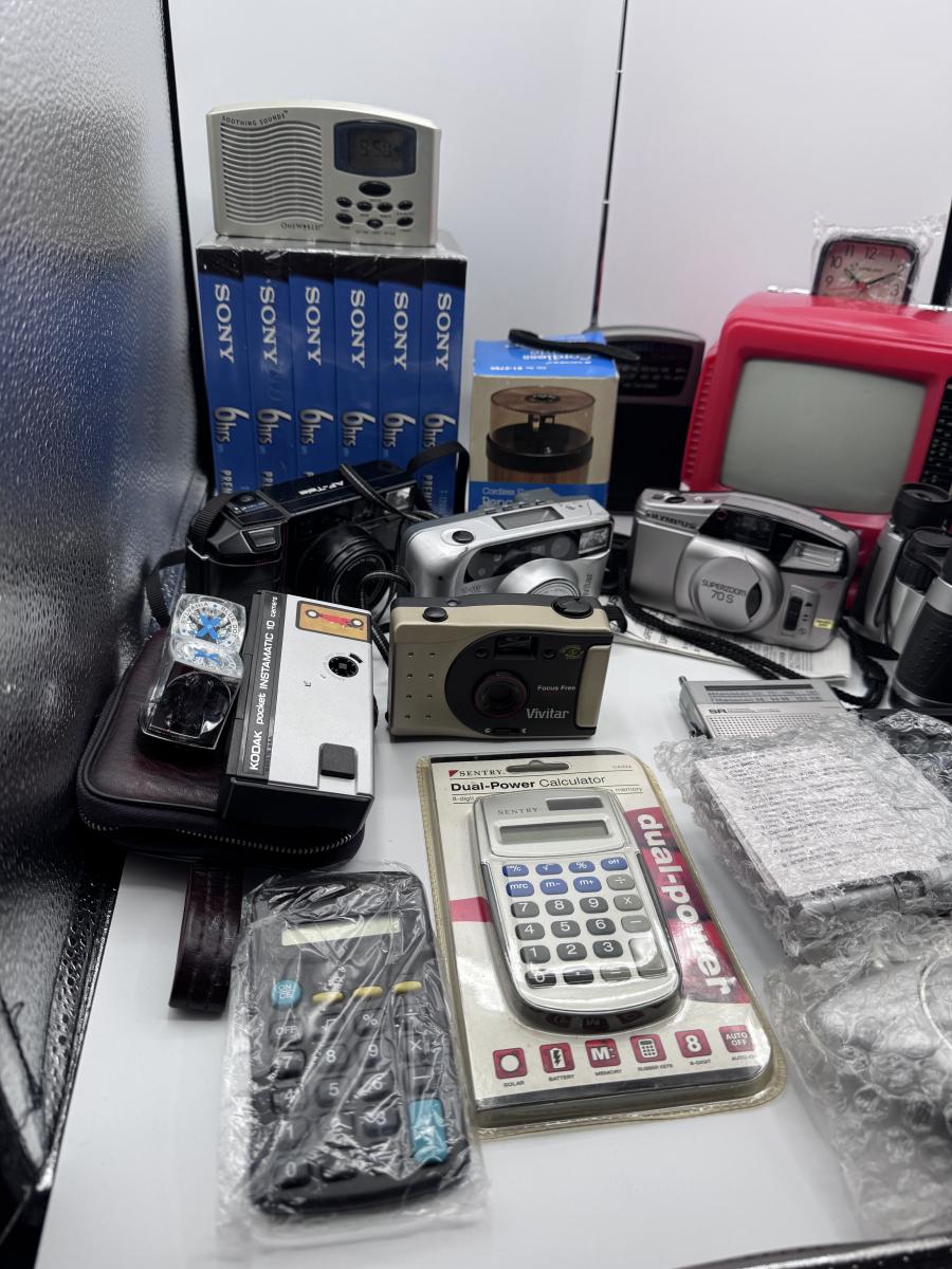 Cameras, brand new blank VHS tapes, vintage TV, brand new camera bag and more.