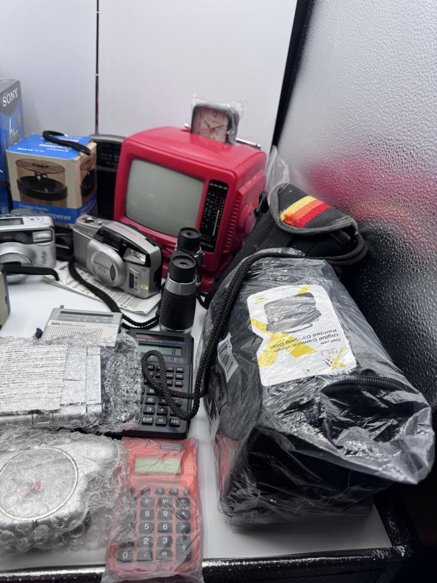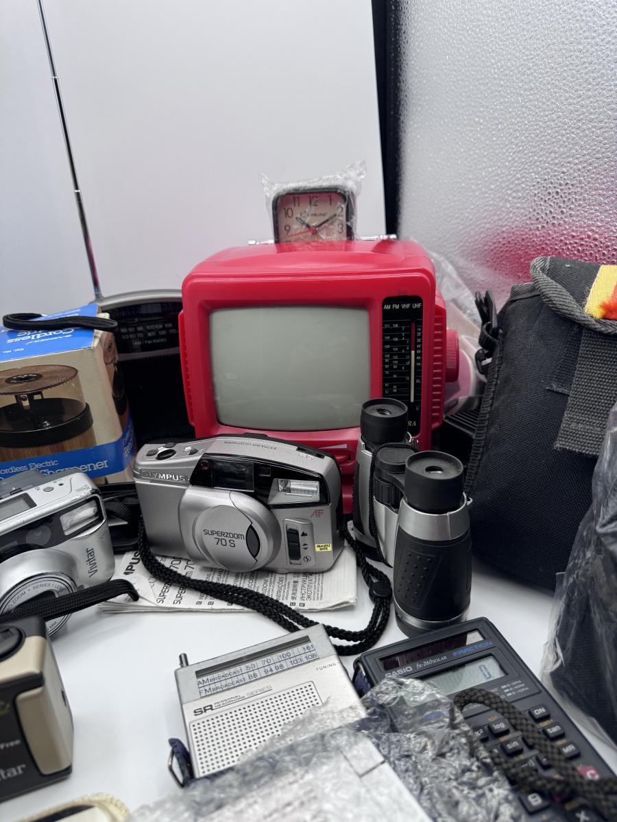 Cameras, brand new blank VHS tapes, vintage TV, brand new camera bag and more.
