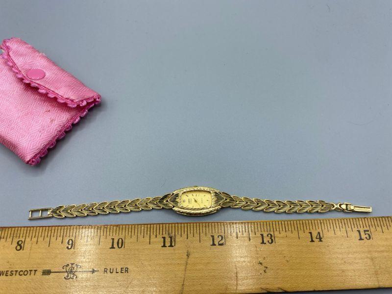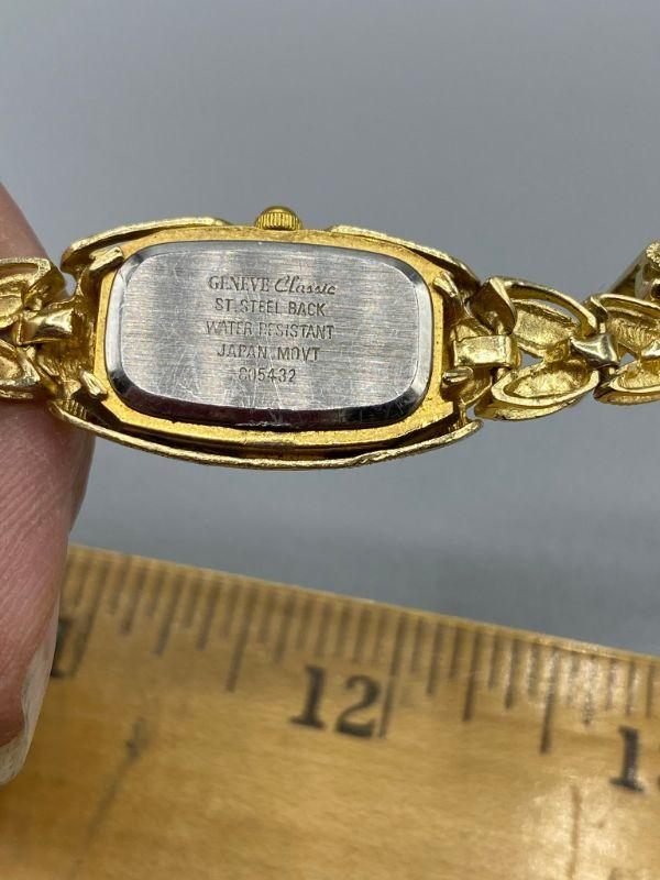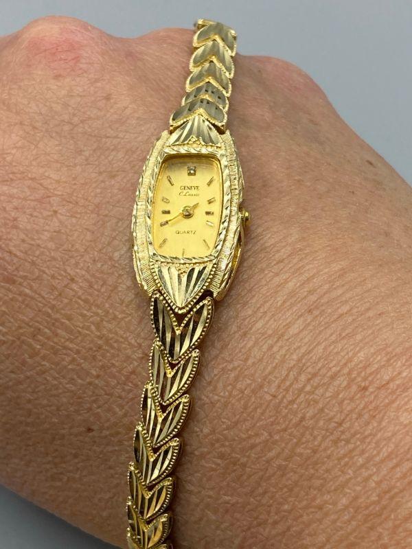 Elegant 14k yellow gold watch. Highly etched and textured 14k band made to fit a rectangular watch face. Currently it has a Geneva Classic watch face, not running. Face is held in by 4 small prongs. You could have a different face fitted in. without the face total weight is 13.8g. Beautiful piece of jewelry, the cuts and texture give it a sparkle in a way. About 7" length. Stamped on the clasp end.
