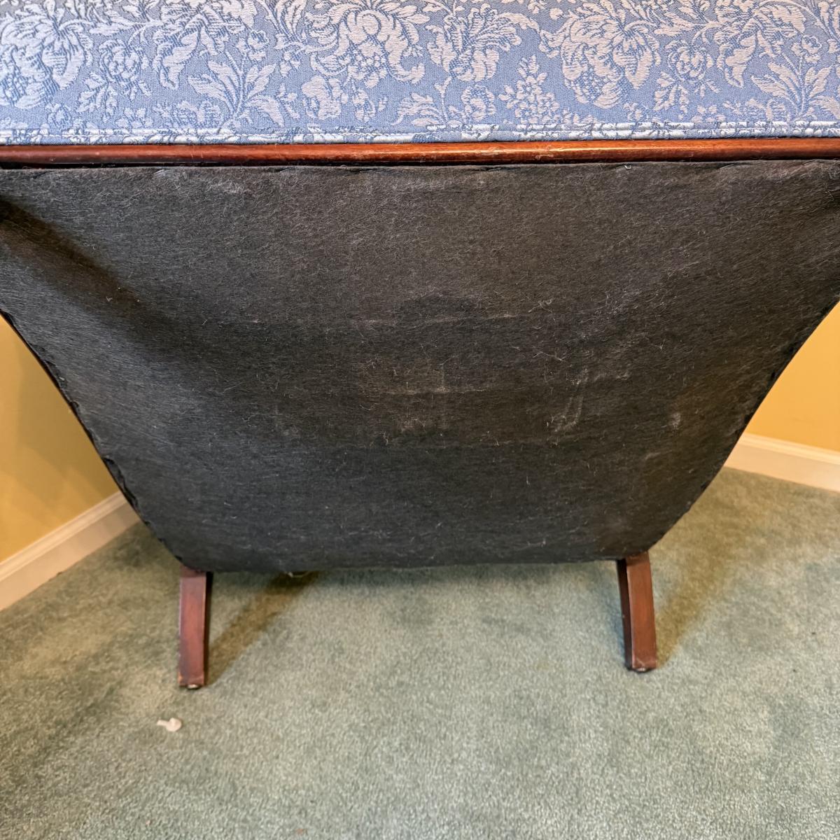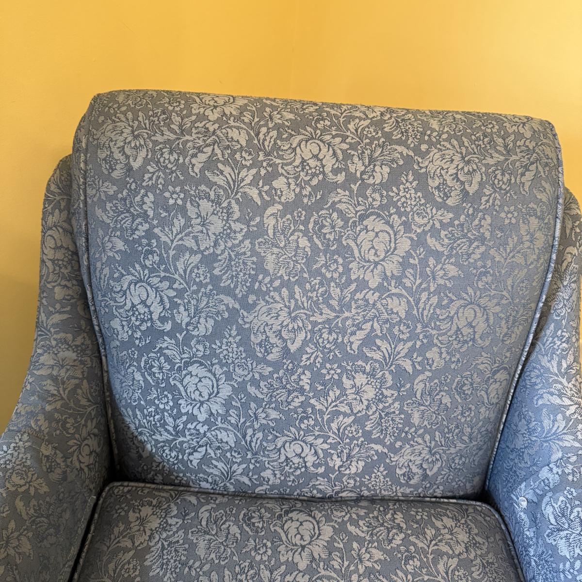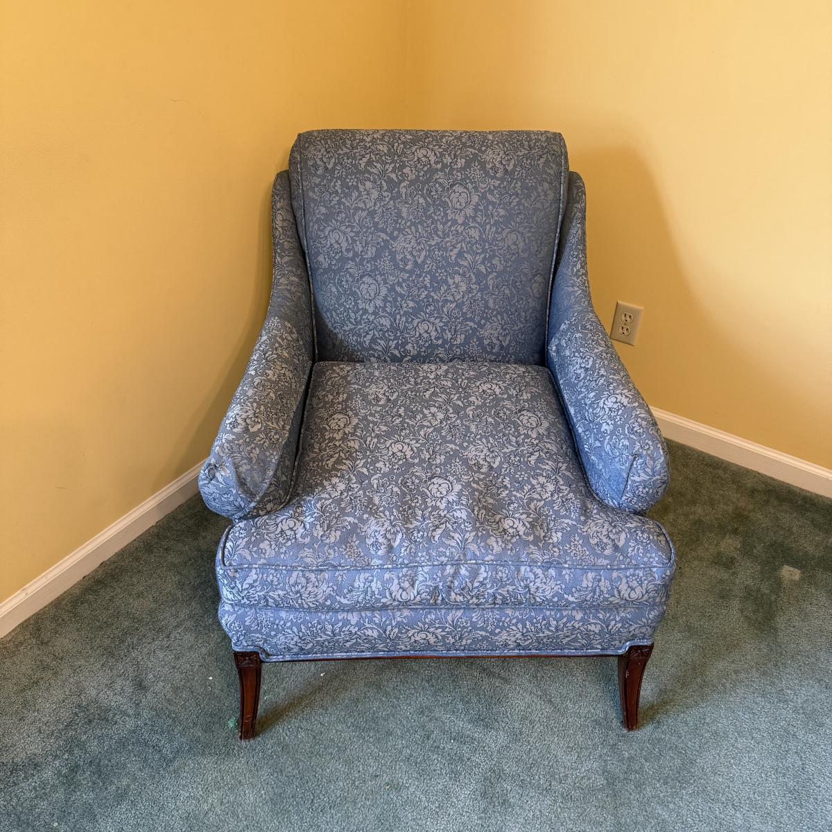 Elegant blue and silver floral armchair with carved front feet. The upholstery looks very nice and chair is heavier than it looks. The arm covers are lightly attached by upholstery buttons. Piece measures 28” x 34” x 32”H with a seat height at 17”H. Winning bidder must bring assistance to help move and load this item due to its weight and/or size. Items is near garage with one small step down from the home.