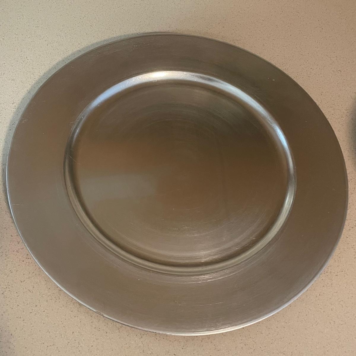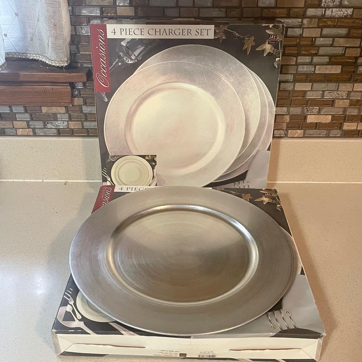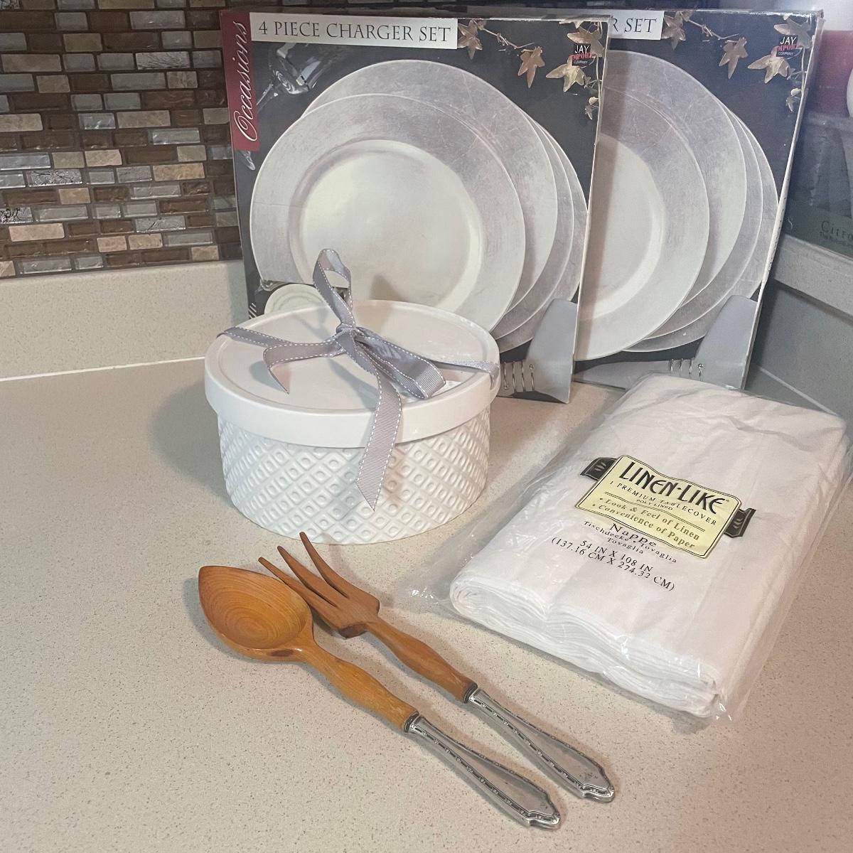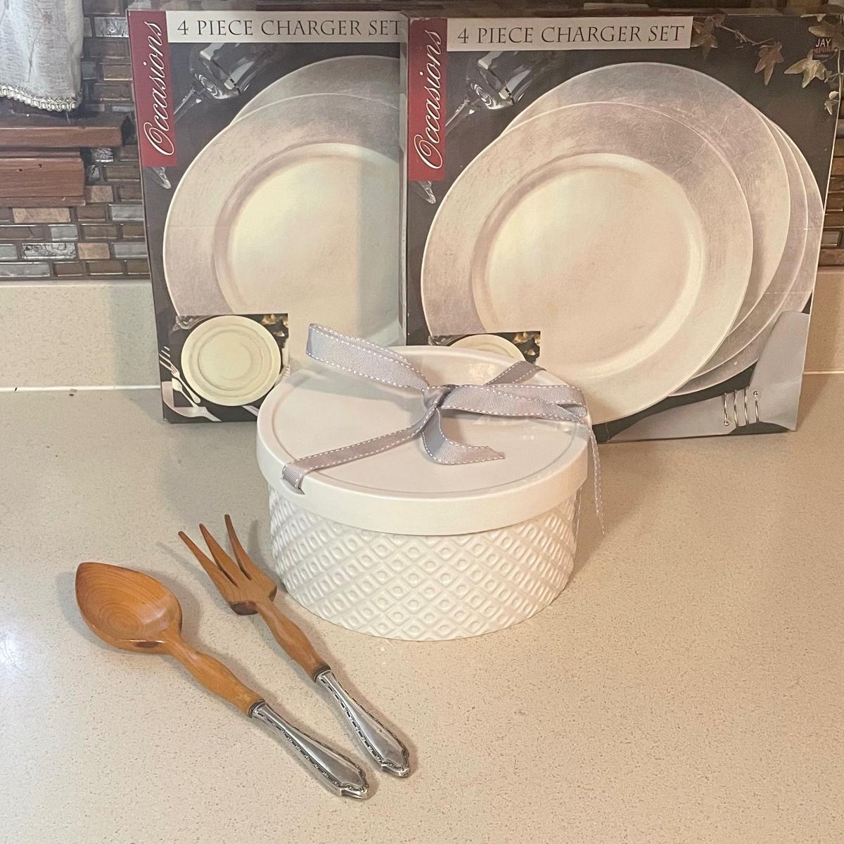 This lovely assortment of items would make ideal wedding present gifts or certainly will add elegance when you entertain! Included are a wooden salad servers (fork and spoon)with silver colored metal handles, a Mikasa lidded bowl, 8 silver colored plastic charger plates NIB, and a linen-like table cloth.