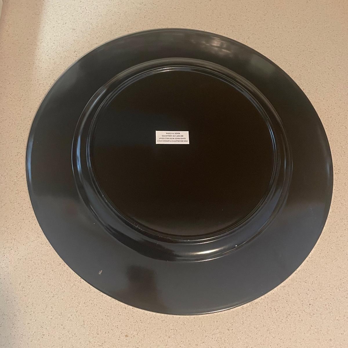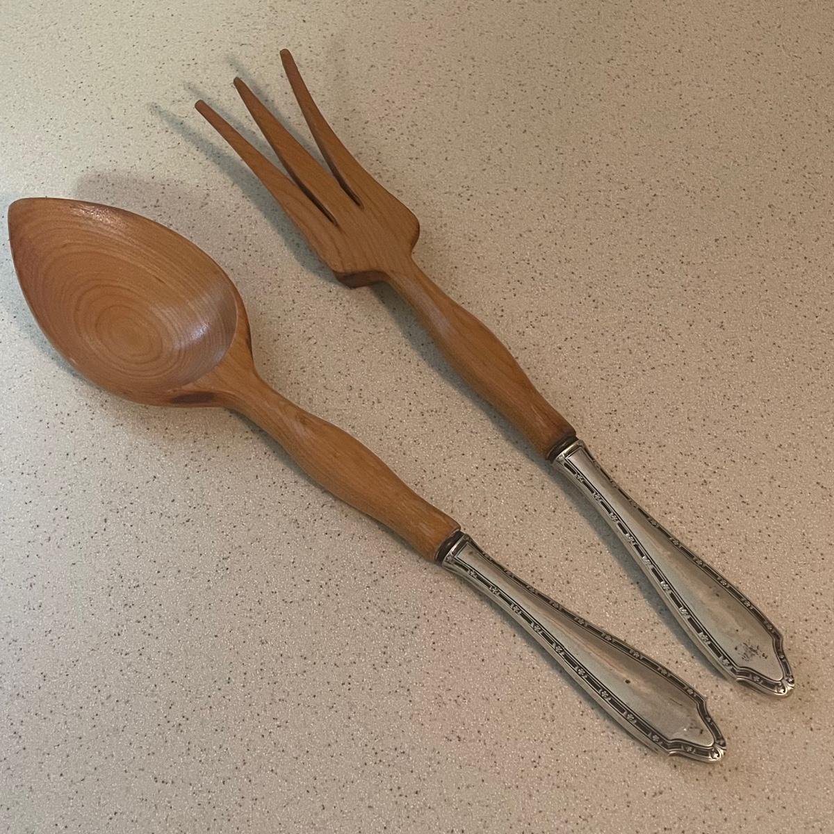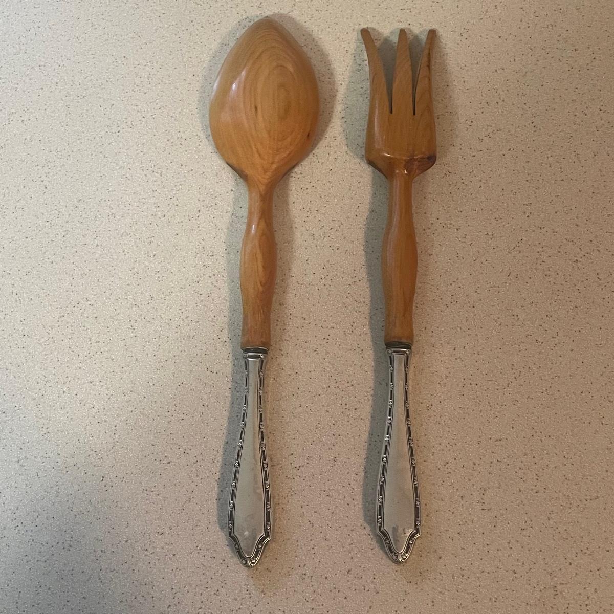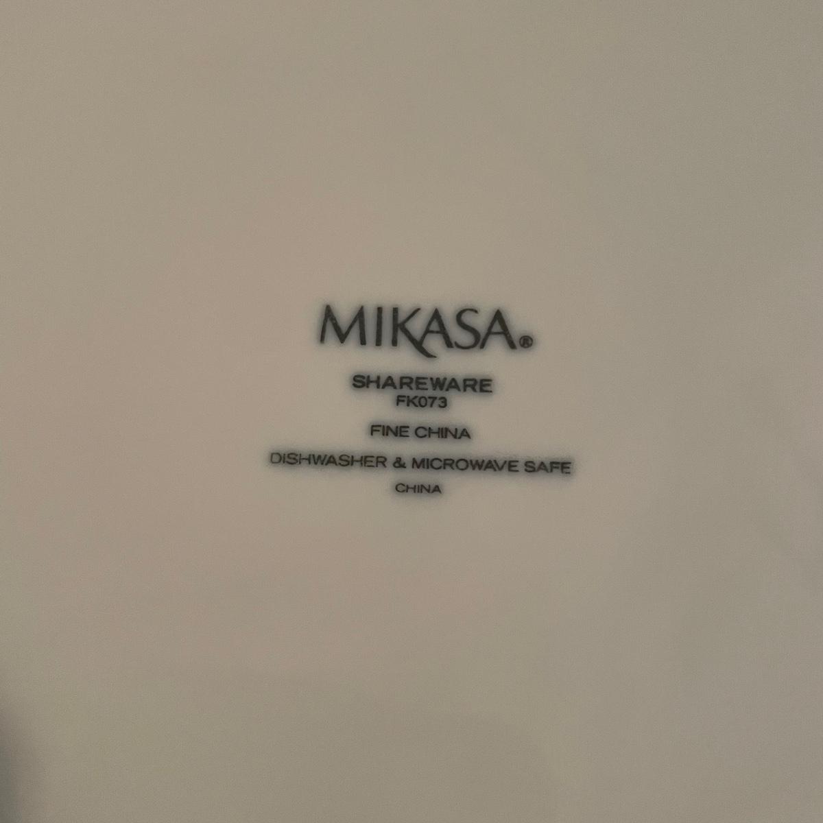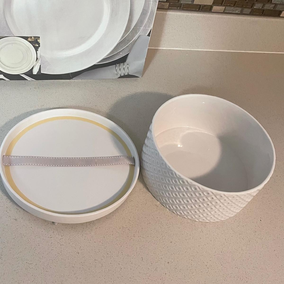 This lovely assortment of items would make ideal wedding present gifts or certainly will add elegance when you entertain! Included are a wooden salad servers (fork and spoon)with silver colored metal handles, a Mikasa lidded bowl, 8 silver colored plastic charger plates NIB, and a linen-like table cloth.