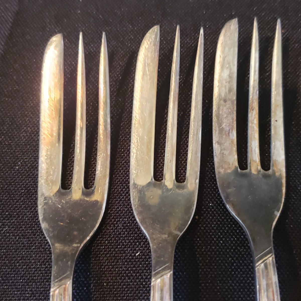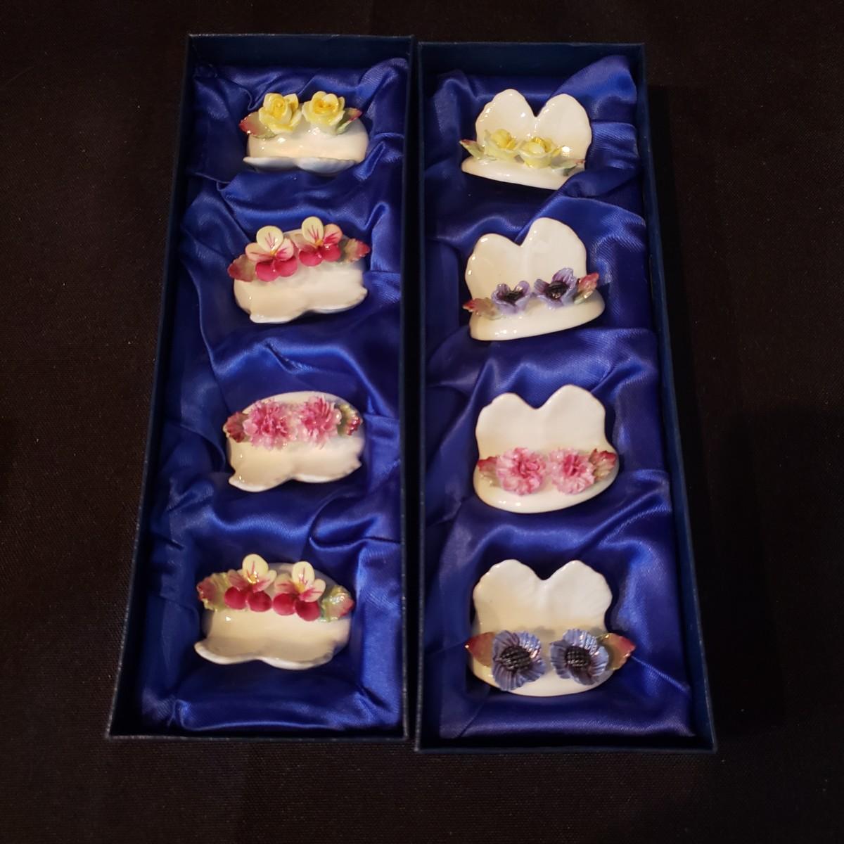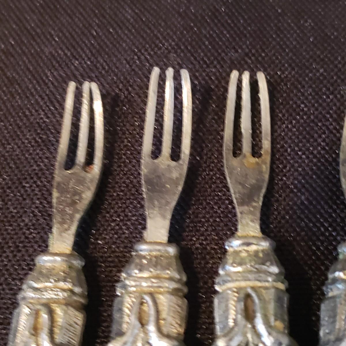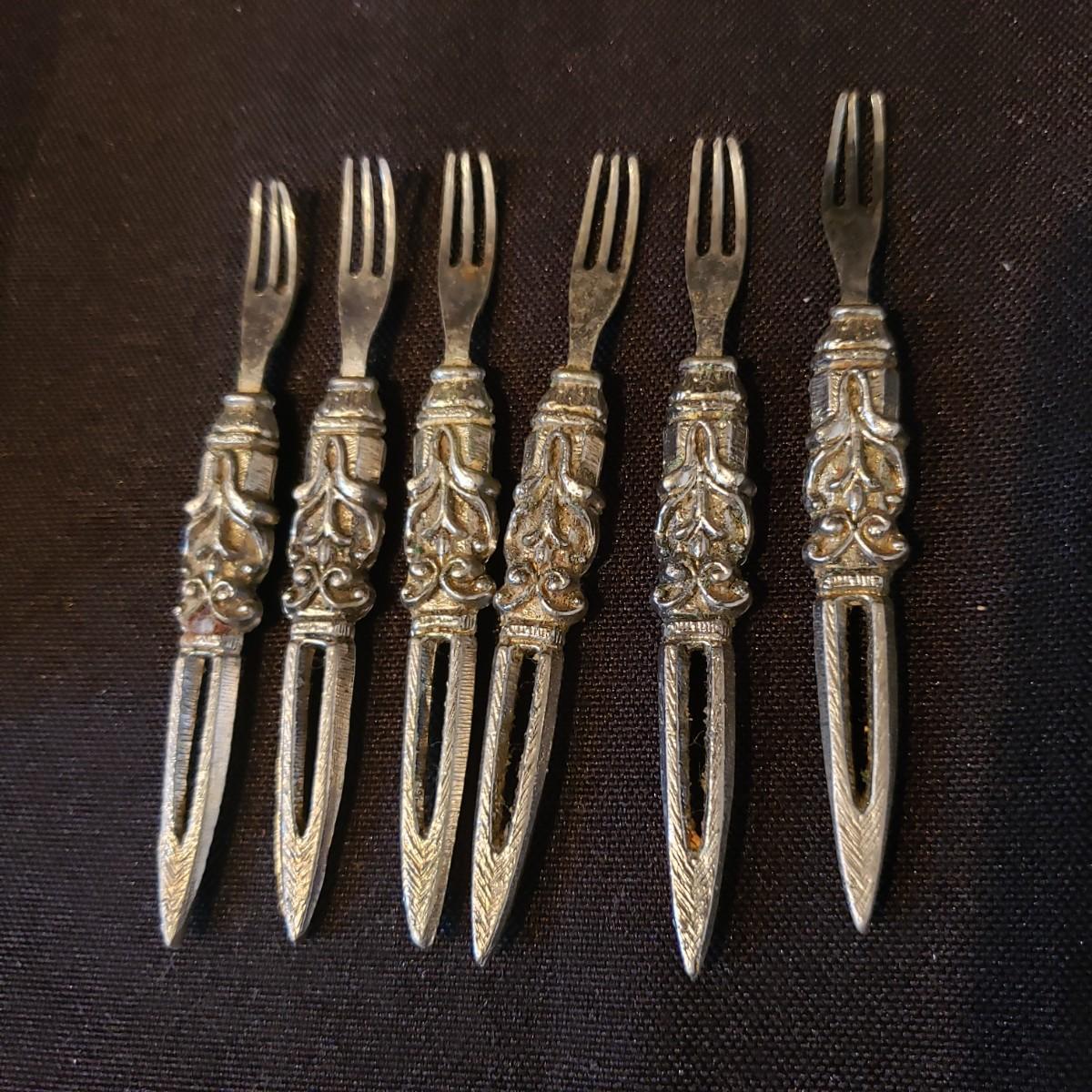 This elegant entertaining lot features six Sheffield forks with ornate handles, and eight crystal salt dishes with shell spoons. The vintage set of six cocktail forks have beautiful craftsmanship in the detailing. There appears to be no markings on these, but it's hard to tell, see pictures. Finally, there are eight card holders made by Ainsley and are fine bone china.