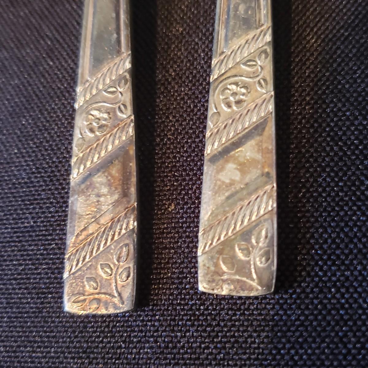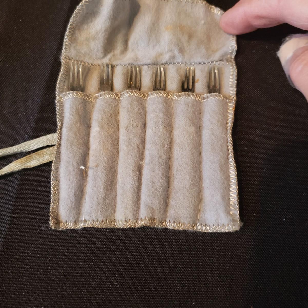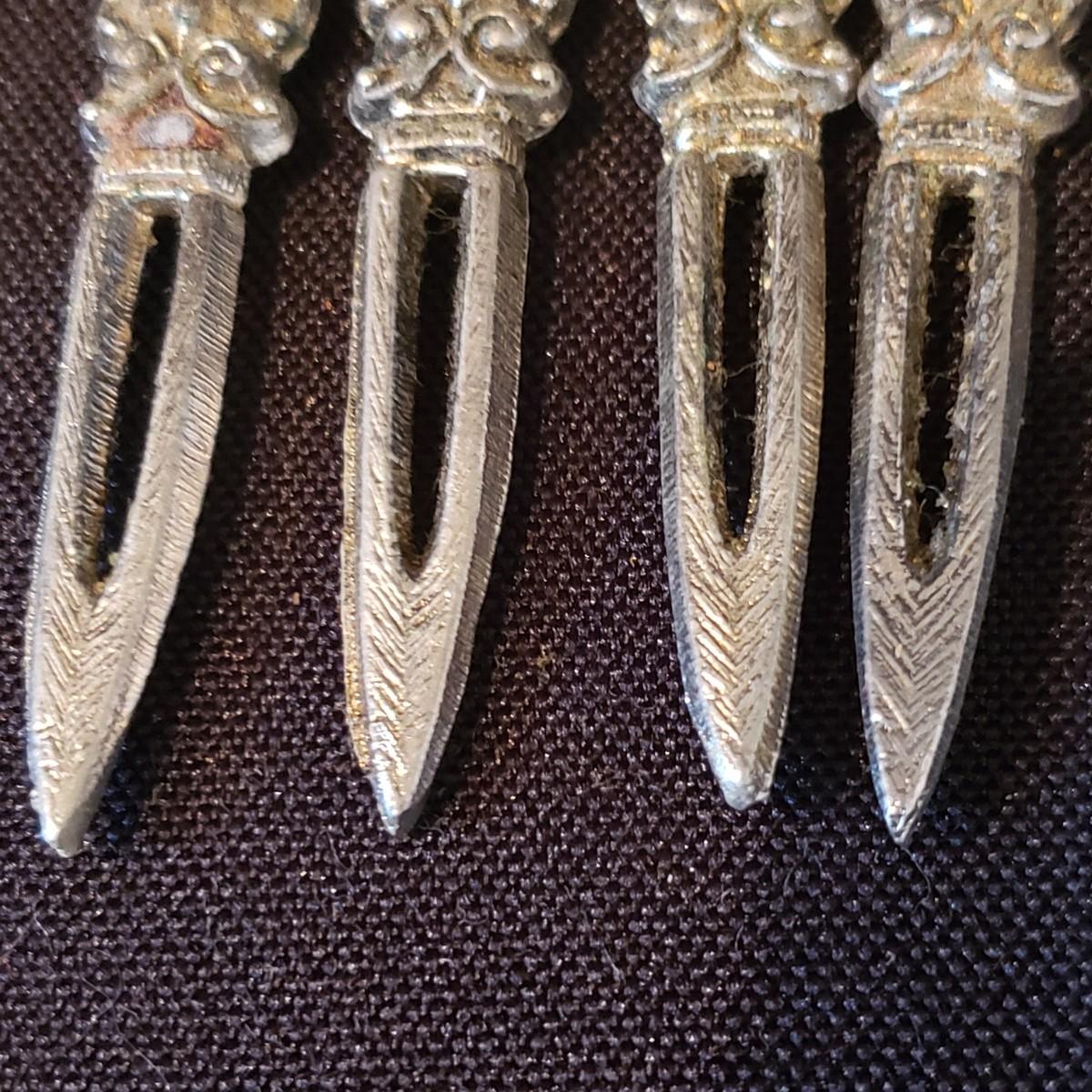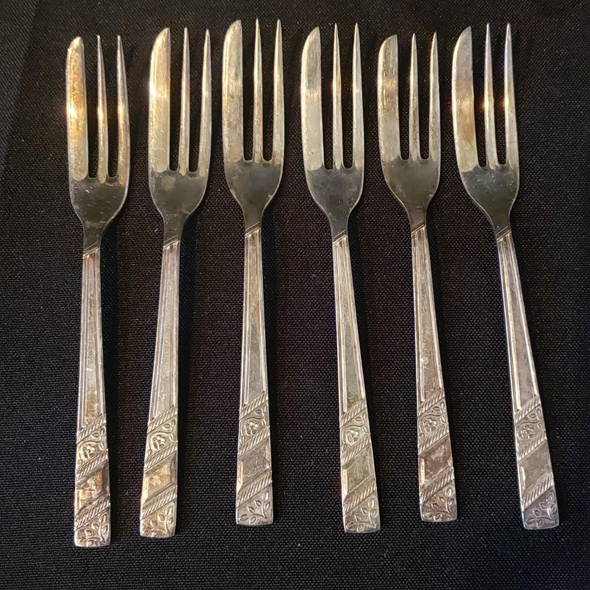 This elegant entertaining lot features six Sheffield forks with ornate handles, and eight crystal salt dishes with shell spoons. The vintage set of six cocktail forks have beautiful craftsmanship in the detailing. There appears to be no markings on these, but it's hard to tell, see pictures. Finally, there are eight card holders made by Ainsley and are fine bone china.
