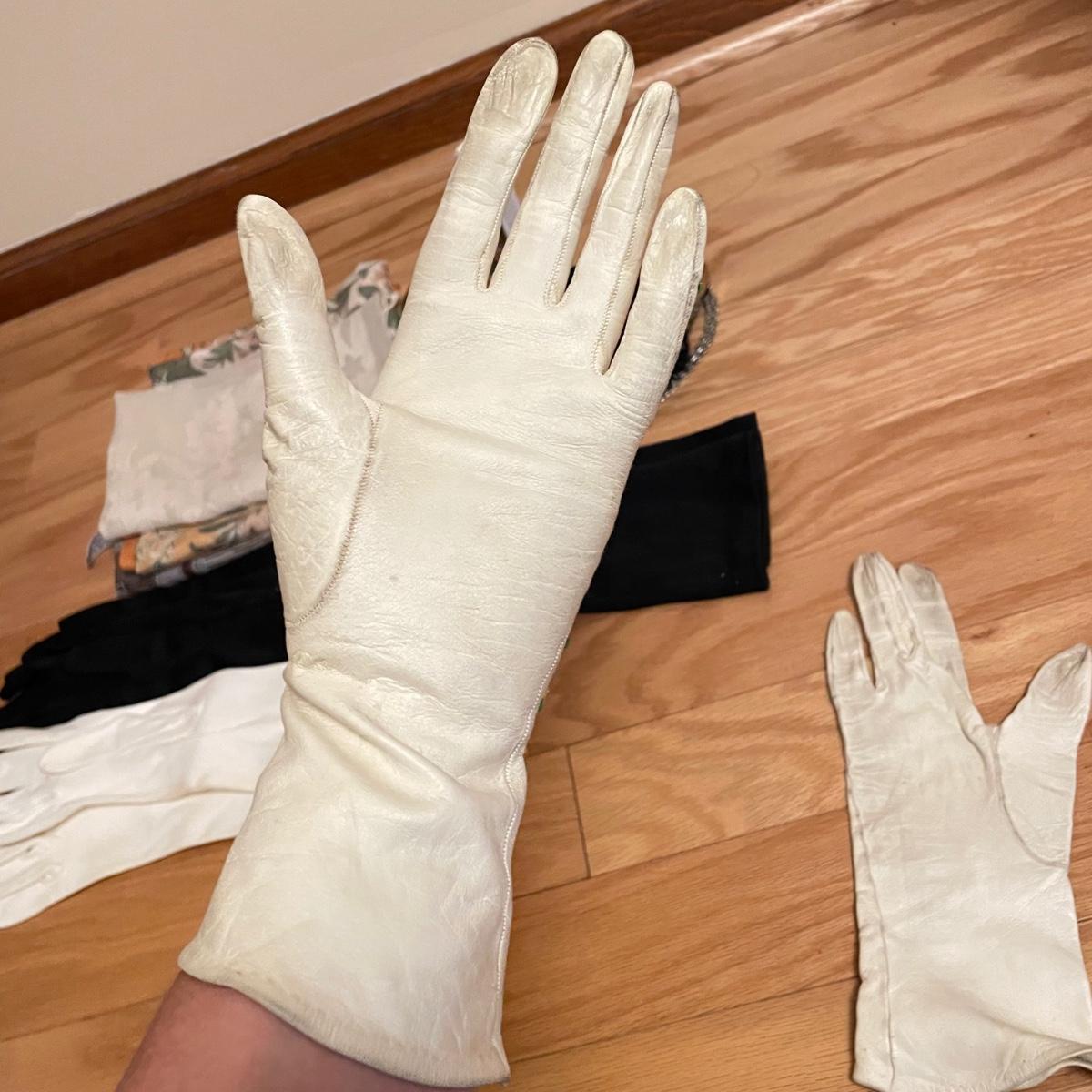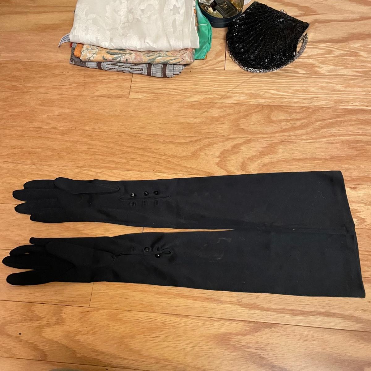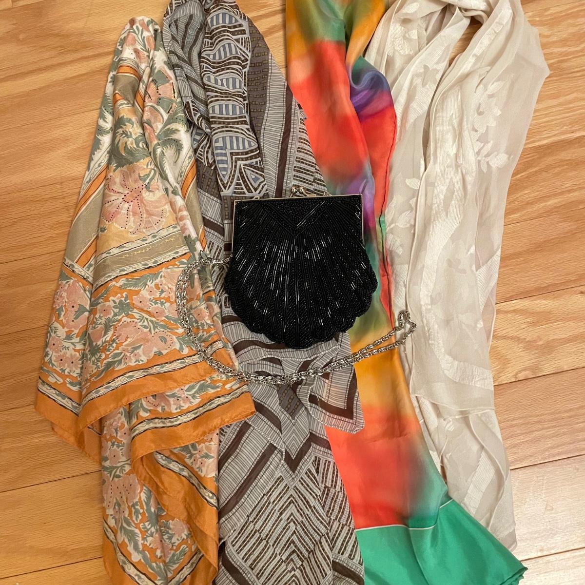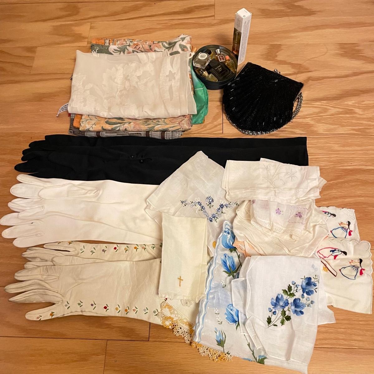Elegant lot with four silk scarves a beaded Apt 9 purse, nine travel/promo sized perfume bottles (the Ralph Lauren is the largest at .34oz and comes with its original packaging. Lot also includes three pairs of gloves and a handful of handkerchiefs. The embroidered gloves feel like leather, both ivory pairs show stains. The largest scarf is the Adrienne Vittadini at 34”sq, the sheer ivory scarf is 40” long, the colorful rectangular scarf is 54” long. Three of the four scarves show 100% silk on their tags, the Halston is tag-less, but feels like silk. We cannot verify any contents of the perfume bottles. See images. Shipping available.