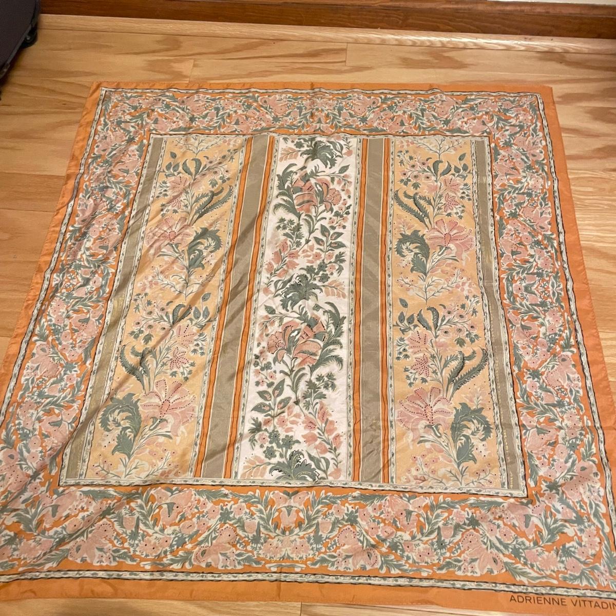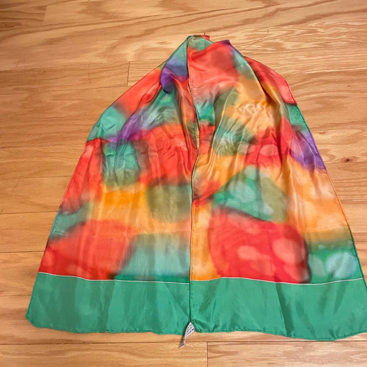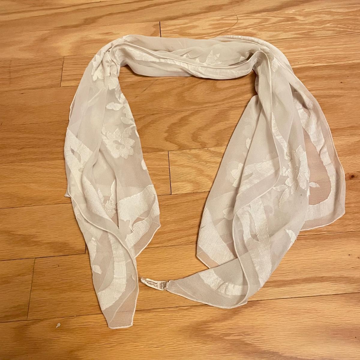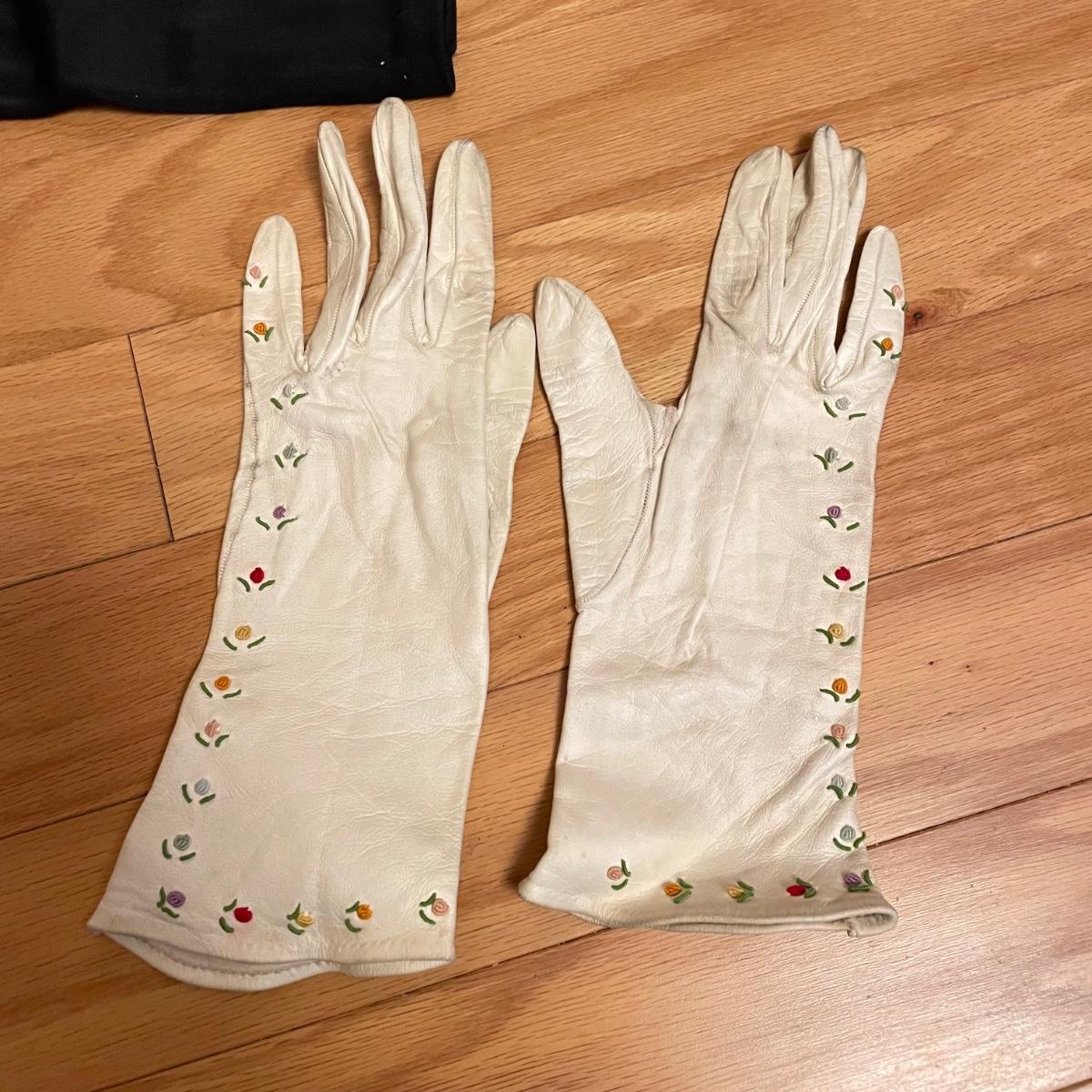 Elegant lot with four silk scarves a beaded Apt 9 purse, nine travel/promo sized perfume bottles (the Ralph Lauren is the largest at .34oz and comes with its original packaging. Lot also includes three pairs of gloves and a handful of handkerchiefs. The embroidered gloves feel like leather, both ivory pairs show stains. The largest scarf is the Adrienne Vittadini at 34”sq, the sheer ivory scarf is 40” long, the colorful rectangular scarf is 54” long. Three of the four scarves show 100% silk on their tags, the Halston is tag-less, but feels like silk. We cannot verify any contents of the perfume bottles. See images. Shipping available.