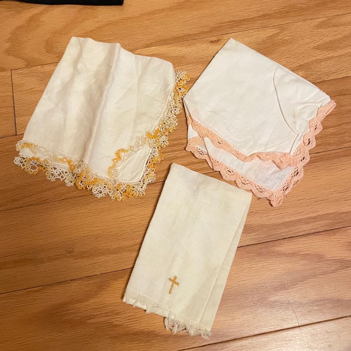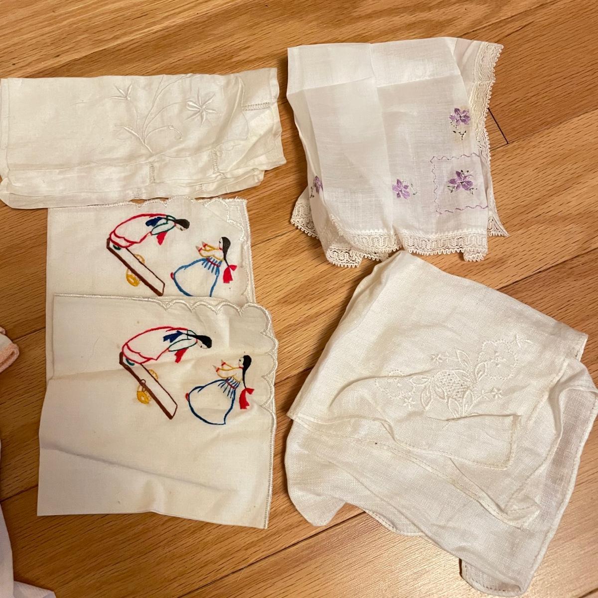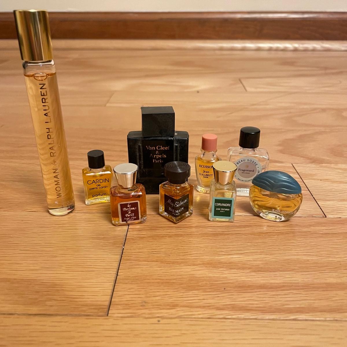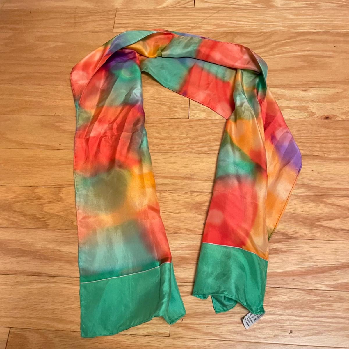 Elegant lot with four silk scarves a beaded Apt 9 purse, nine travel/promo sized perfume bottles (the Ralph Lauren is the largest at .34oz and comes with its original packaging. Lot also includes three pairs of gloves and a handful of handkerchiefs. The embroidered gloves feel like leather, both ivory pairs show stains. The largest scarf is the Adrienne Vittadini at 34”sq, the sheer ivory scarf is 40” long, the colorful rectangular scarf is 54” long. Three of the four scarves show 100% silk on their tags, the Halston is tag-less, but feels like silk. We cannot verify any contents of the perfume bottles. See images. Shipping available.