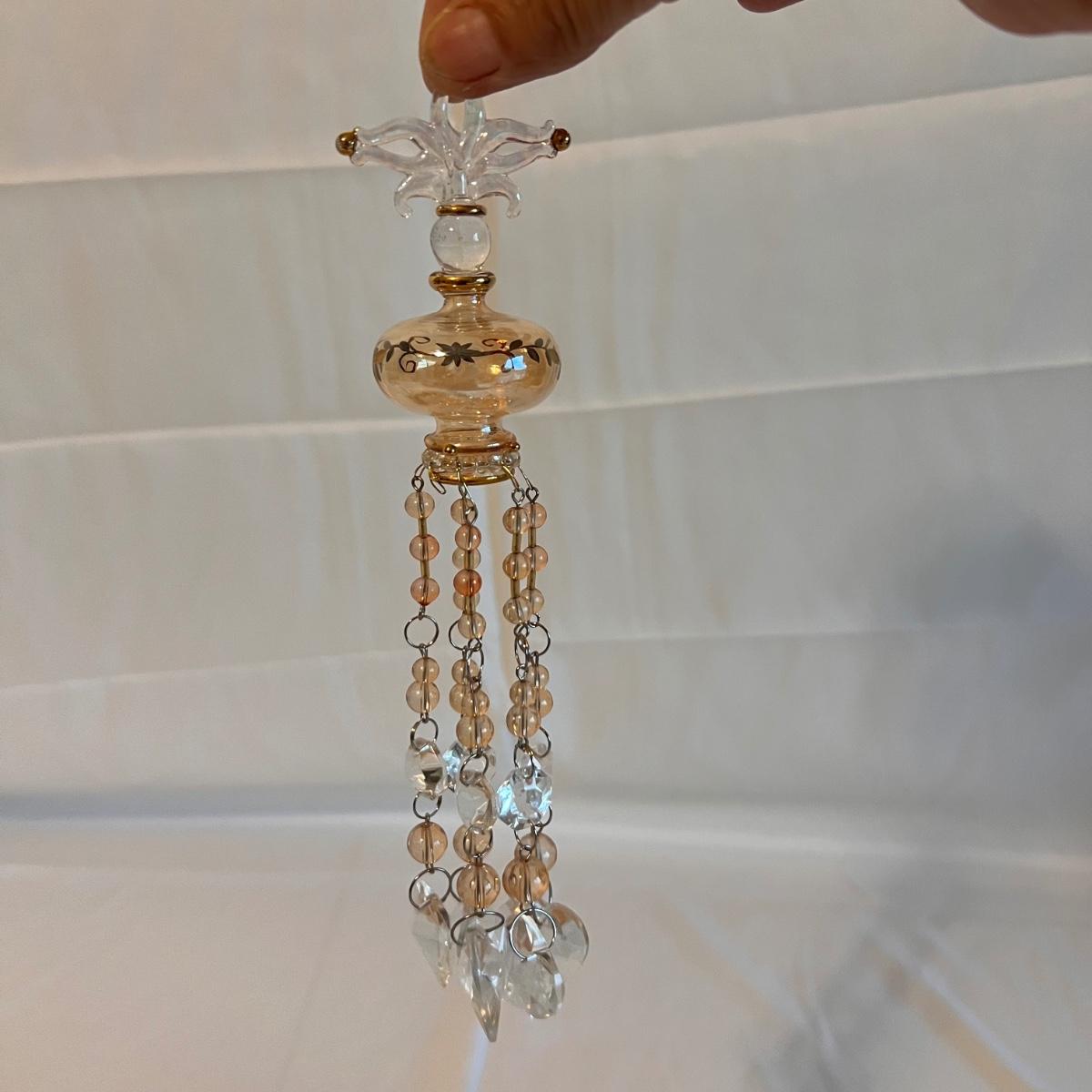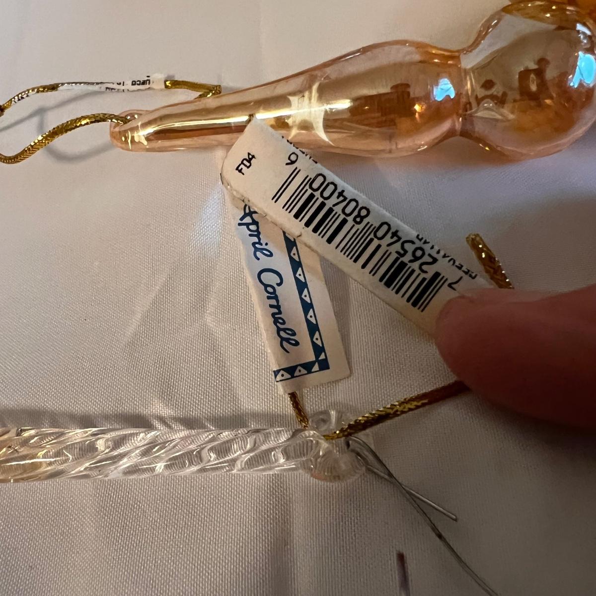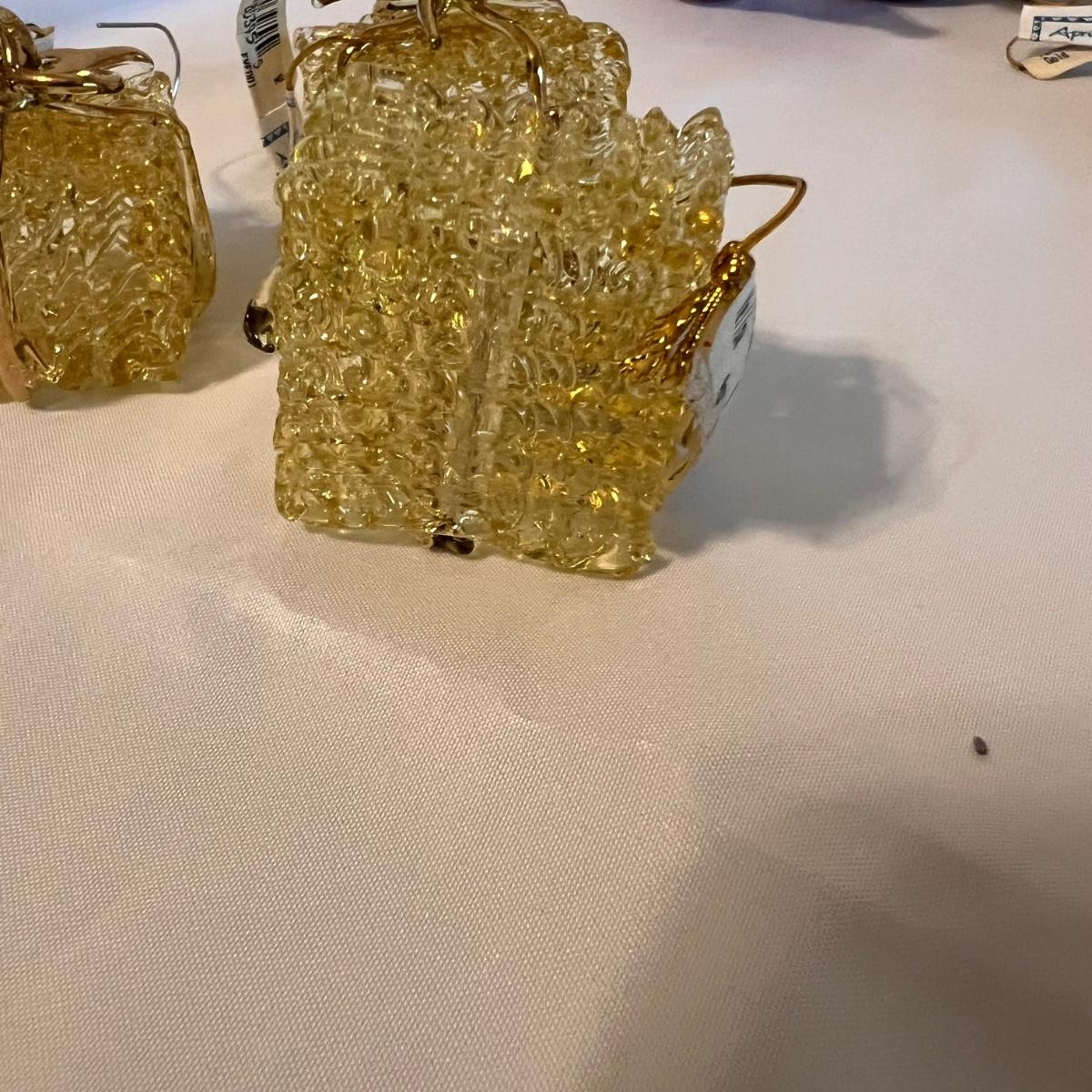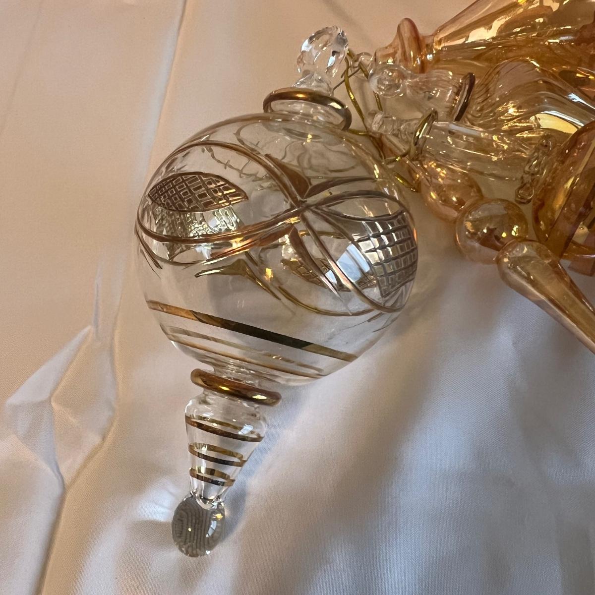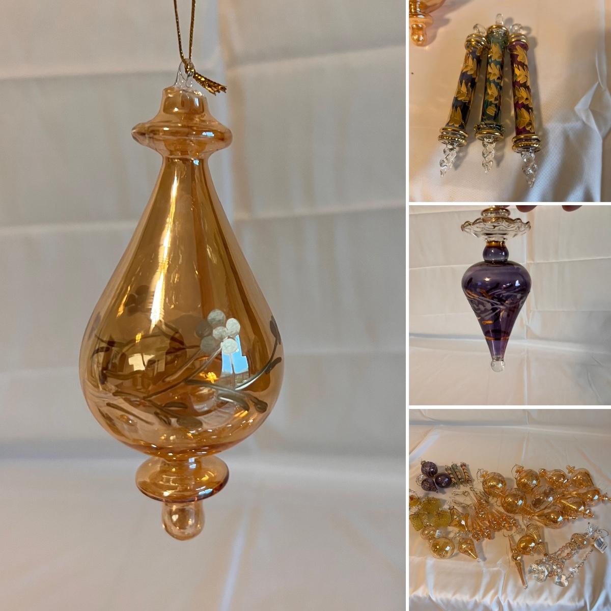 Over 30 glass ornaments in this lot. The majority are finial shaped and an iridescent amber color. Most have gold colored and/or metal hooks, the rest need something added in order to hang them.