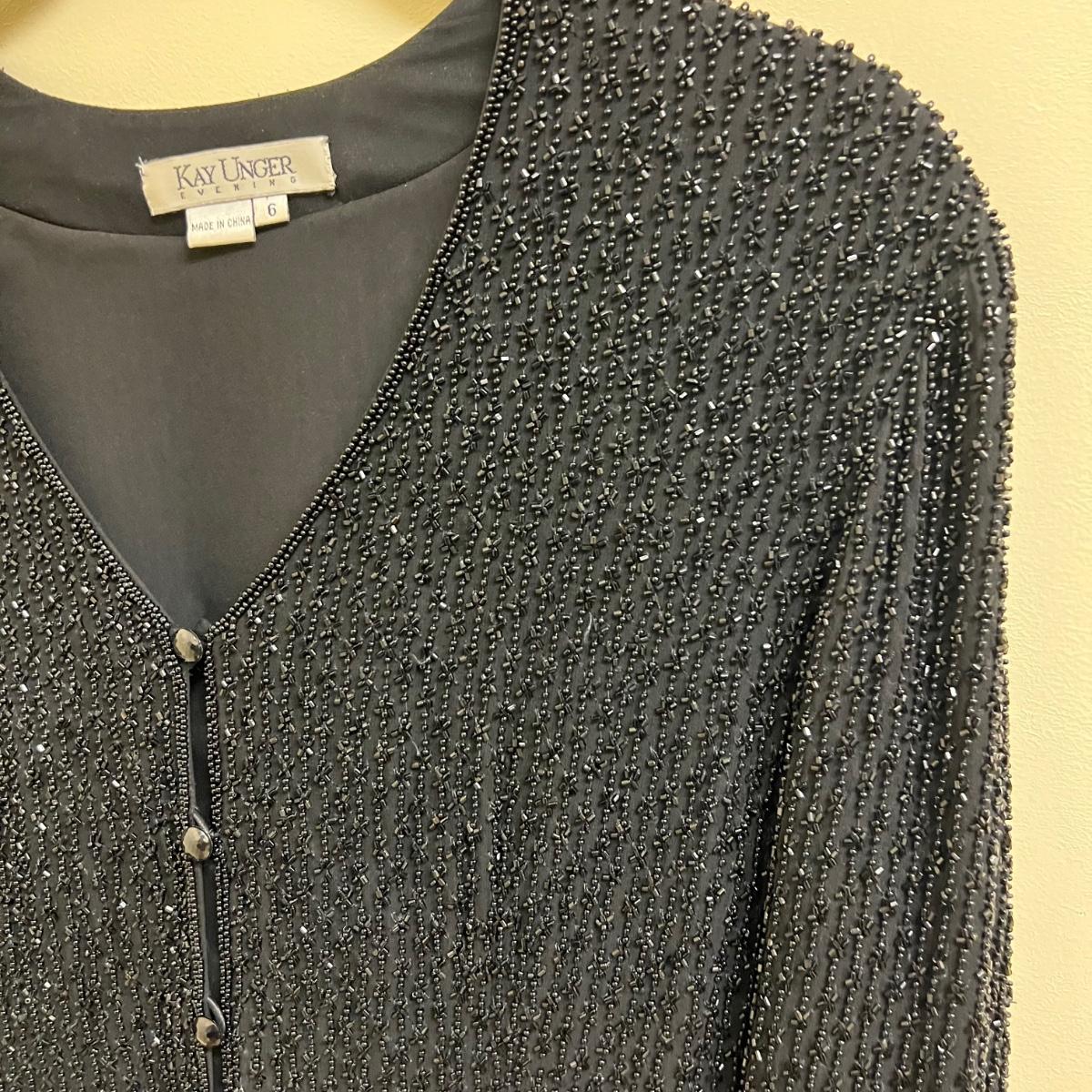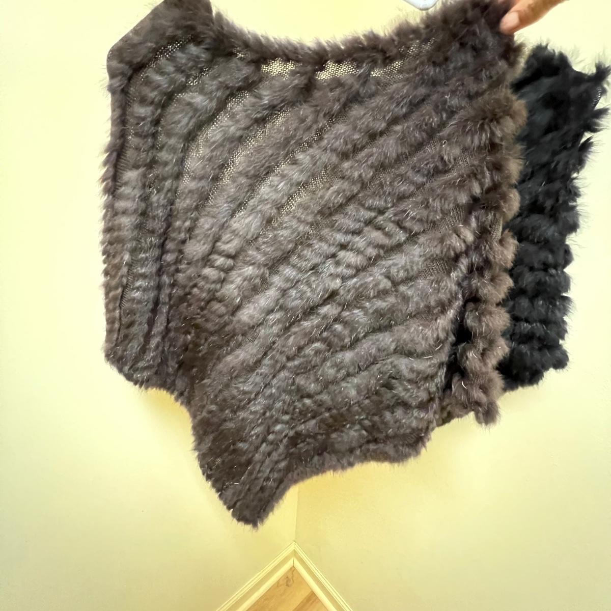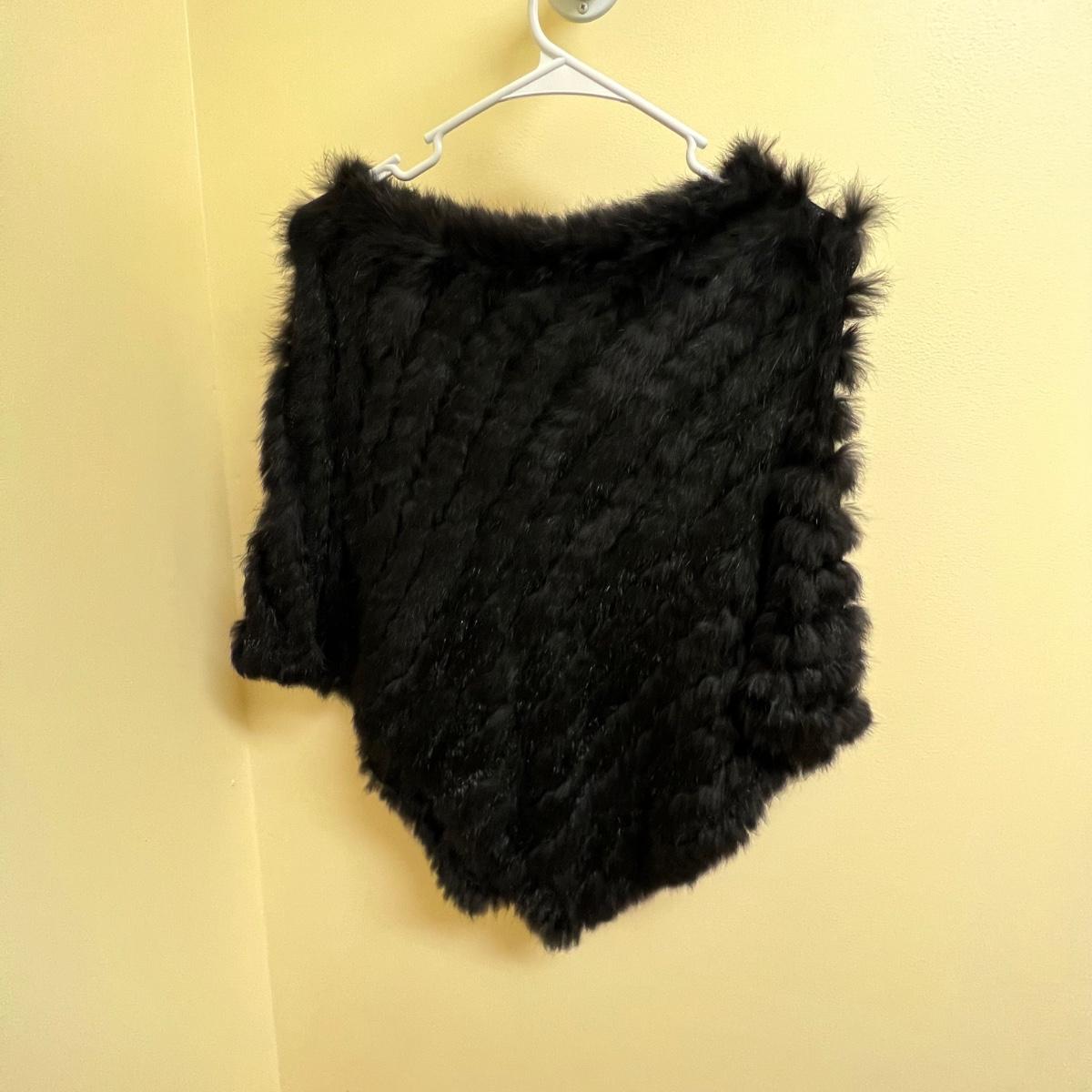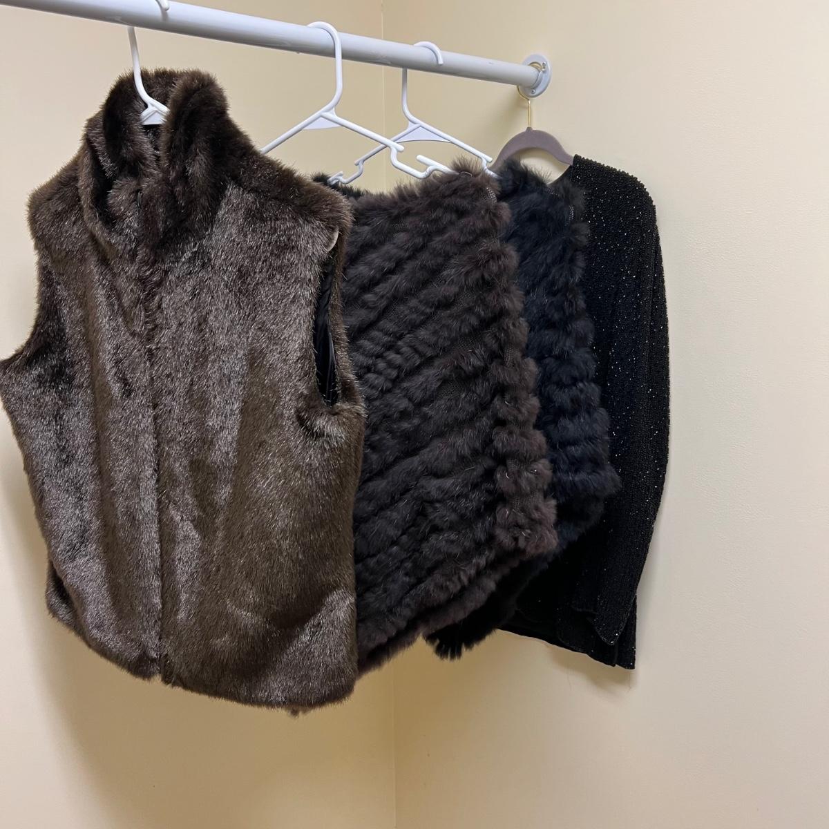 Three faux fur items of clothing in this lot includes a brown and a black matching ponchos and a zippered vest; vest is size 14, ponchos have no labels. The black beaded jacket is Kay Unger and size 6.