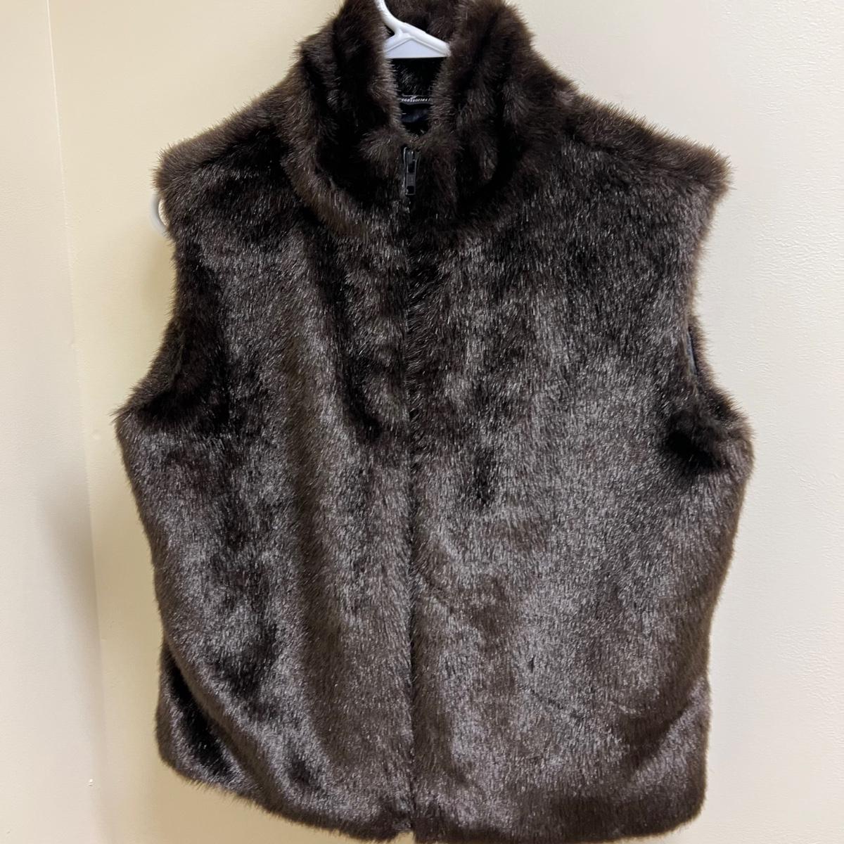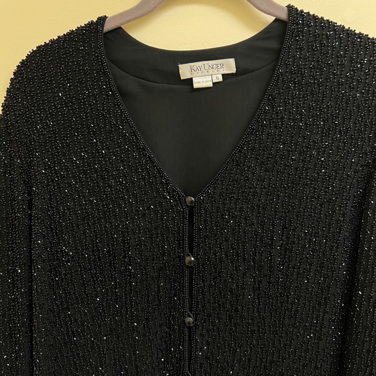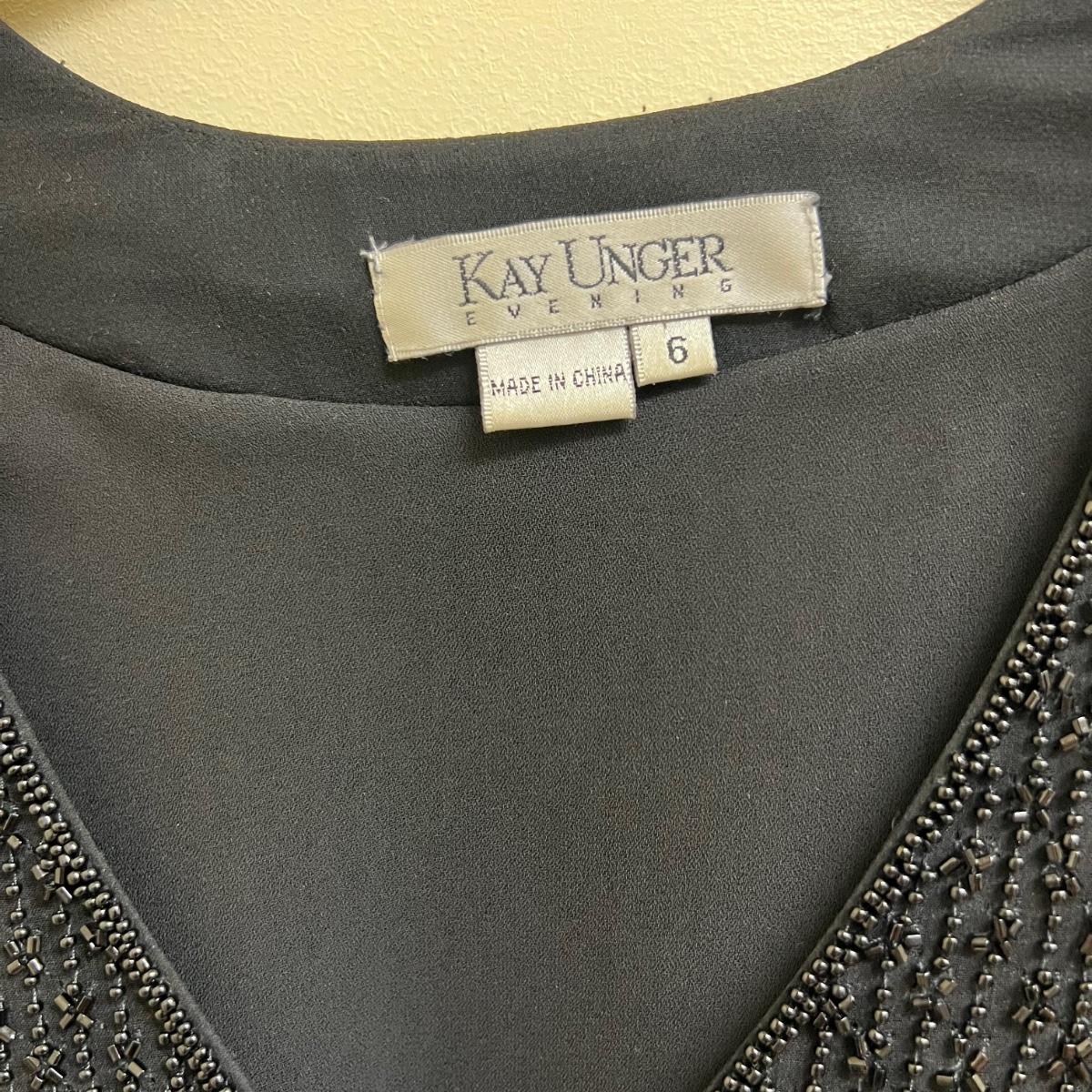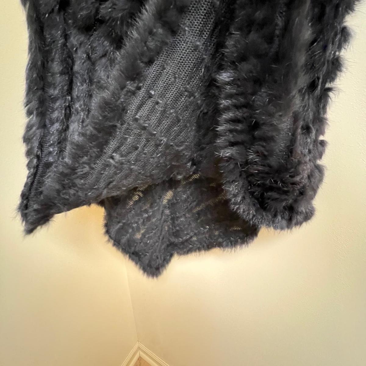 Three faux fur items of clothing in this lot includes a brown and a black matching ponchos and a zippered vest; vest is size 14, ponchos have no labels. The black beaded jacket is Kay Unger and size 6.