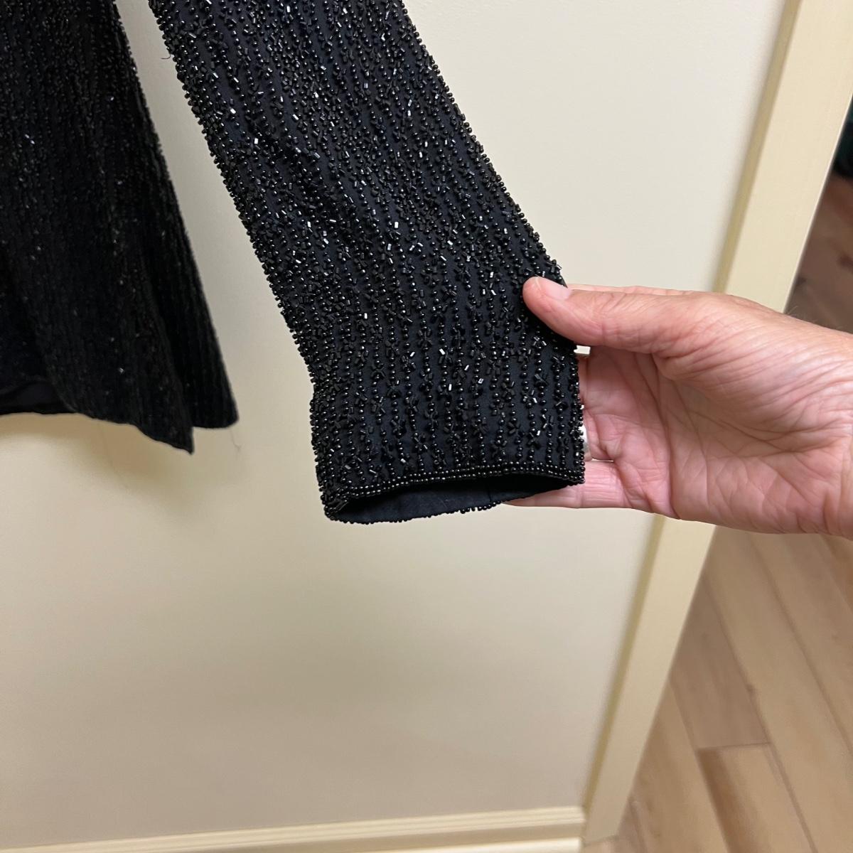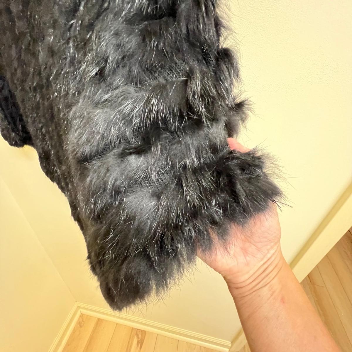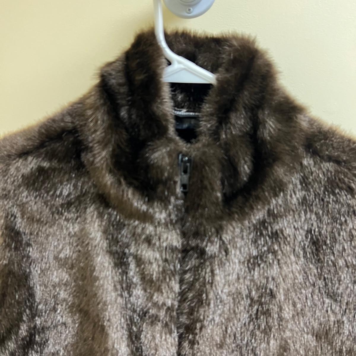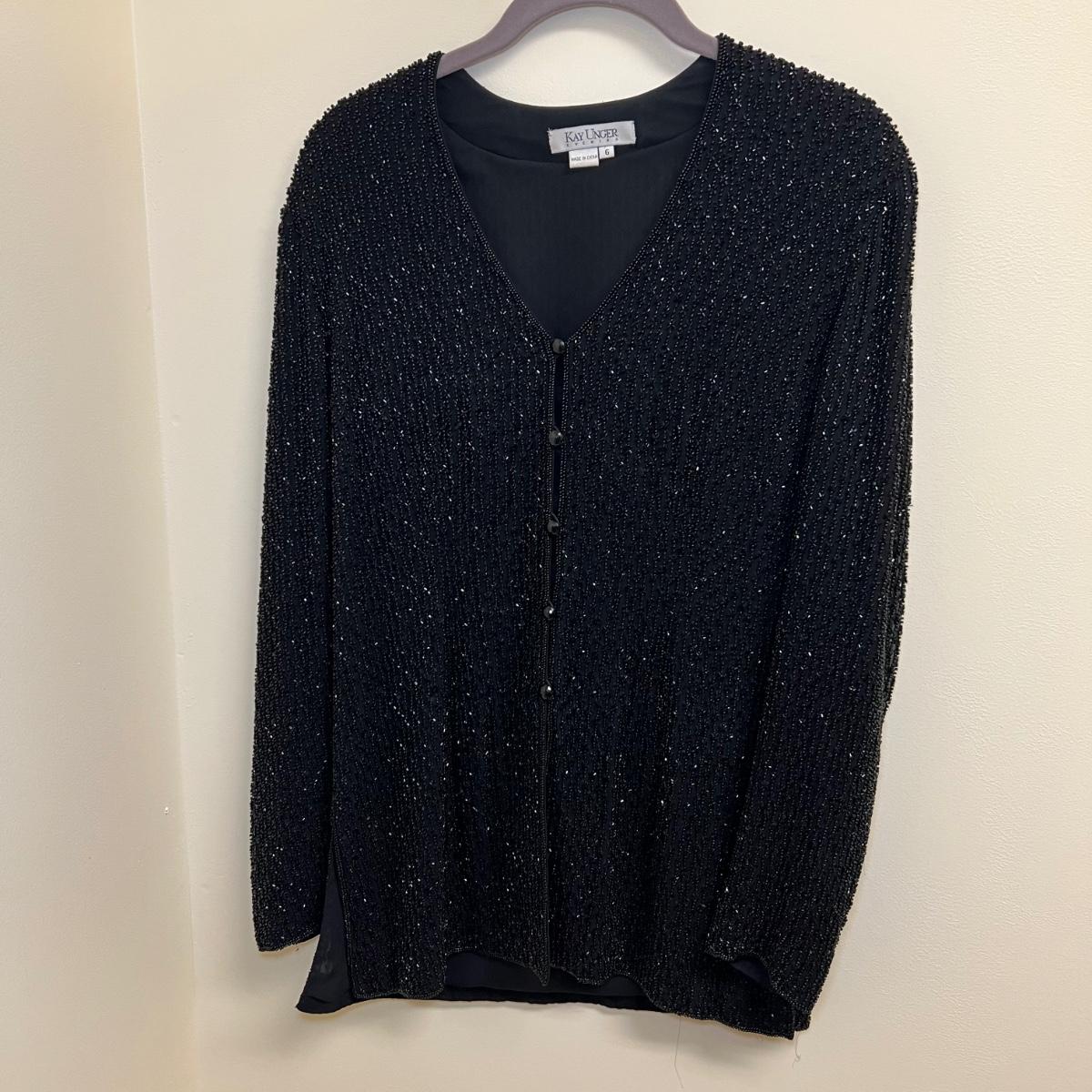 Three faux fur items of clothing in this lot includes a brown and a black matching ponchos and a zippered vest; vest is size 14, ponchos have no labels. The black beaded jacket is Kay Unger and size 6.