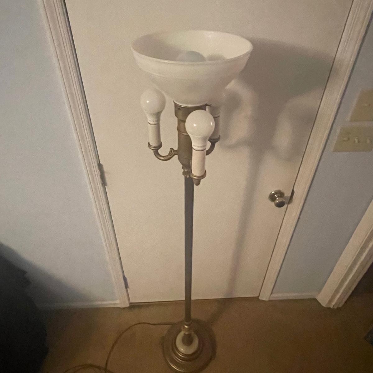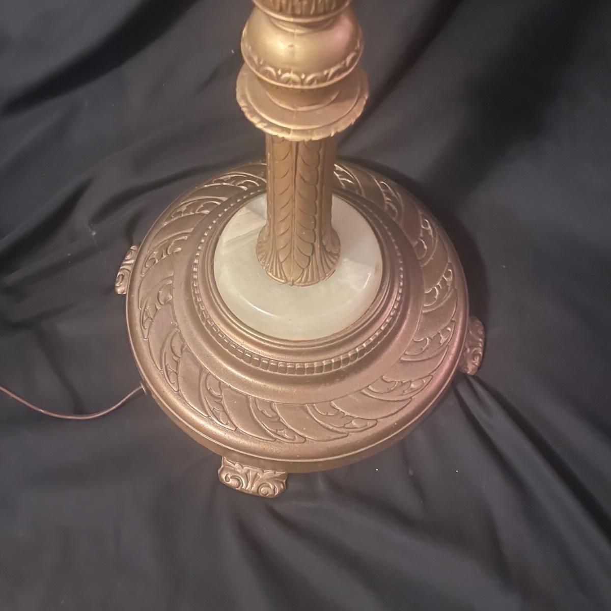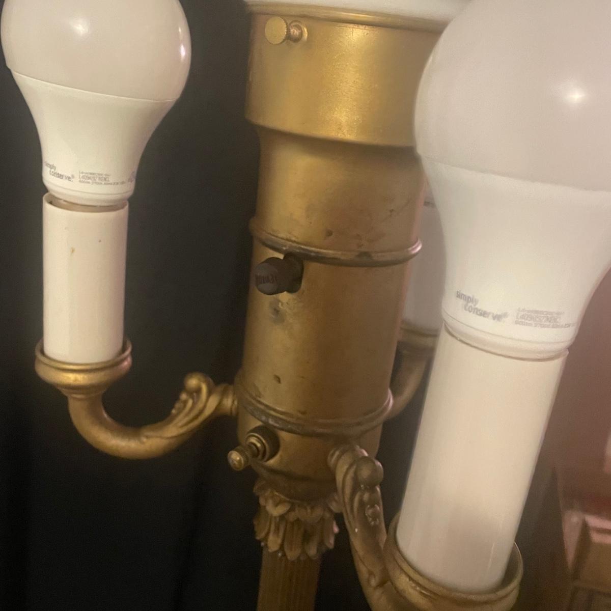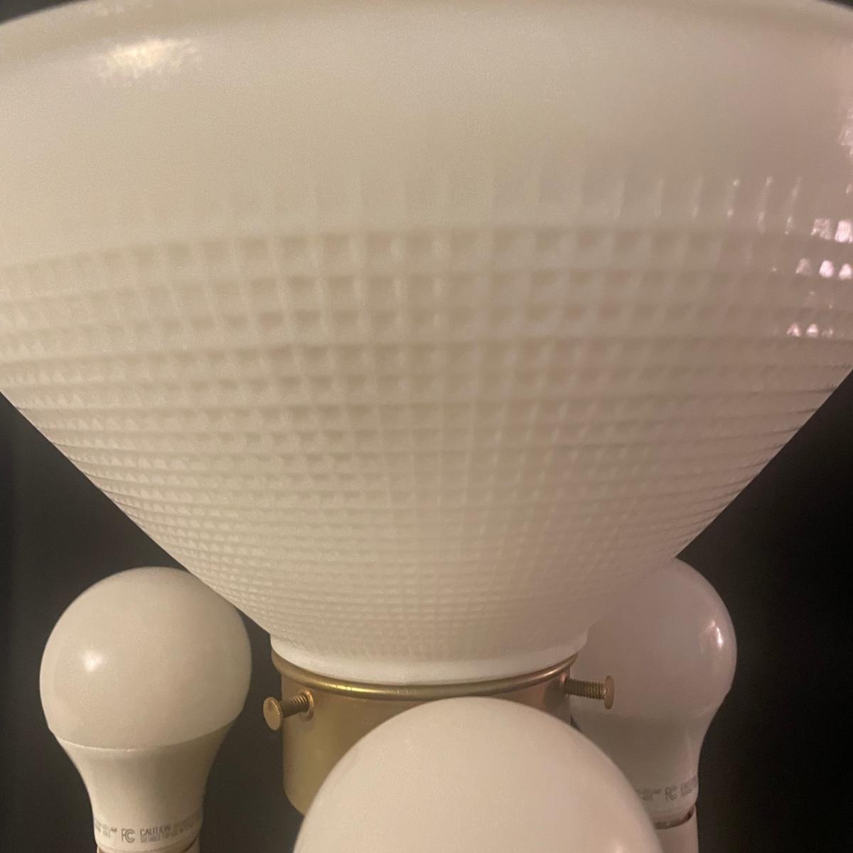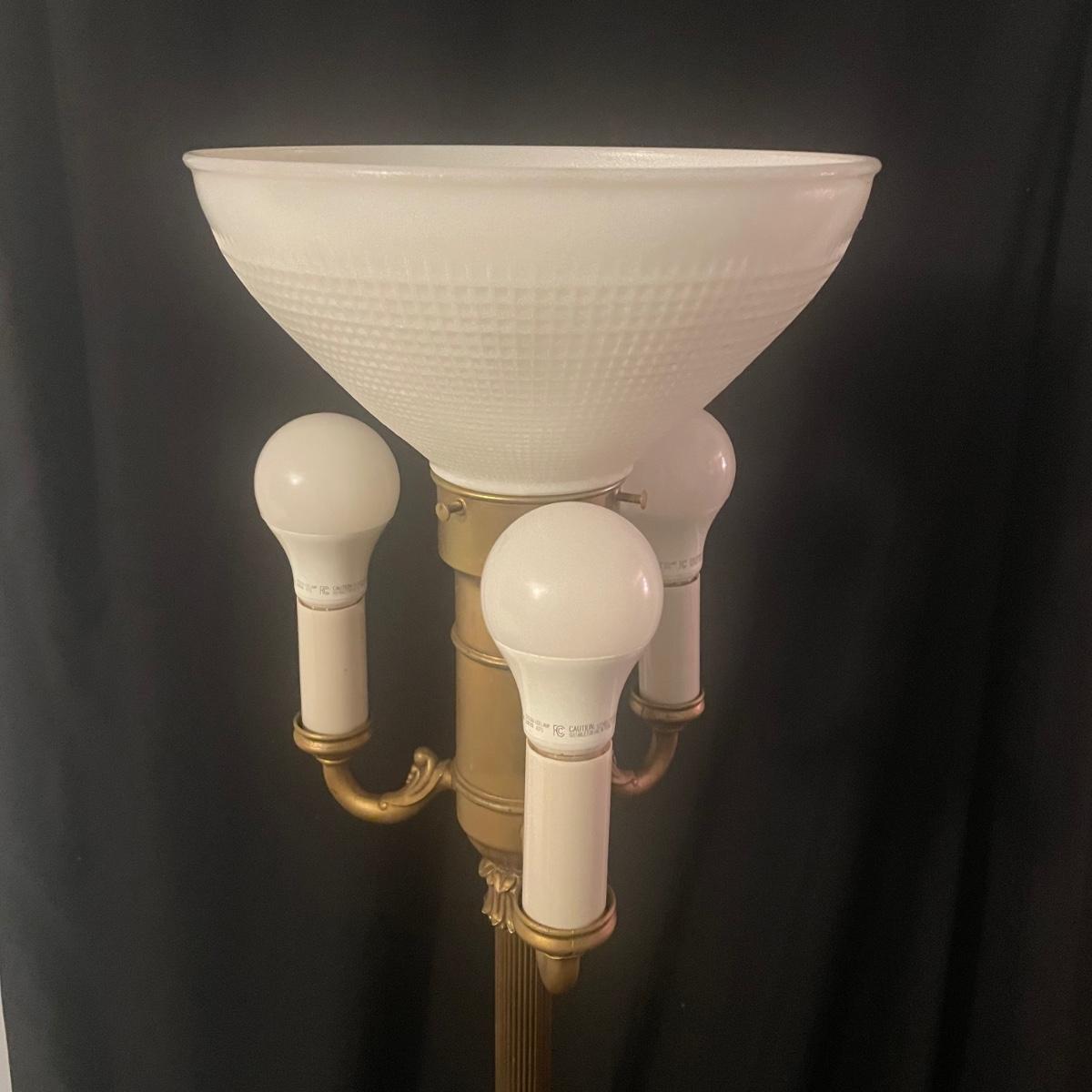 This elegant floor lamp offers many variations of brightness with its 4 bulbs. The main center light bulb has 3 levels of brightness and the smaller bulbs can all be on, just one or just two on at a time. The main bulb has a white glass shade, but this brass colored lamp also comes with a pretty 15” diameter shade for a softer light. The base of this lamp is metal and it has a marble-like stone accent.
