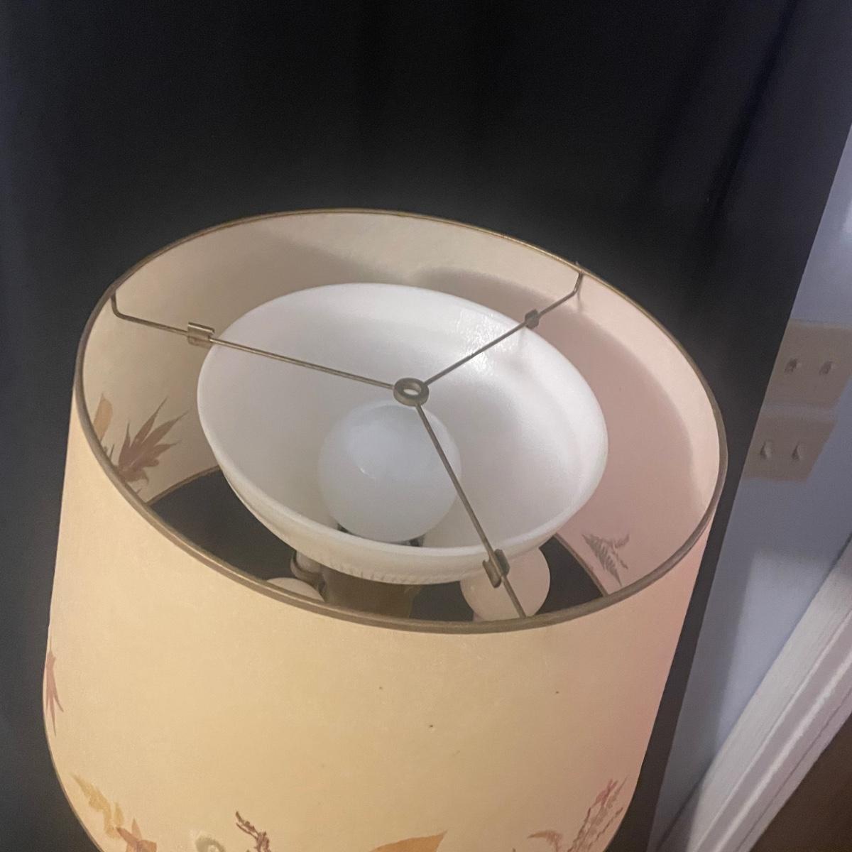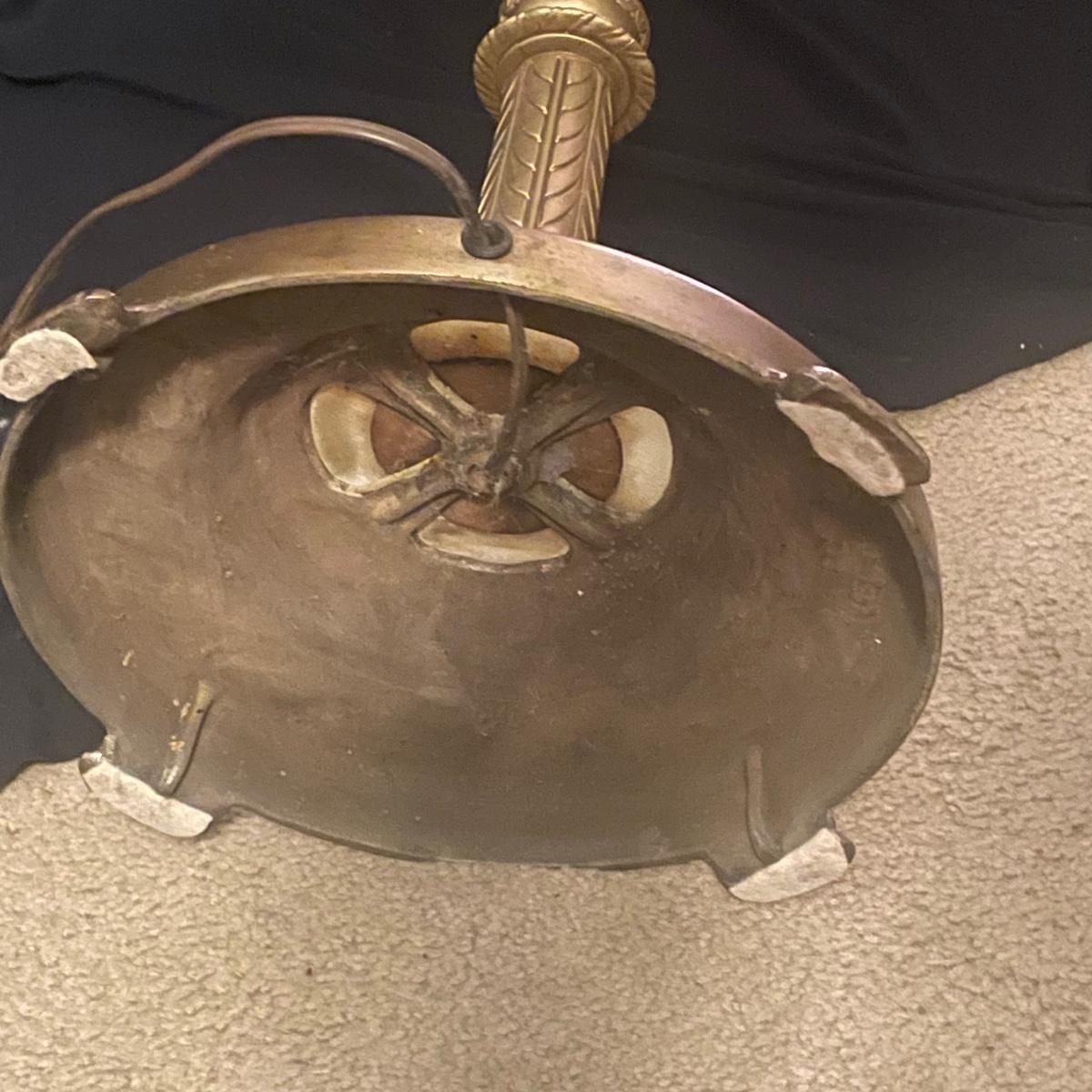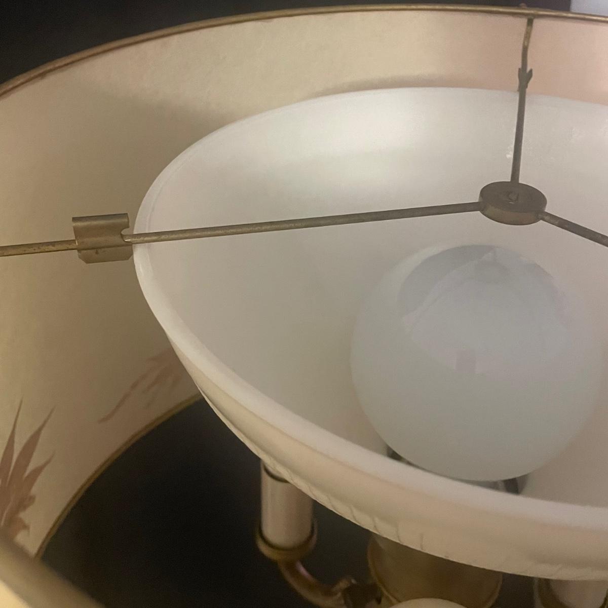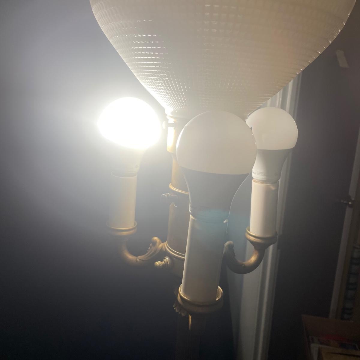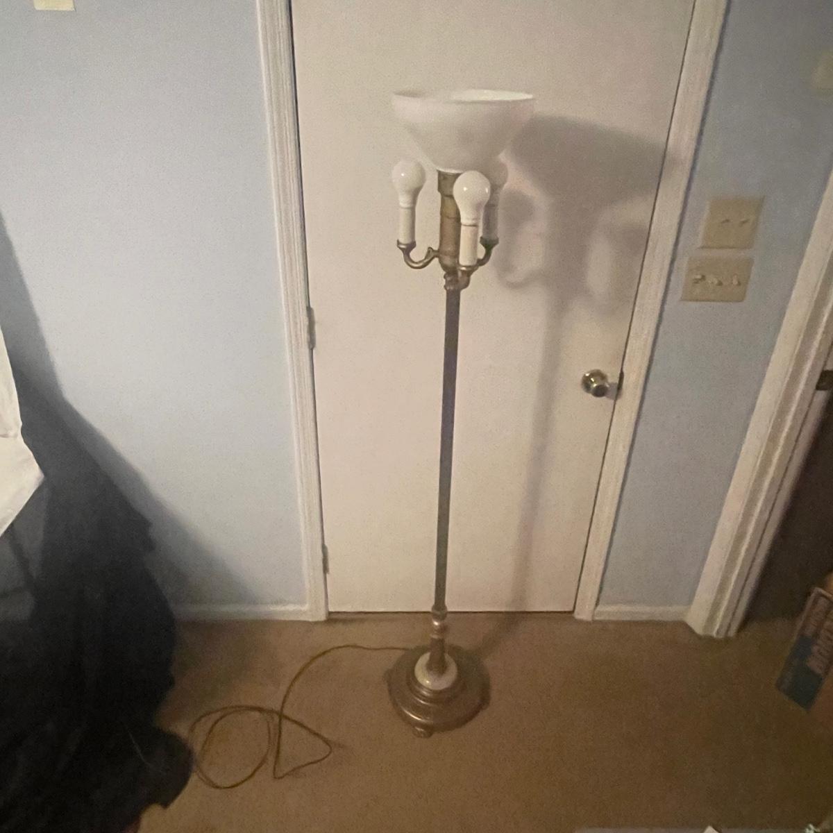 This elegant floor lamp offers many variations of brightness with its 4 bulbs. The main center light bulb has 3 levels of brightness and the smaller bulbs can all be on, just one or just two on at a time. The main bulb has a white glass shade, but this brass colored lamp also comes with a pretty 15” diameter shade for a softer light. The base of this lamp is metal and it has a marble-like stone accent.