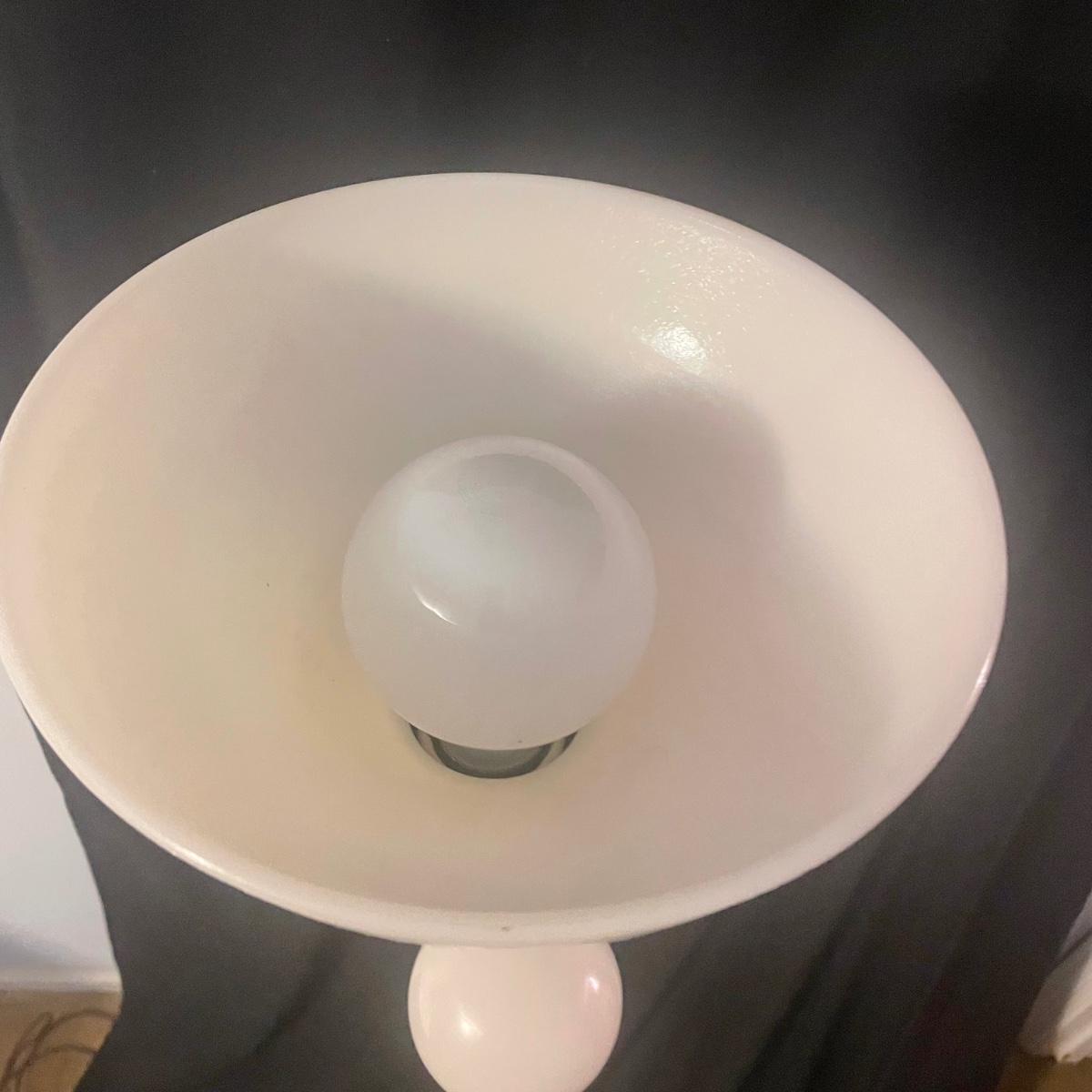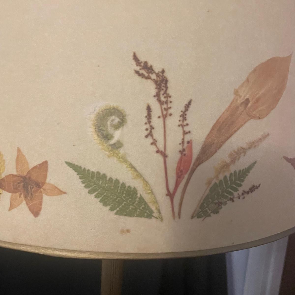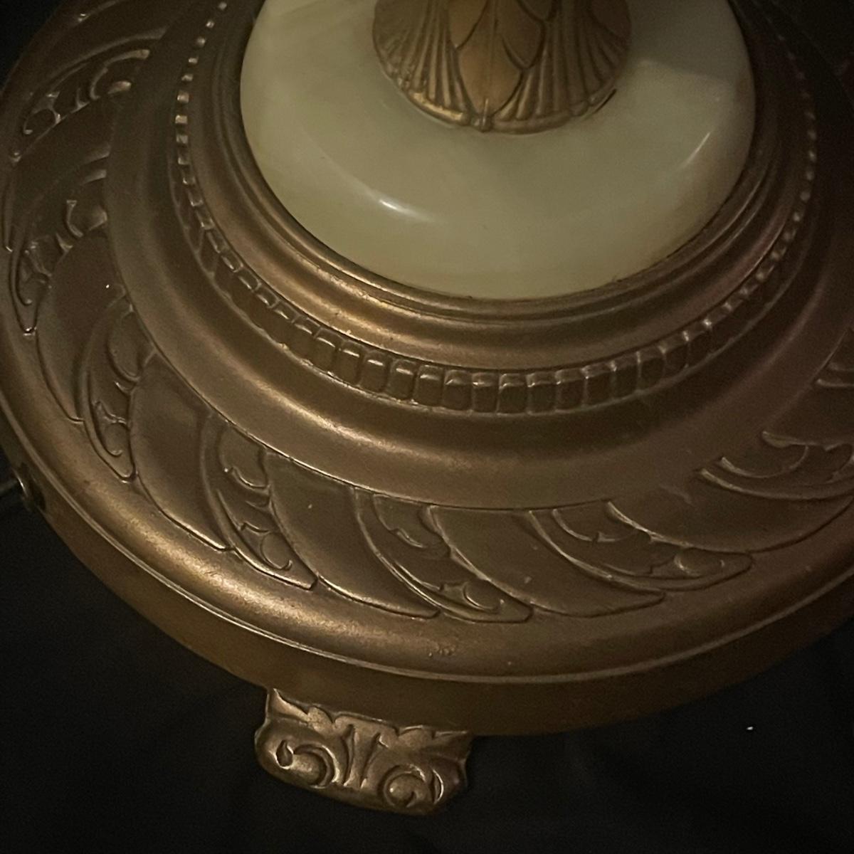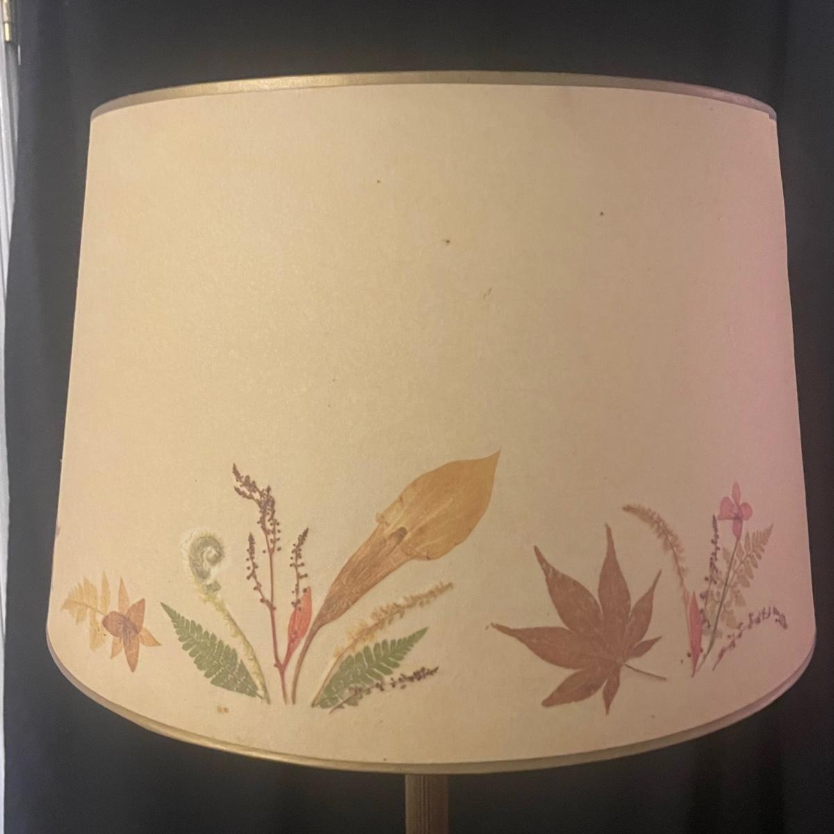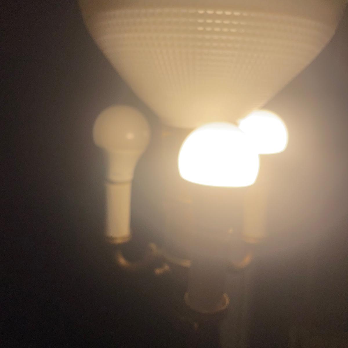 This elegant floor lamp offers many variations of brightness with its 4 bulbs. The main center light bulb has 3 levels of brightness and the smaller bulbs can all be on, just one or just two on at a time. The main bulb has a white glass shade, but this brass colored lamp also comes with a pretty 15” diameter shade for a softer light. The base of this lamp is metal and it has a marble-like stone accent.