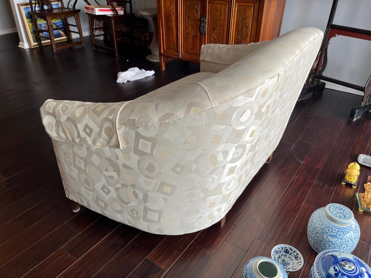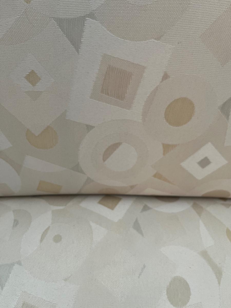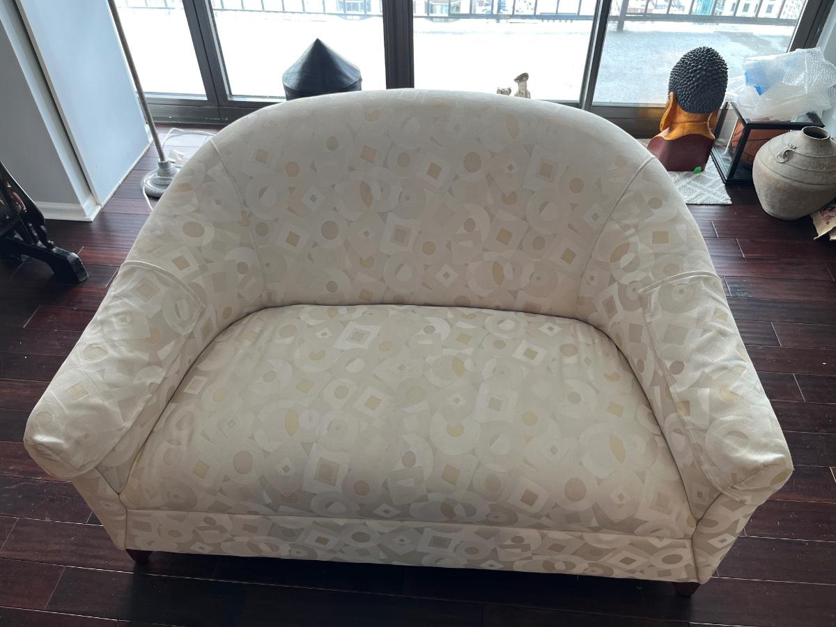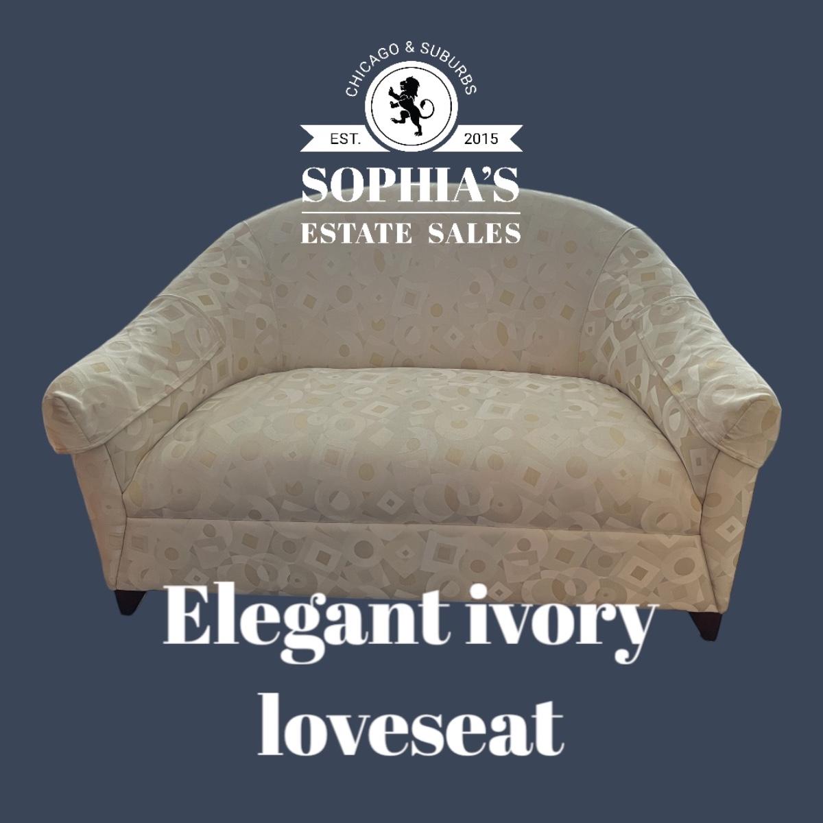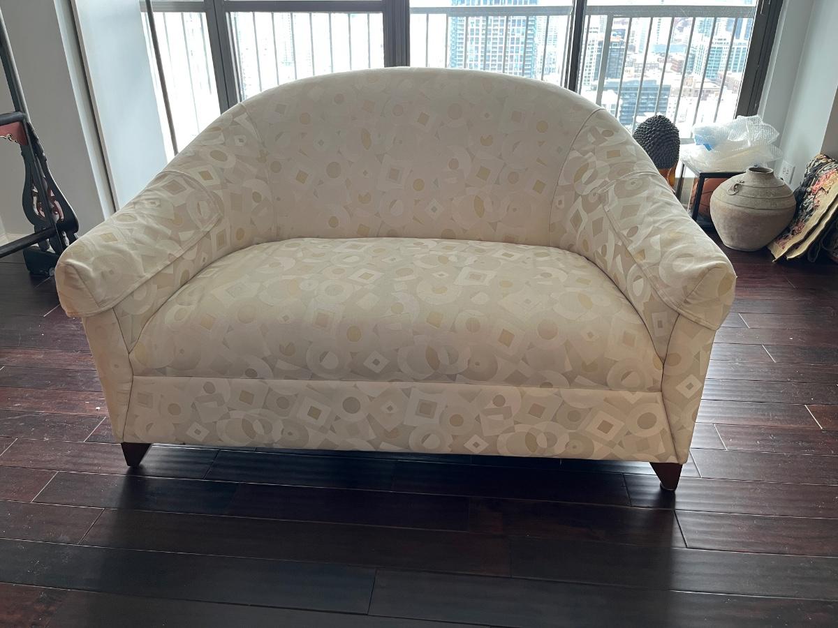 With an elegant rounded back, this loveseat is a great size and in beautiful condition. It comes from a smoke free, pet free, and child free home. It is covered in modern ivory on ivory damask with a geometric pattern. The manufacturer is unknown.