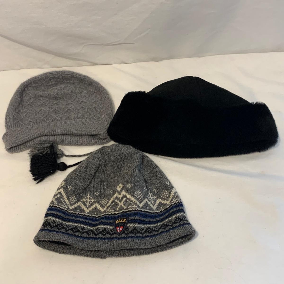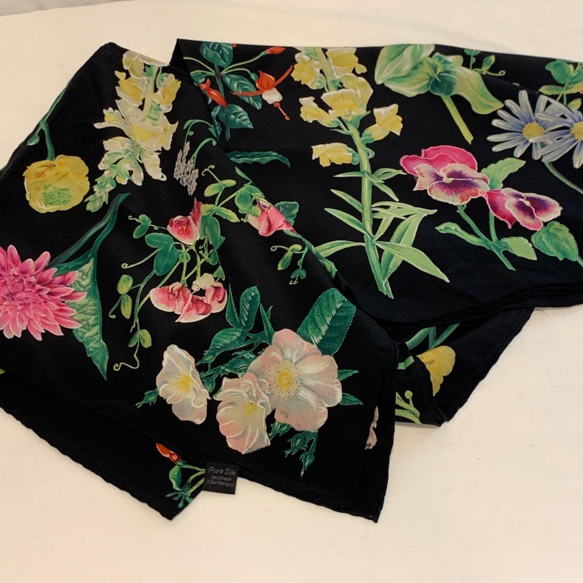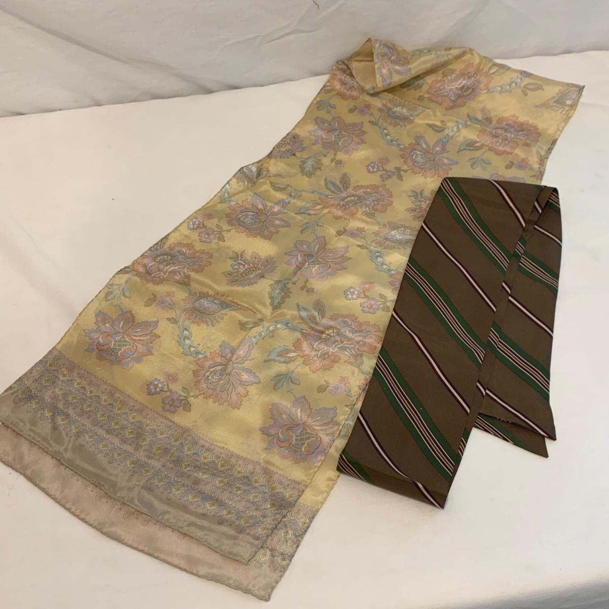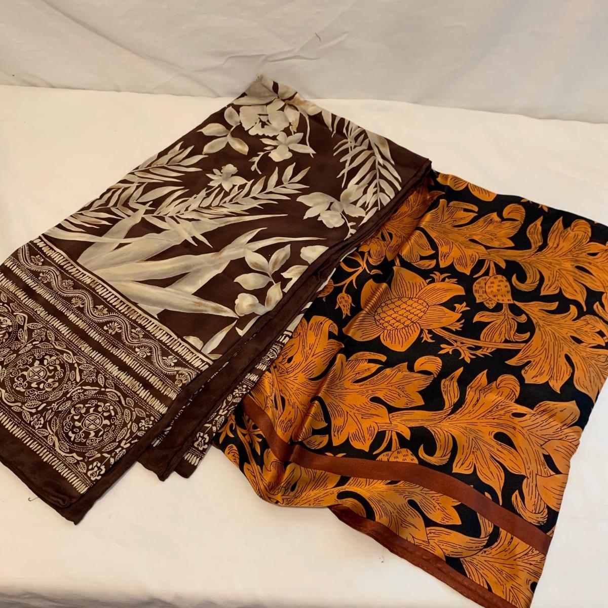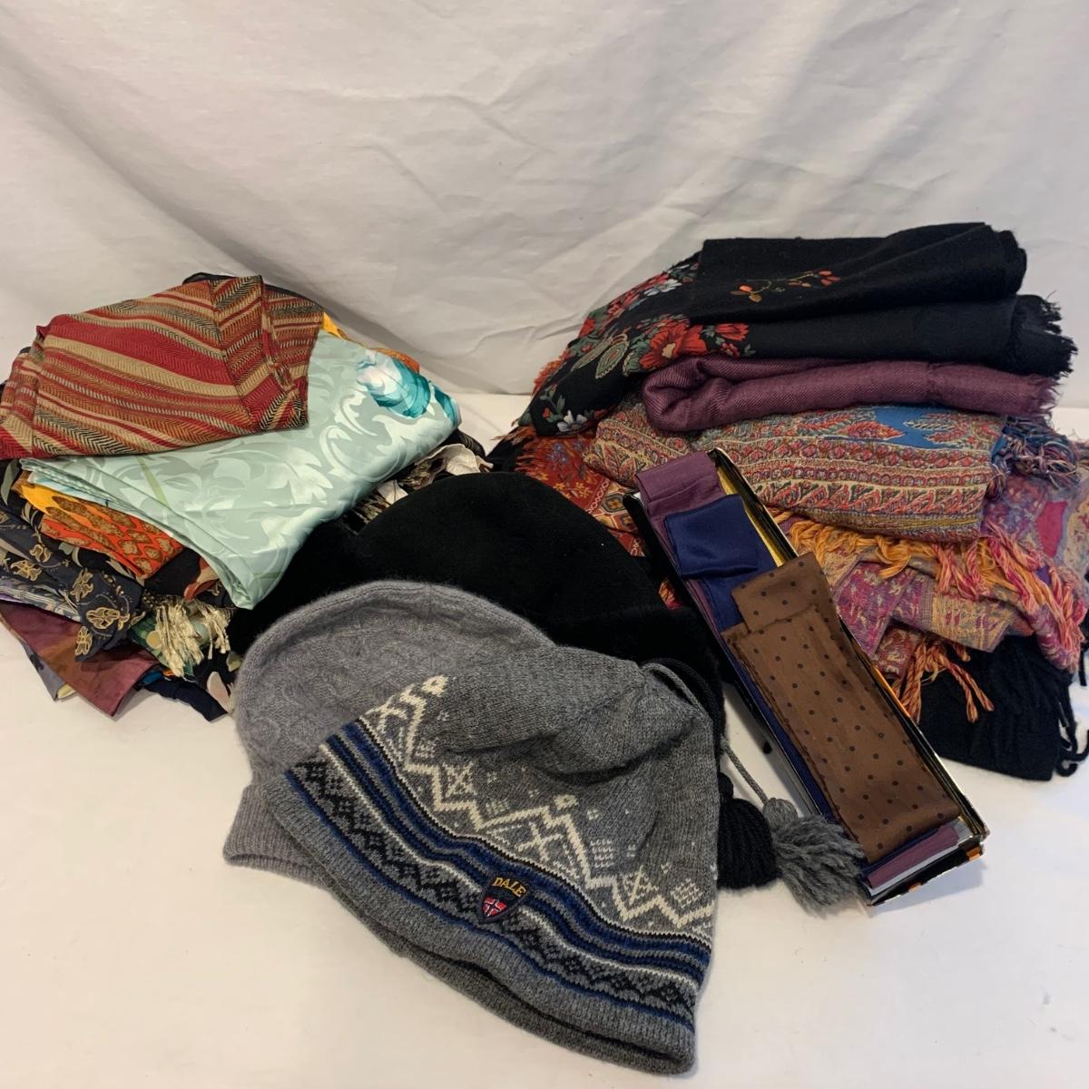 Approximately 40 Scarves, most of which are 100% silk and a couple are cashmere. They come in various shapes and sizes. Three warm hats are included as well, including one from Dale of Norway (note its small hole). Cacharel scarf has small stain and some edge blemishes. Please see photos for variety and brand labels.