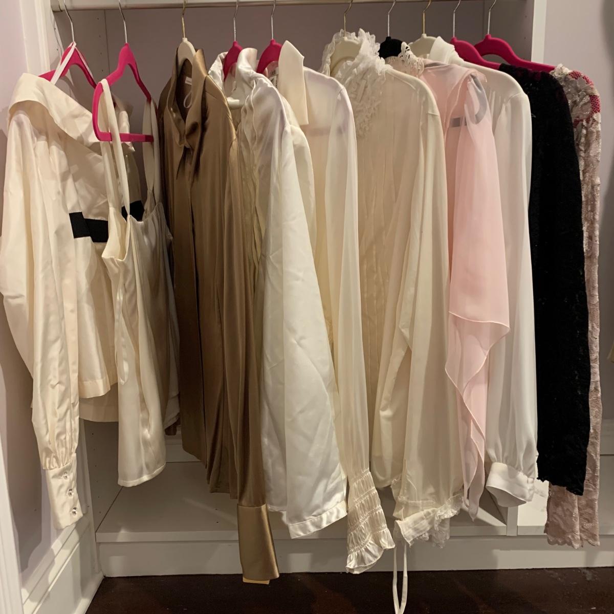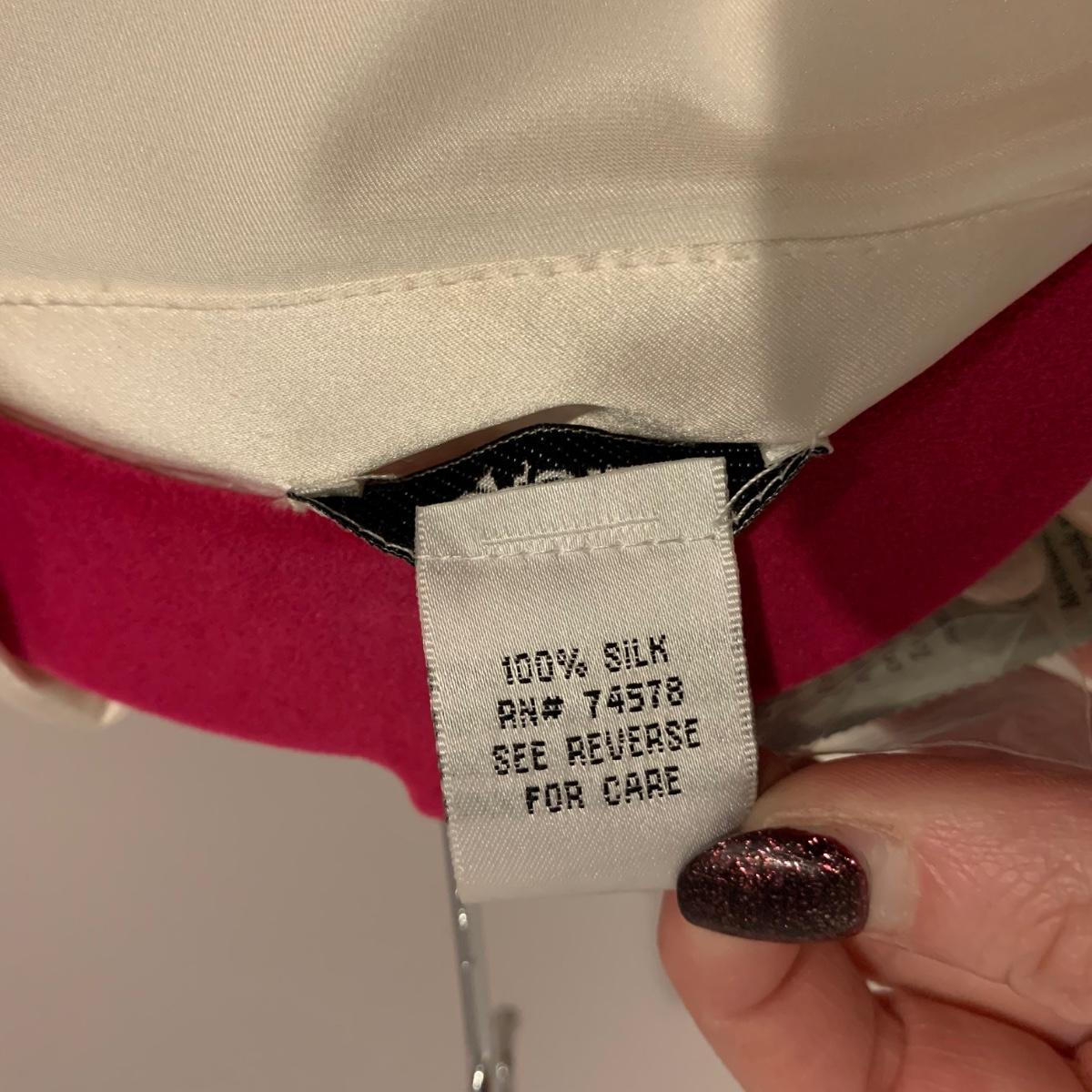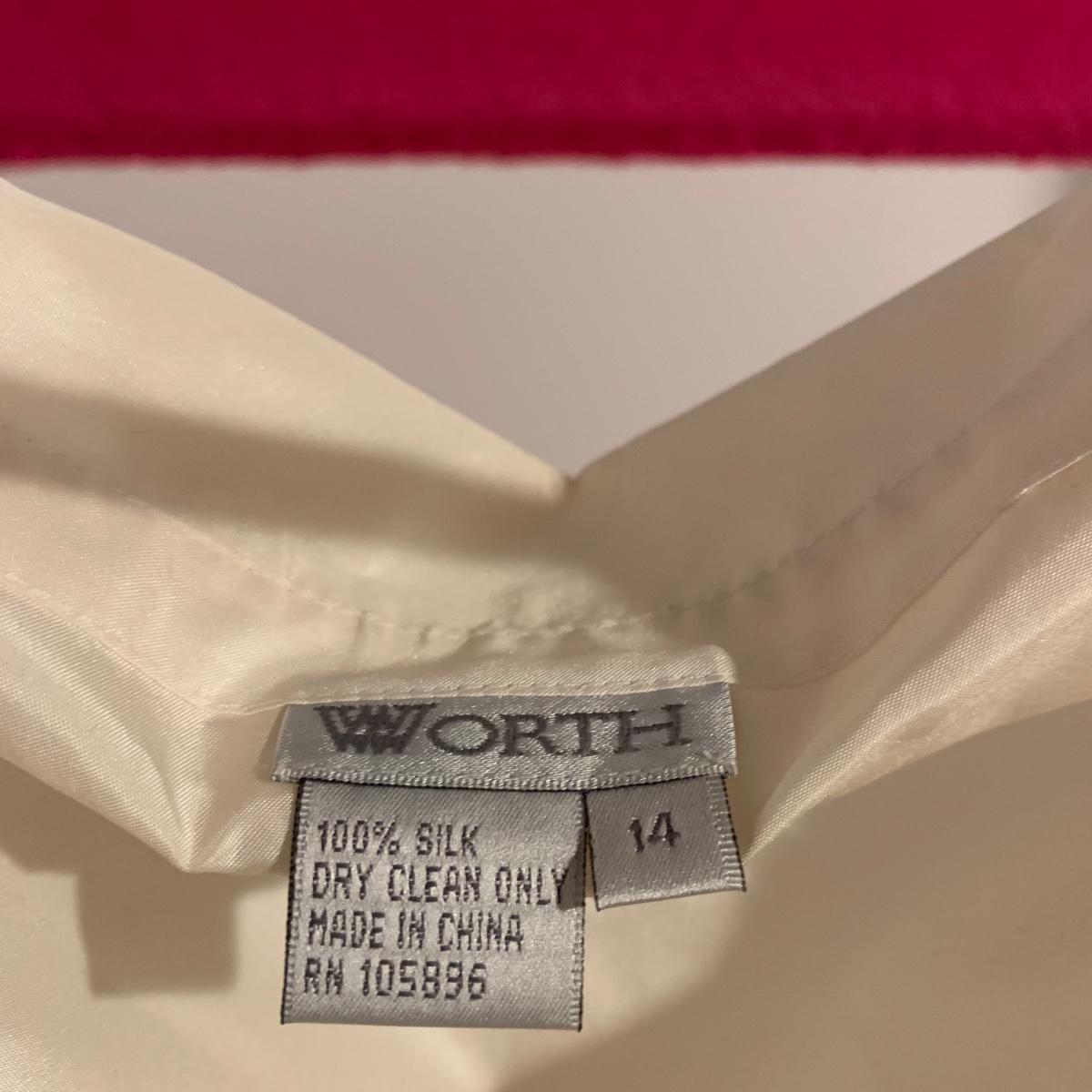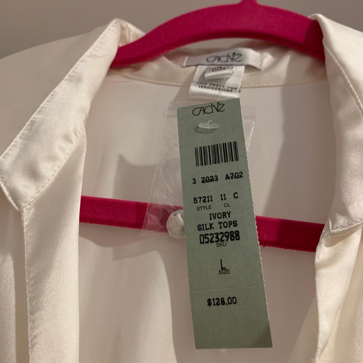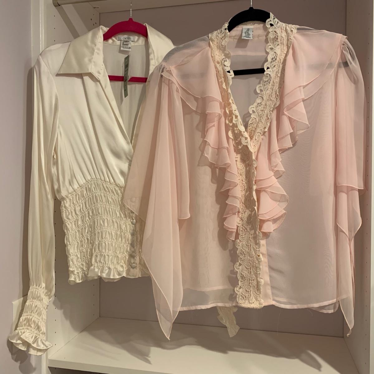 A collection of ten elegant and luxurious women’s tops made of silk, chiffon, and lace. Tops are size L-XL. There is a delicate baby pink top from Paris, a silk ivory top from Cache with its tag still attached, silk tops from Worth, International Concepts, Classiques Entier, and Talbots, and more.