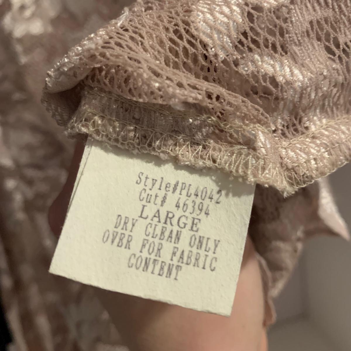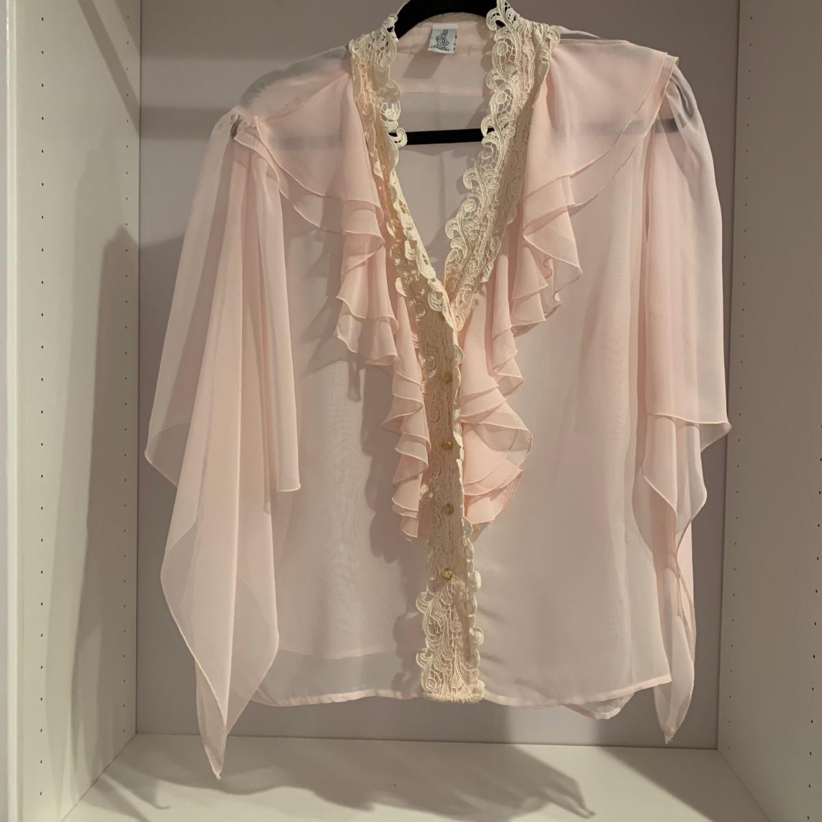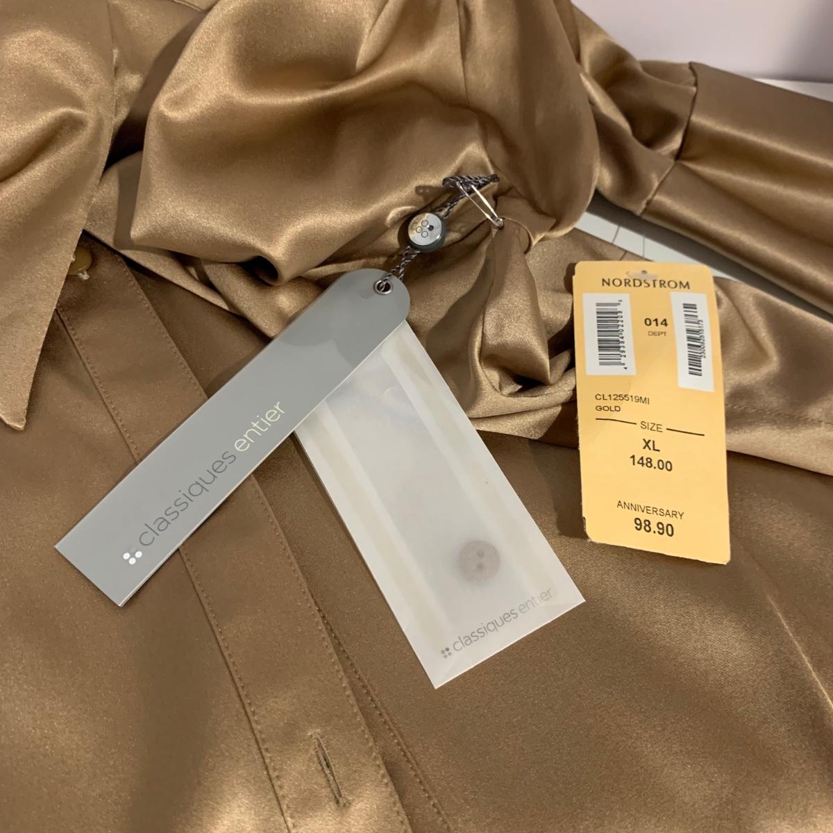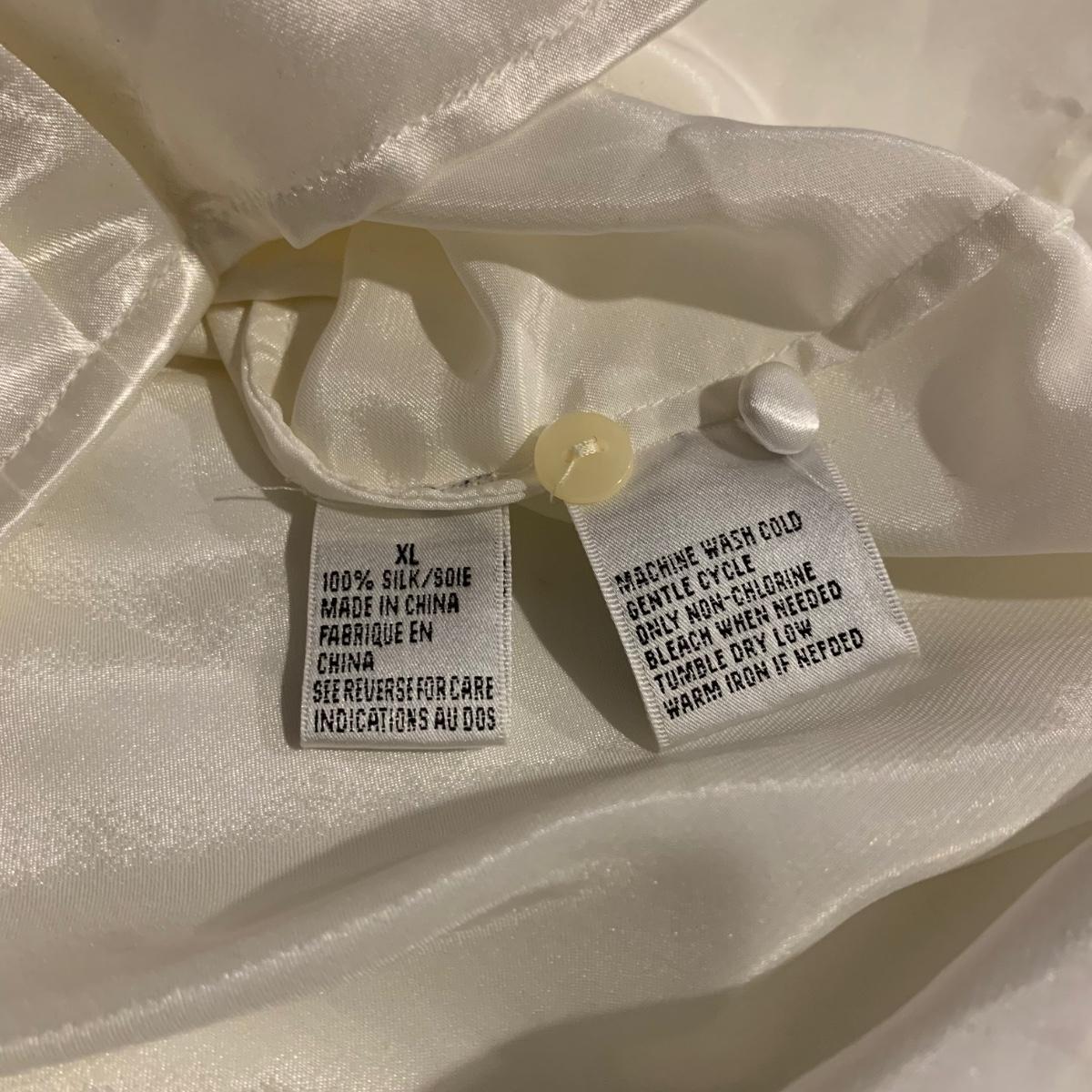 A collection of ten elegant and luxurious women’s tops made of silk, chiffon, and lace. Tops are size L-XL. There is a delicate baby pink top from Paris, a silk ivory top from Cache with its tag still attached, silk tops from Worth, International Concepts, Classiques Entier, and Talbots, and more.