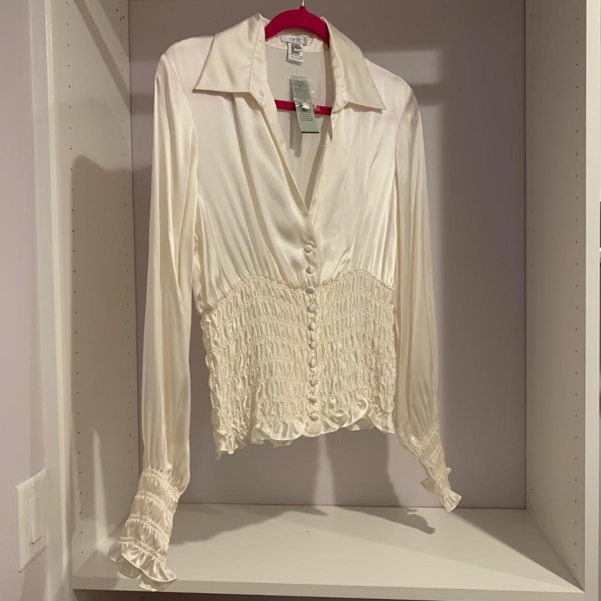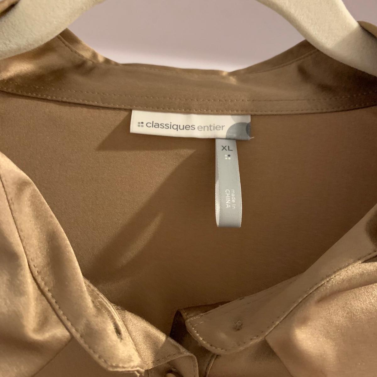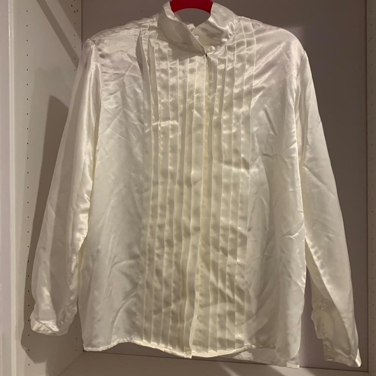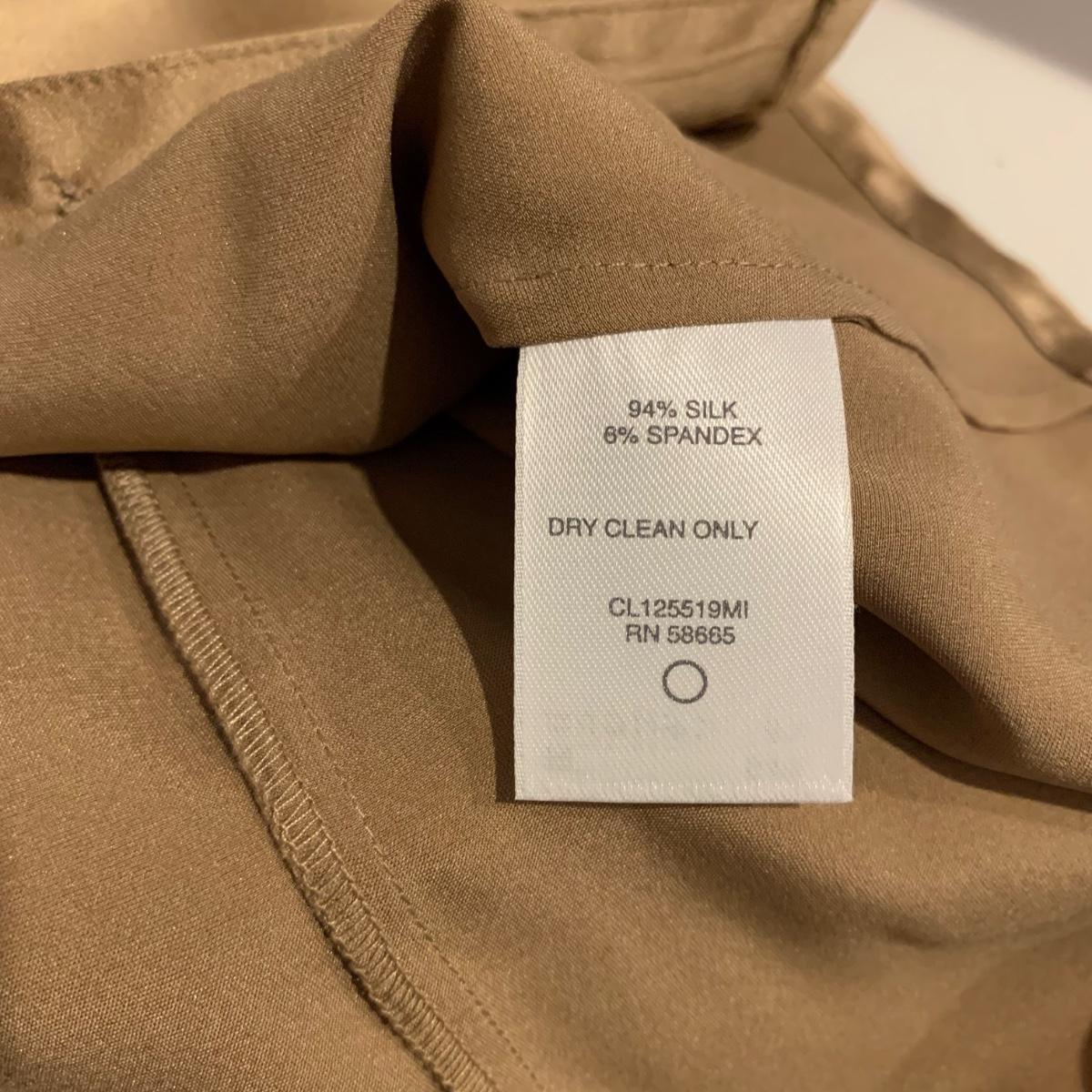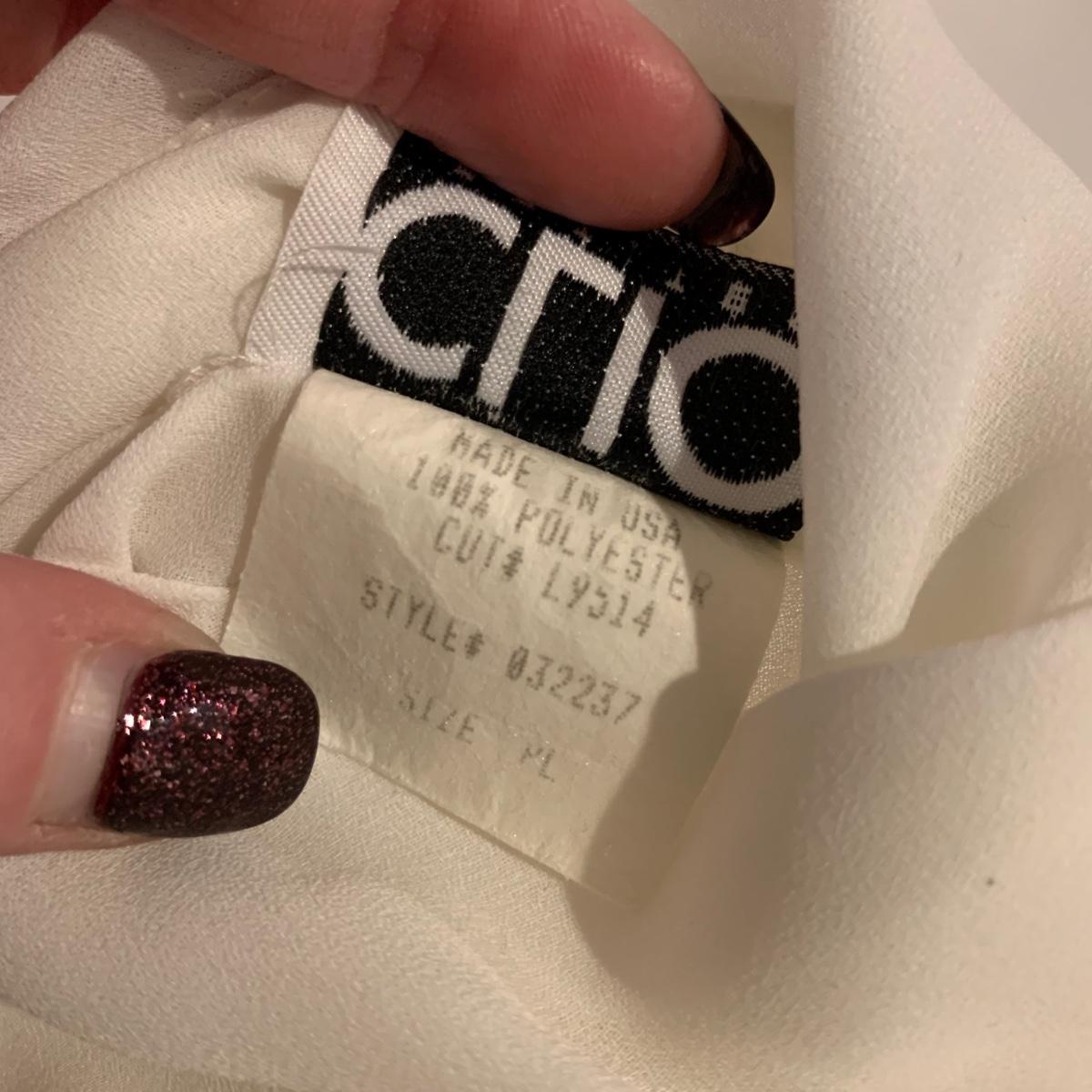 A collection of ten elegant and luxurious women’s tops made of silk, chiffon, and lace. Tops are size L-XL. There is a delicate baby pink top from Paris, a silk ivory top from Cache with its tag still attached, silk tops from Worth, International Concepts, Classiques Entier, and Talbots, and more.