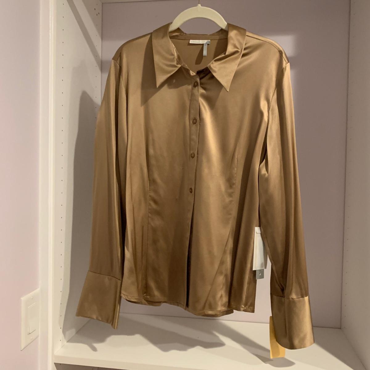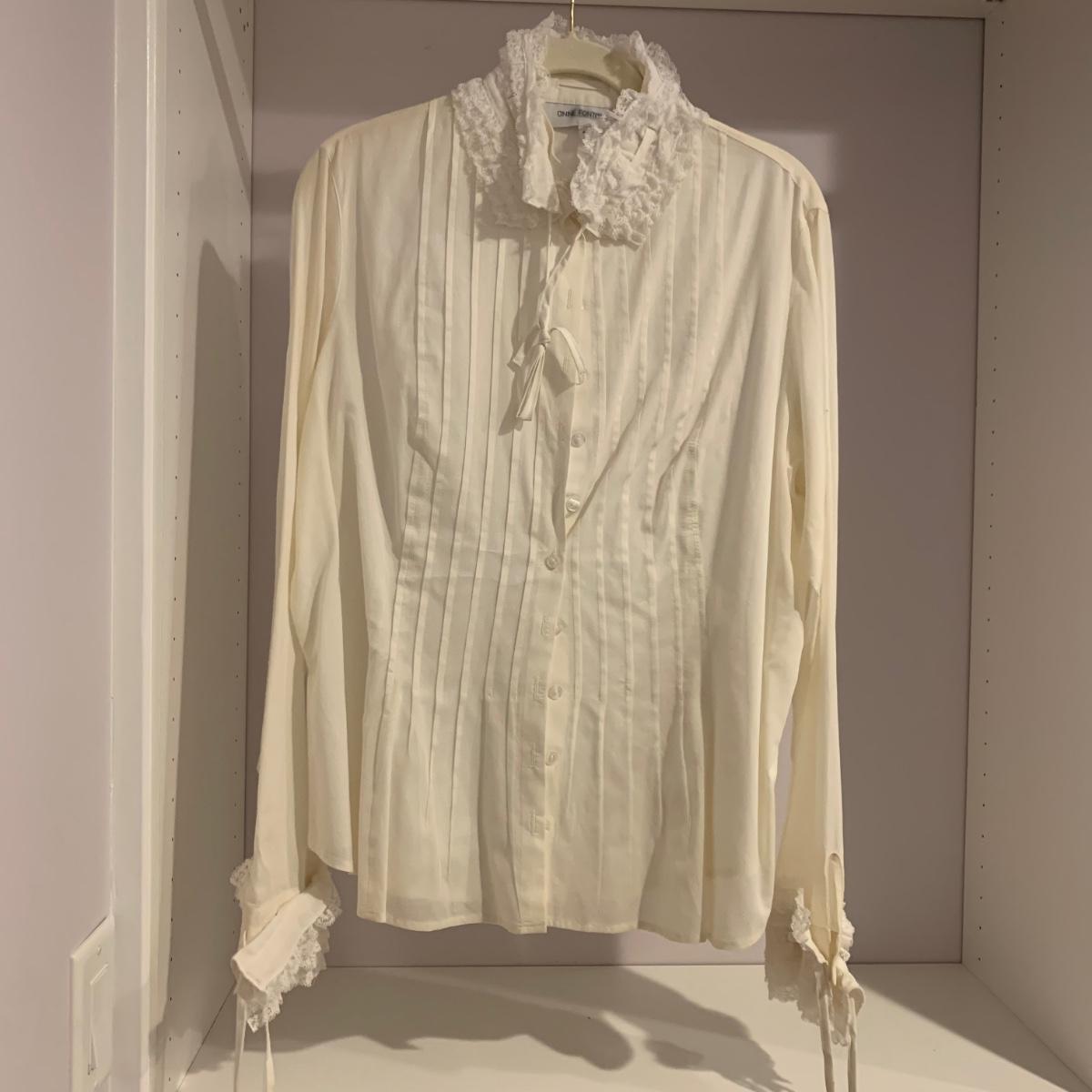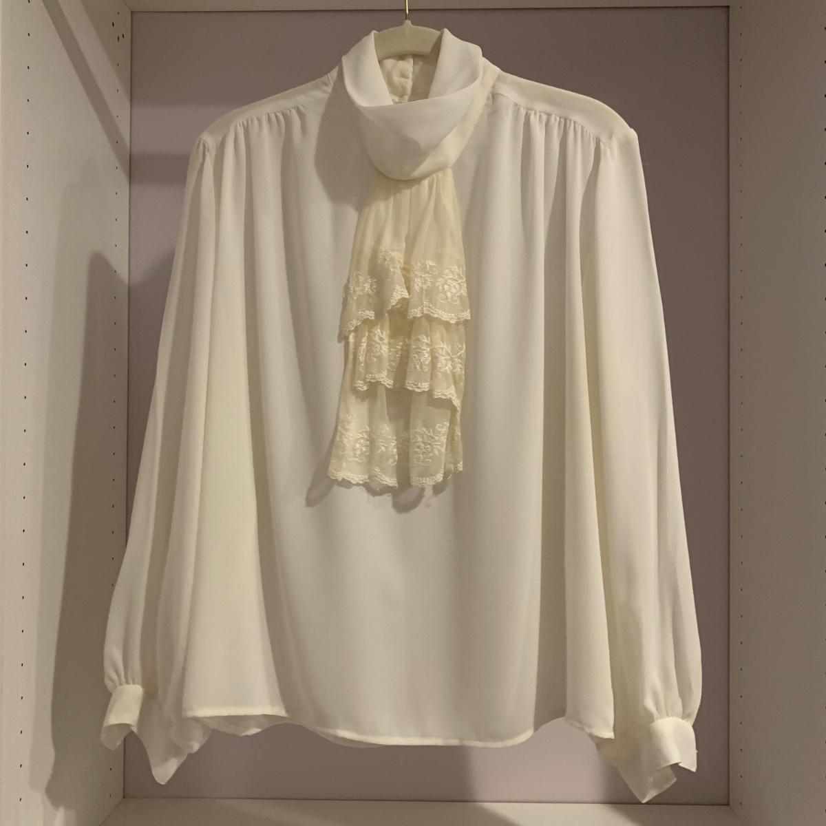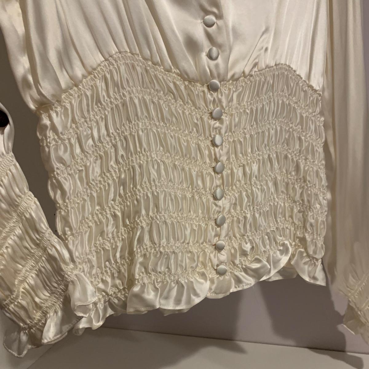 A collection of ten elegant and luxurious women’s tops made of silk, chiffon, and lace. Tops are size L-XL. There is a delicate baby pink top from Paris, a silk ivory top from Cache with its tag still attached, silk tops from Worth, International Concepts, Classiques Entier, and Talbots, and more.