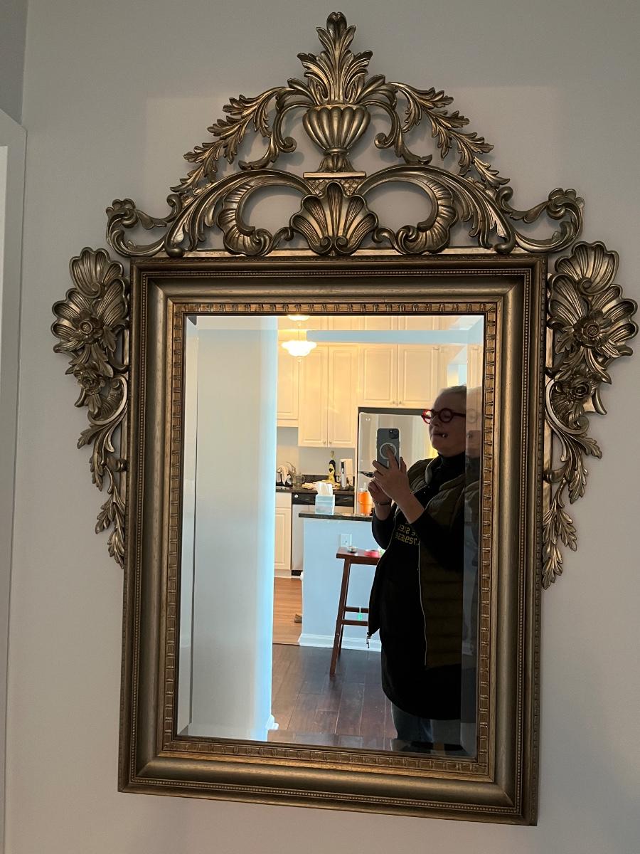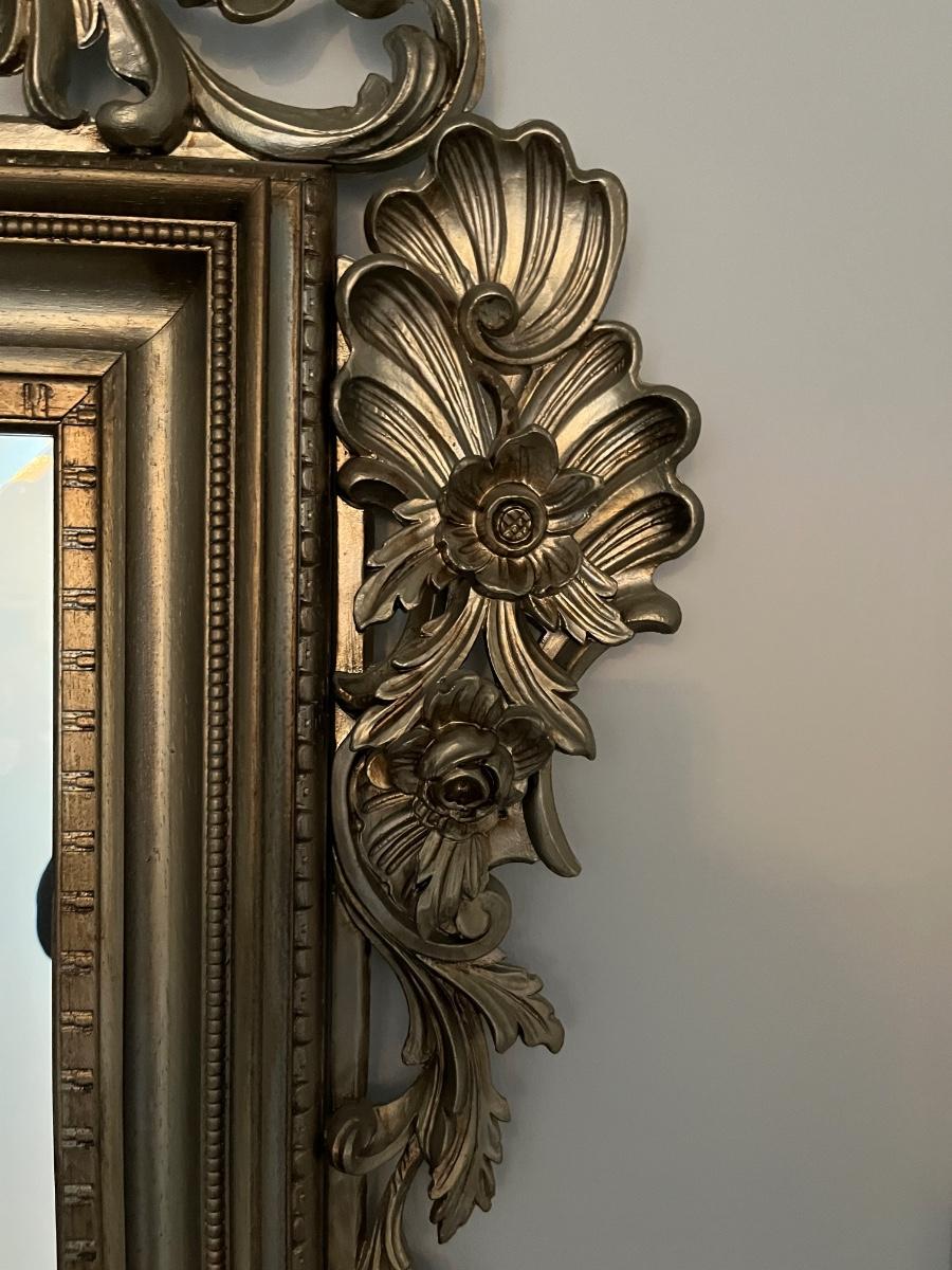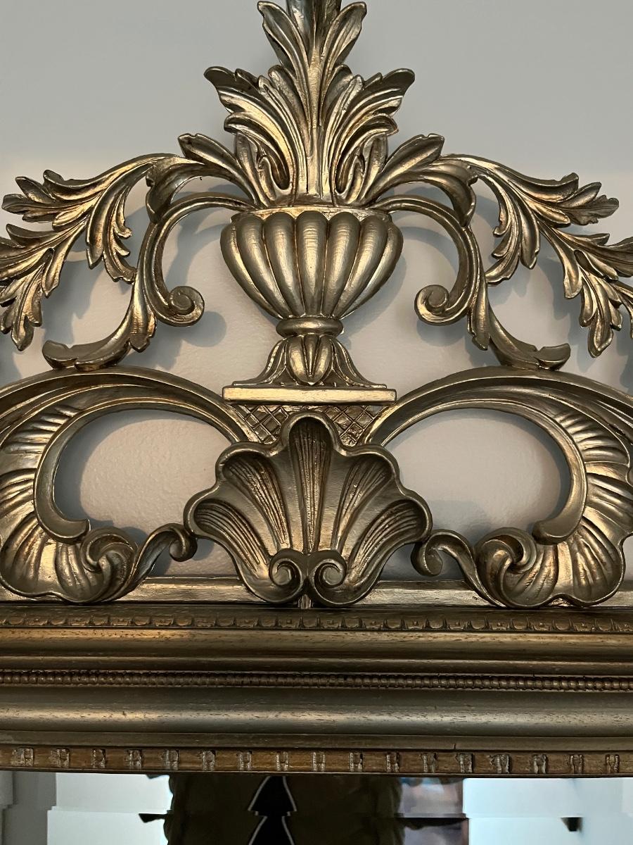 This is an elegant silver gilt mirror crowned with a scallop shell, urn, and scrolls. It is in excellent condition.